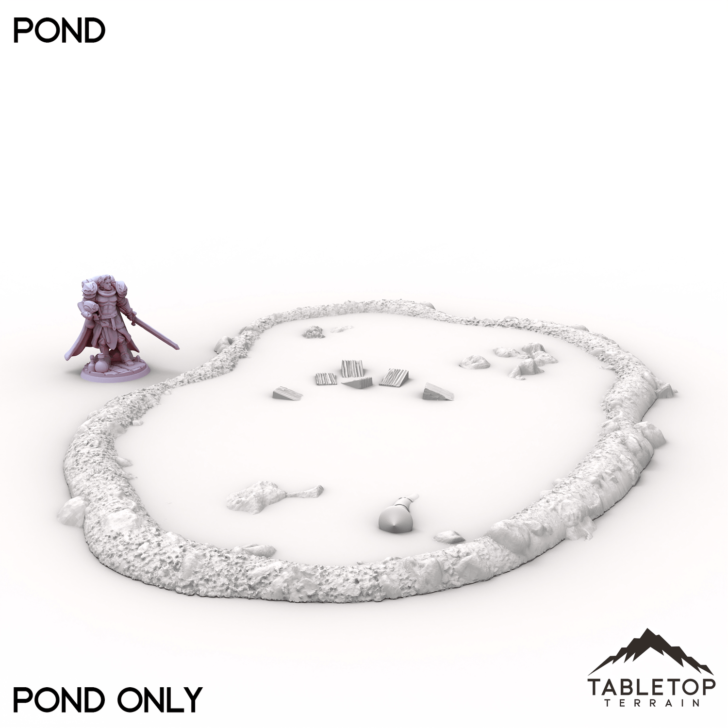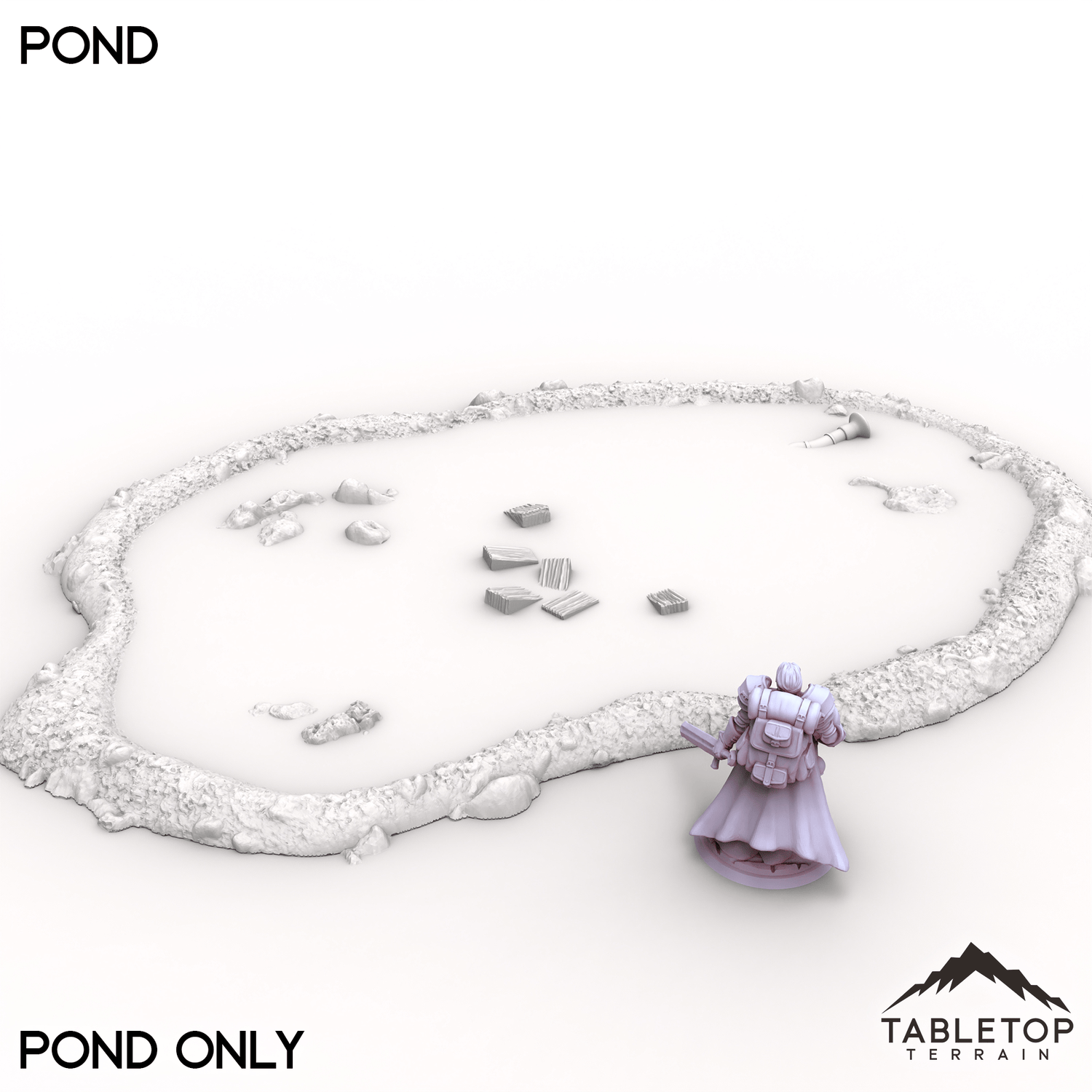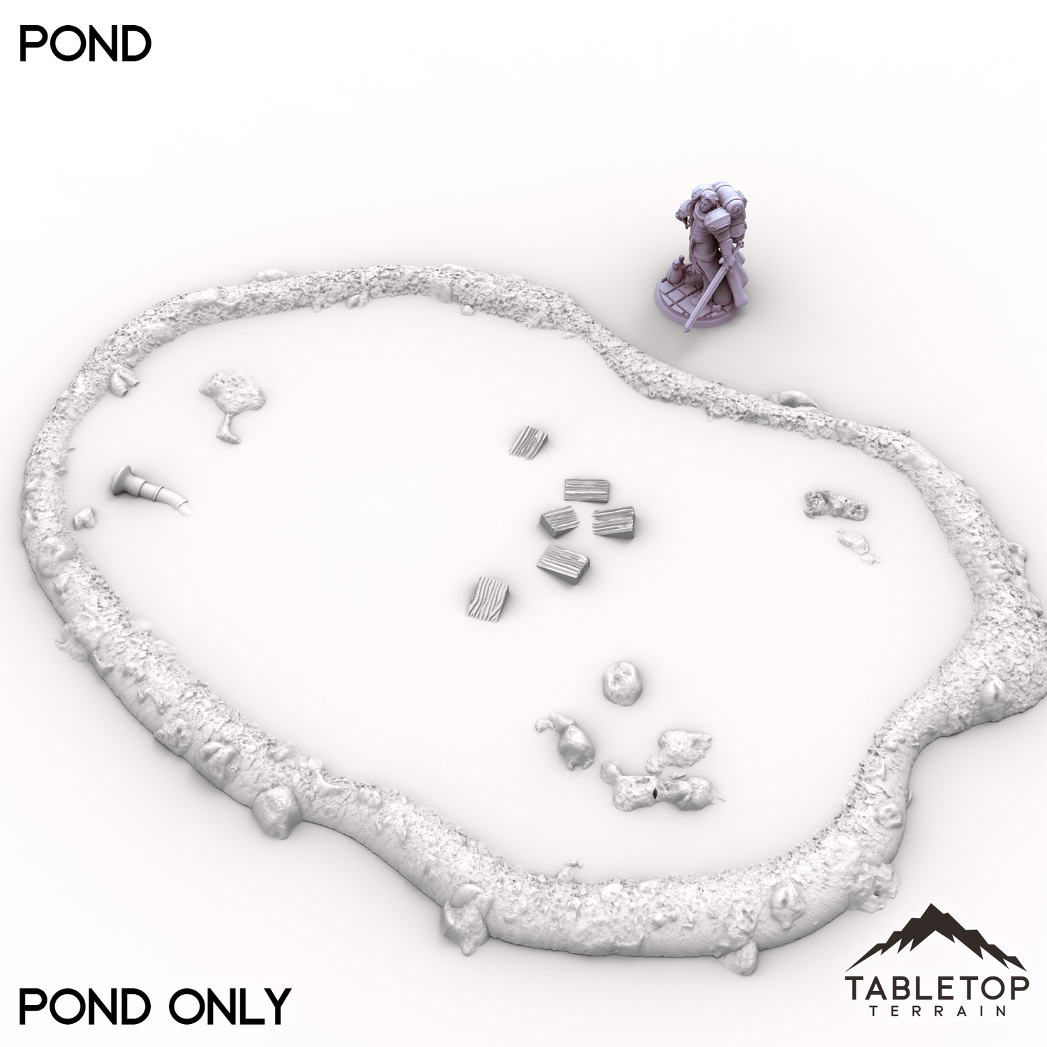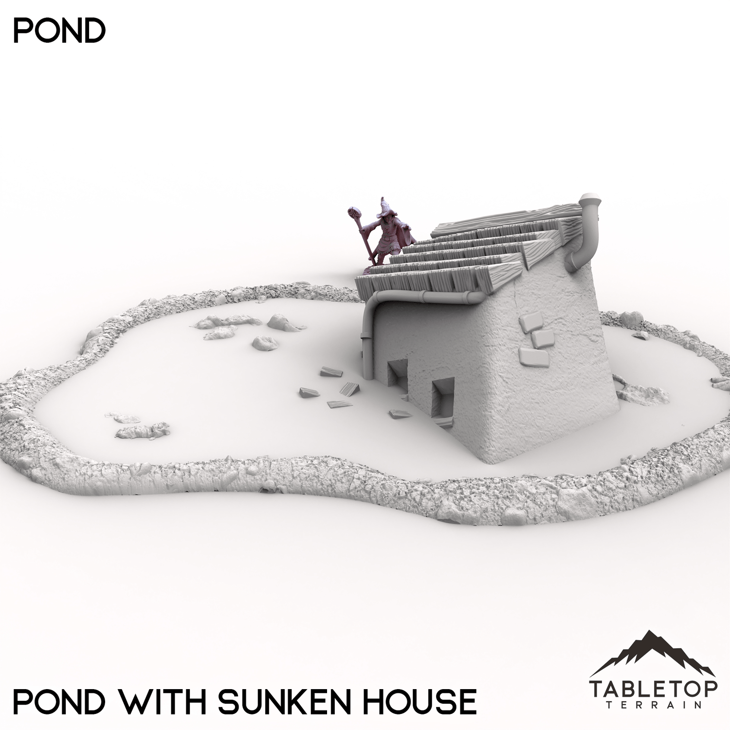 This murky Pond, part of the Vexed Village set, is littered with bricks, fallen chimneys and other debris. The crumbling ruins of a fallen house round out the scene. A great centerpiece for the Vexed Village set, perfect for hinting at waterlogged witchcraft.