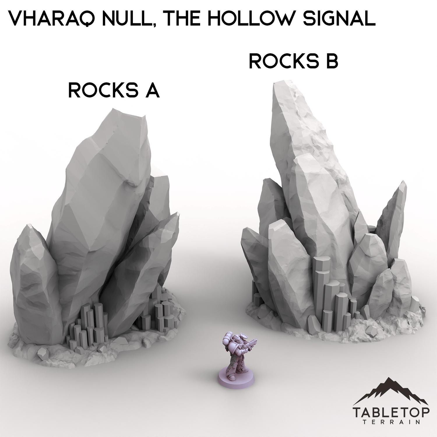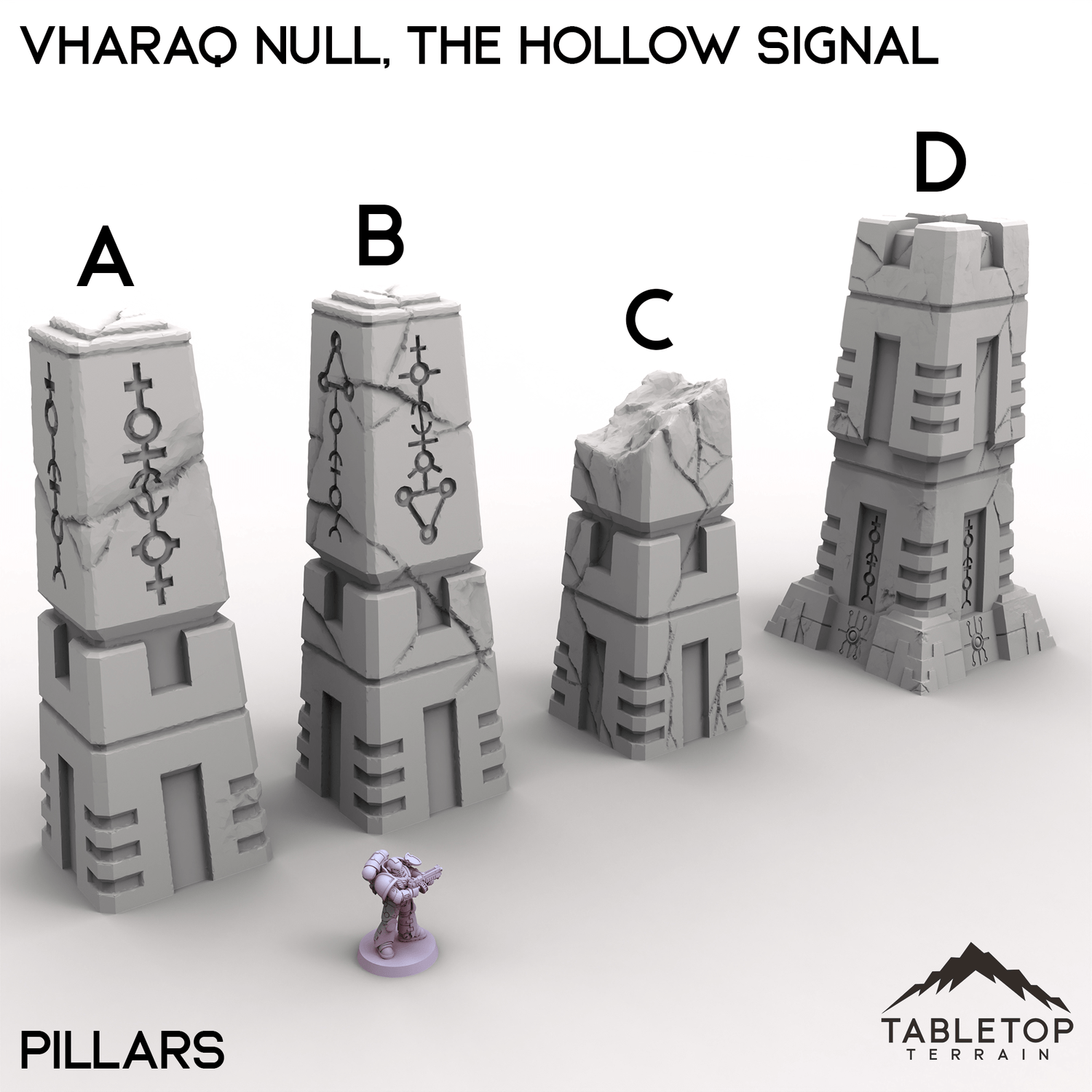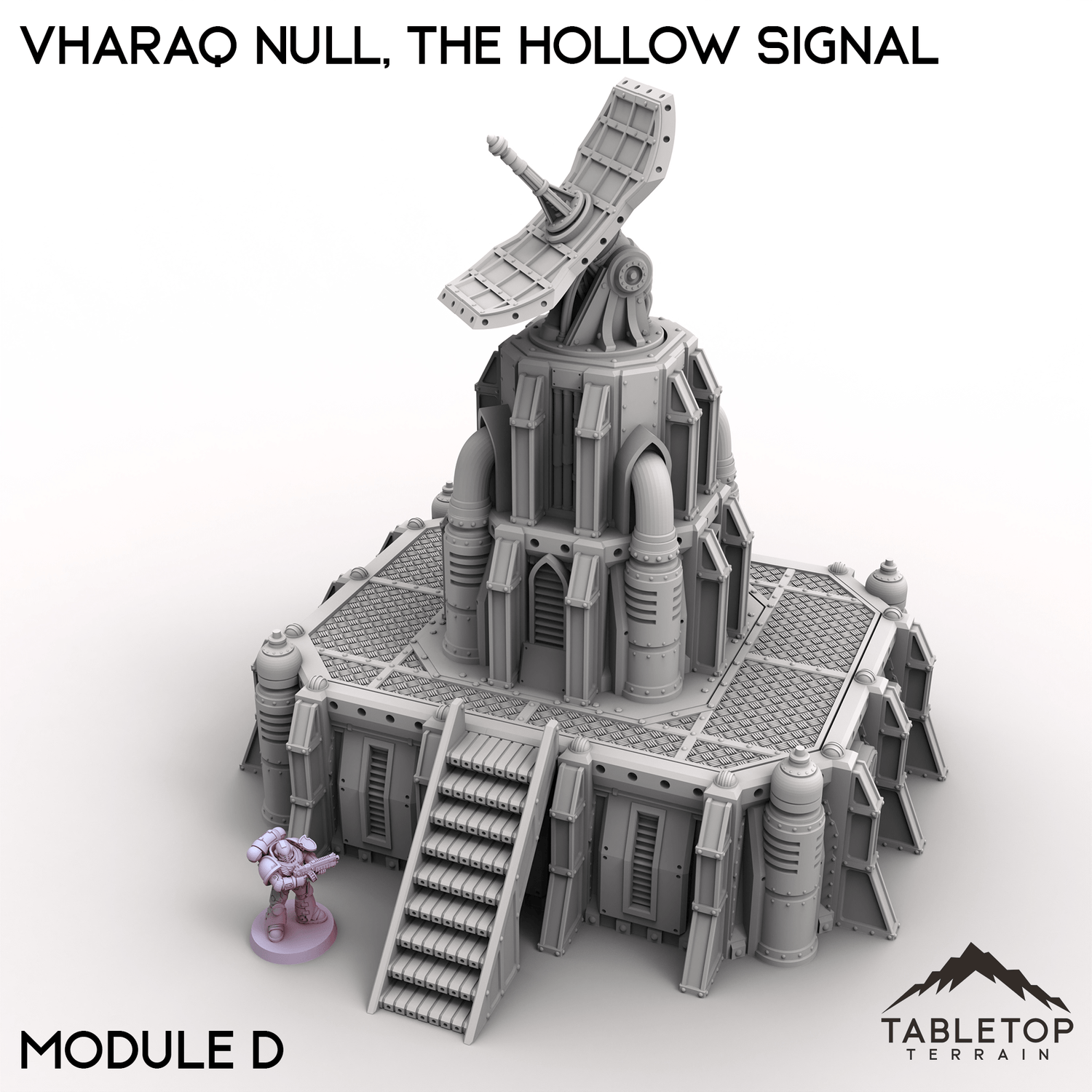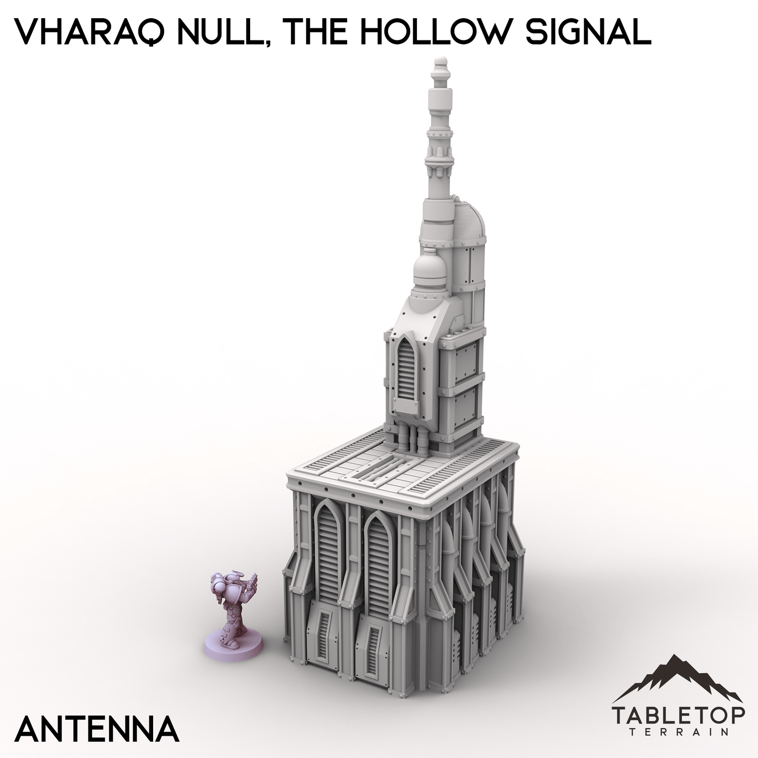 Vharaq Null pulses with eerie silence and cryptic transmissions. This terrain set includes ancient antenna, alien monoliths inscribed with arcane glyphs, industrial power stations, and otherworldly pillars. Ideal for sci-fi skirmishes, narrative missions, or as a mysterious location in any wargaming campaign.
