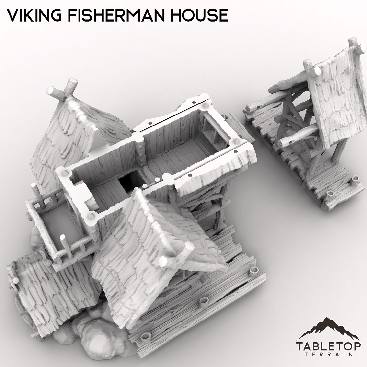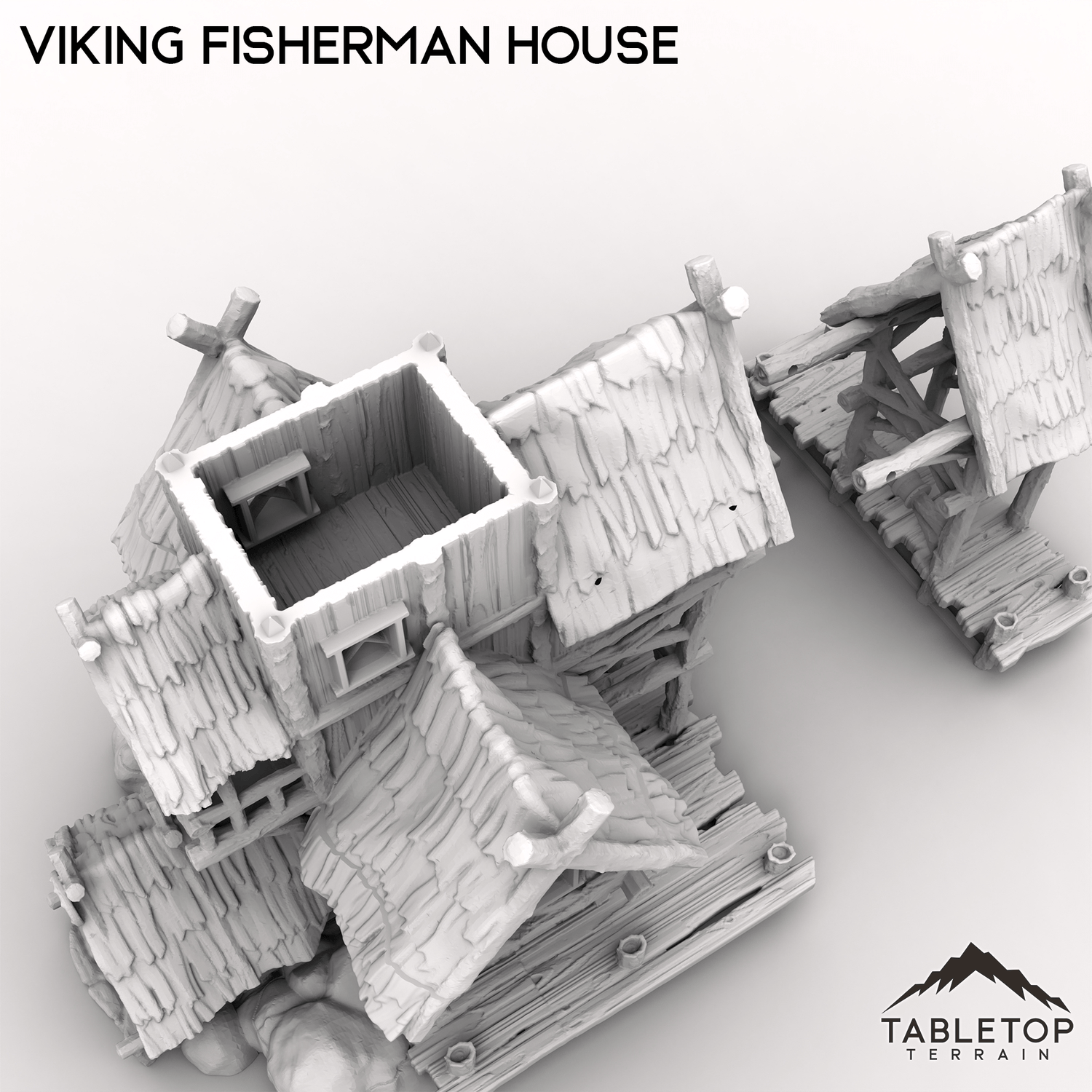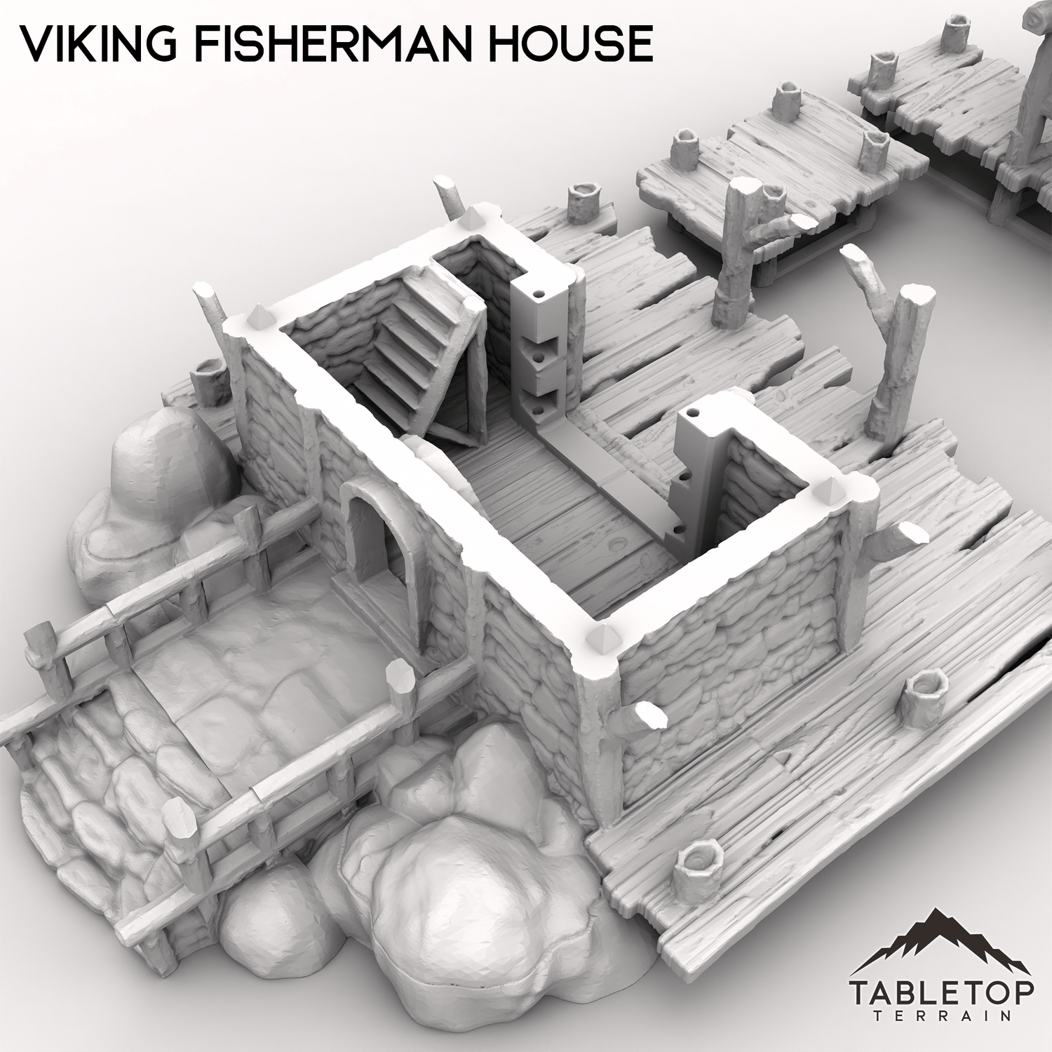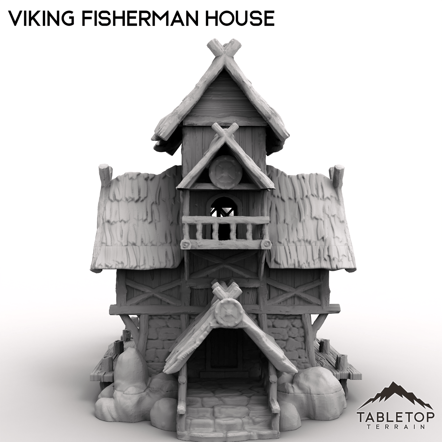 The Viking Fisherman House is a multi-story house, made from rough wood and stone, resting on the water's waves. Attached is a small dock with a perched roof to protect from the weather. Pair this set with one of our many boats, and make a great addition to any tabletop setup!