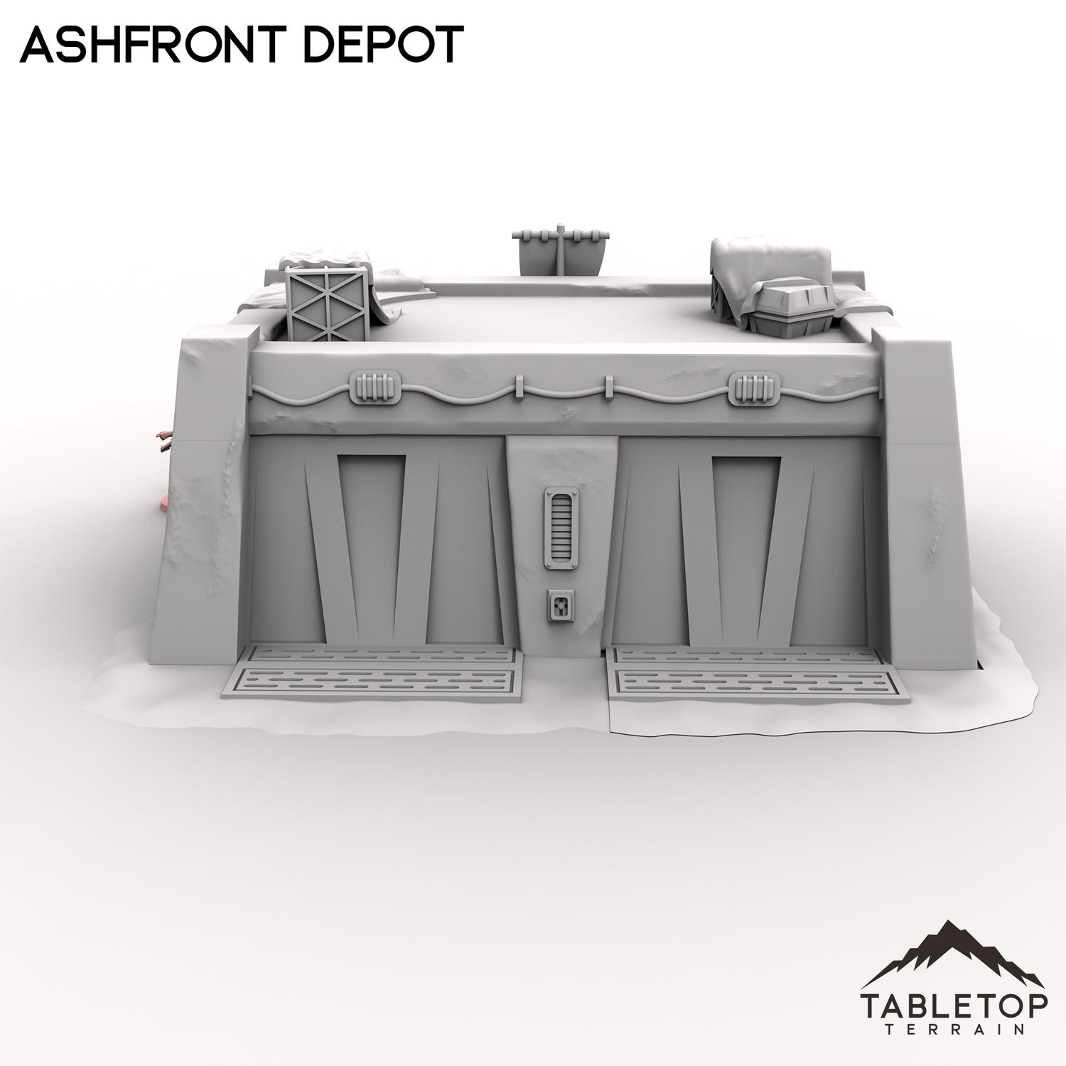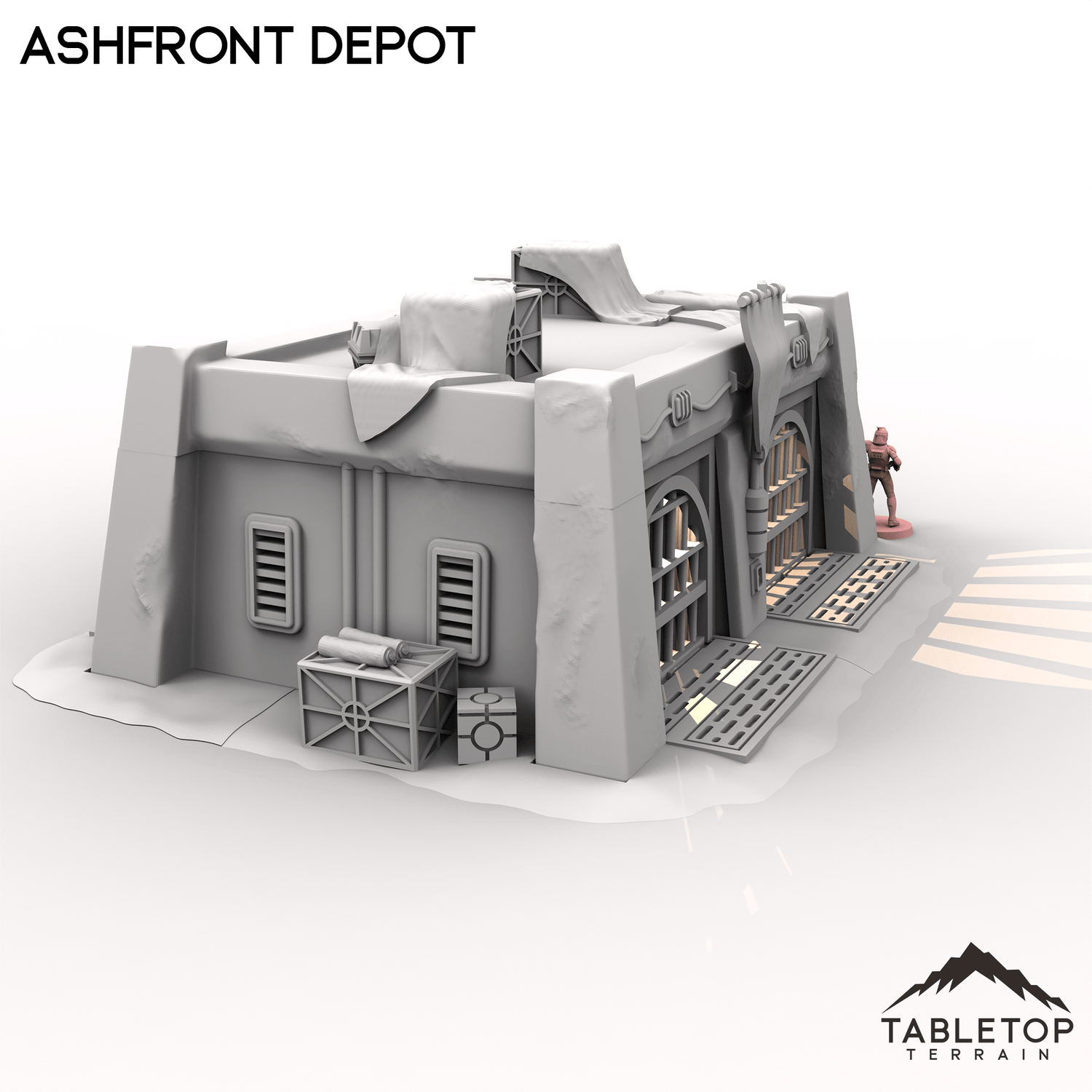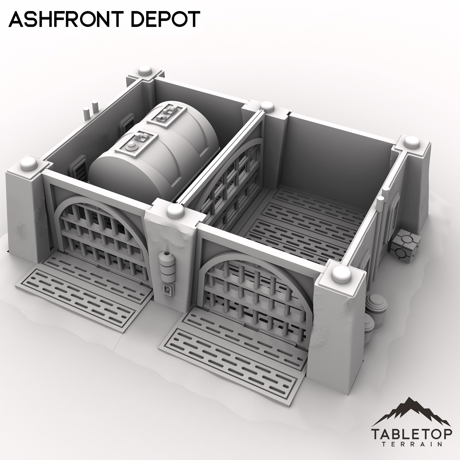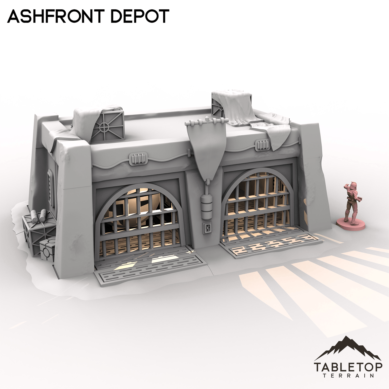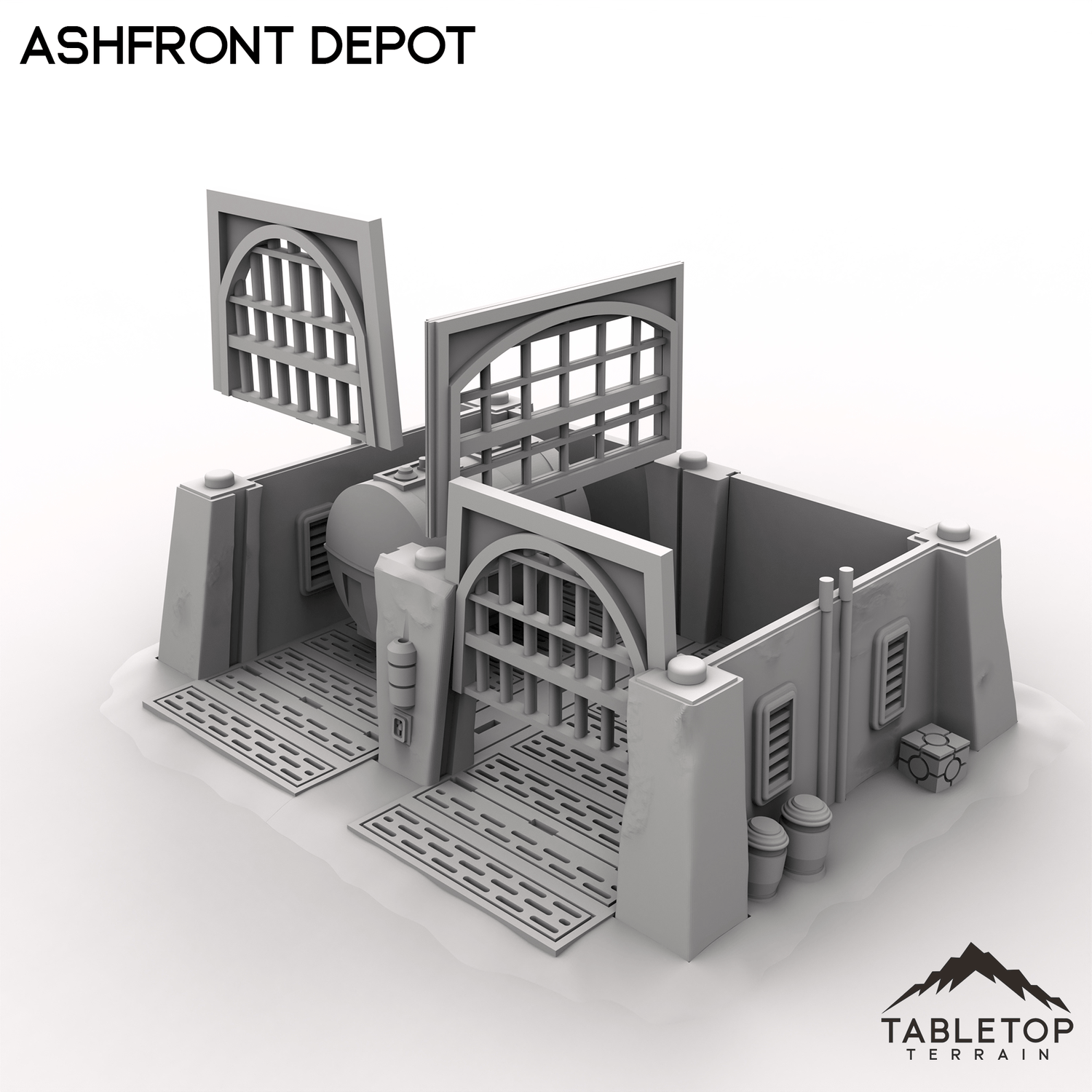 The Ashfront Depot is a single-story storage unit, with removable gates with a large tanker inside. The flag on the front of the building is removable, as is the gate-wall in the center which divides the two sides. The Nomad's Sanctuary sets are all perfect for sci-fi games, cyberpunk tabletops, or desert outposts. Each building is made to be easy to setup and paint.