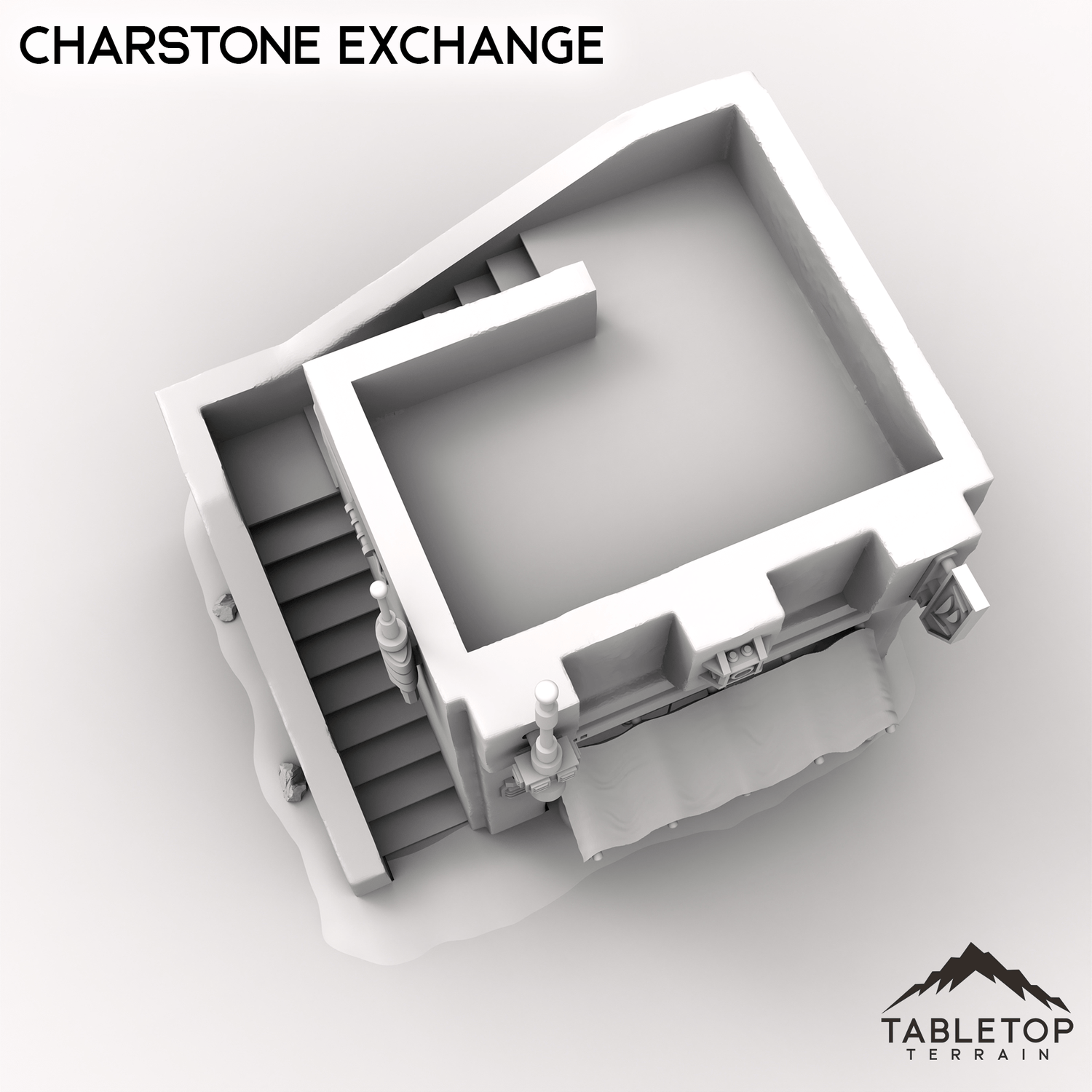 Charstone Exchange is a detailed 1-story building with a wrap around staircase leading to the open rooftop, and featuring an awning hanging over the building's entrance. The Nomad's Sanctuary sets are all perfect for sci-fi games, cyberpunk tabletops, or desert outposts. Each building is made to be easy to setup and paint.