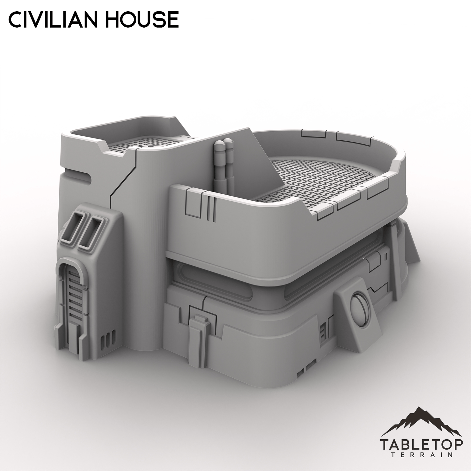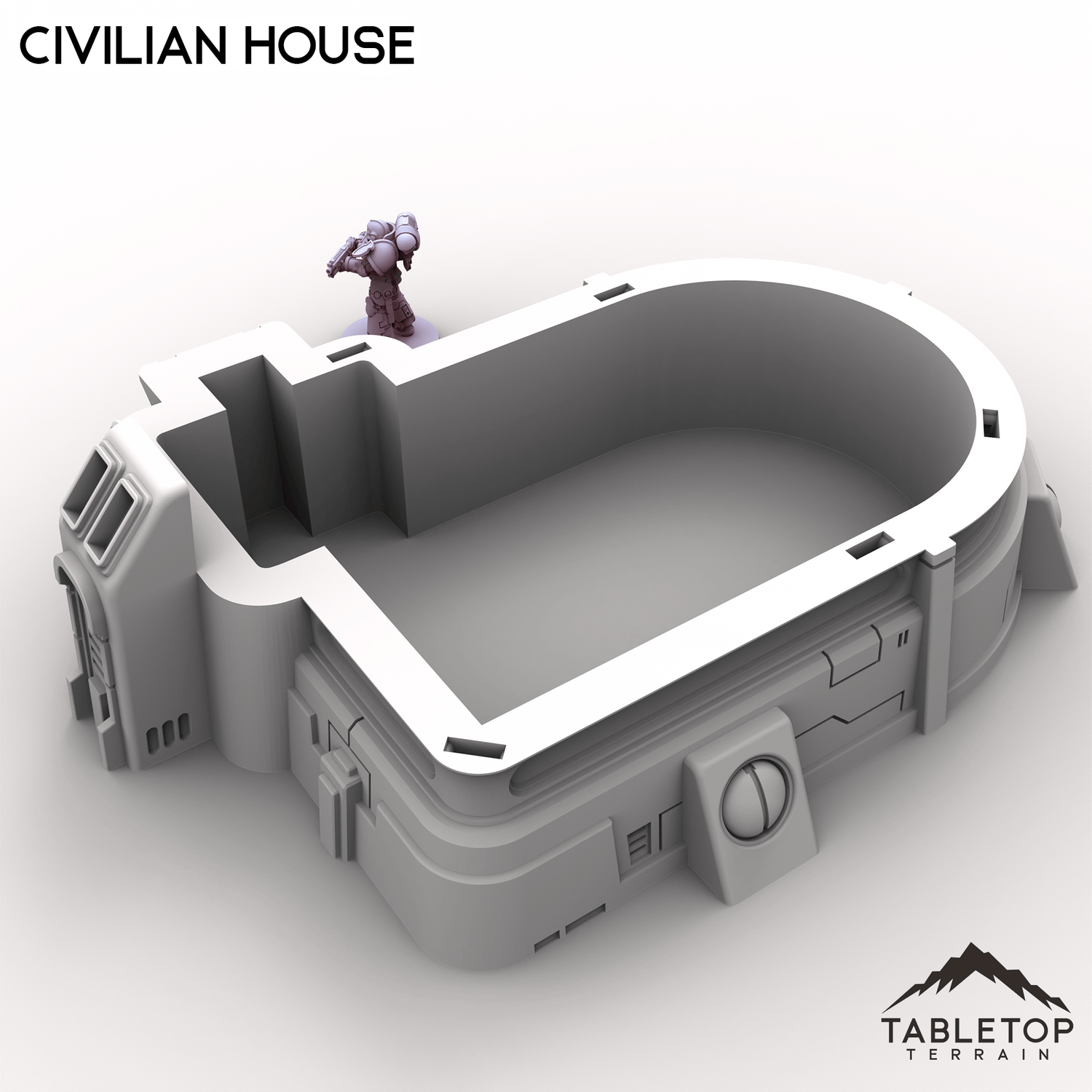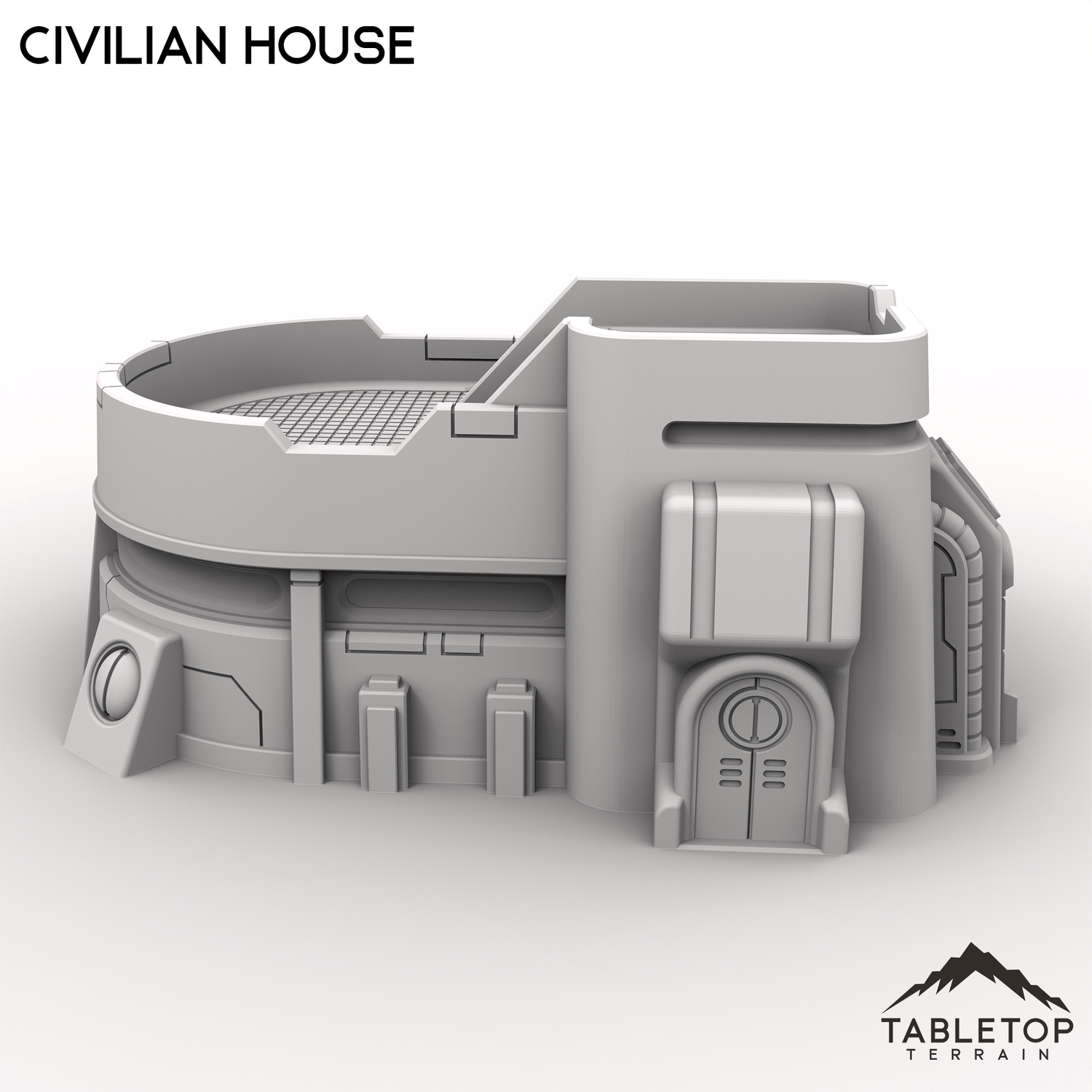 This Civilian House has a chunky, fortified look, like everyday life in a place where people expect trouble. The rounded roof deck and clean panel lines make it feel practical but still futuristic.