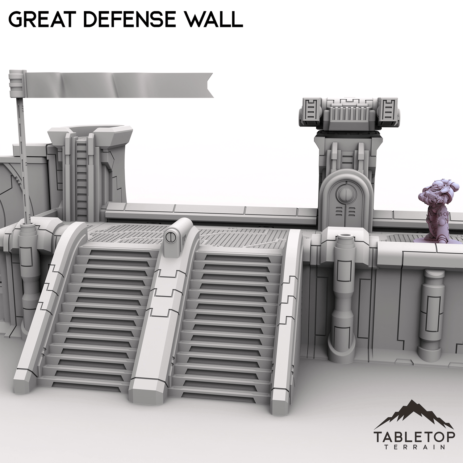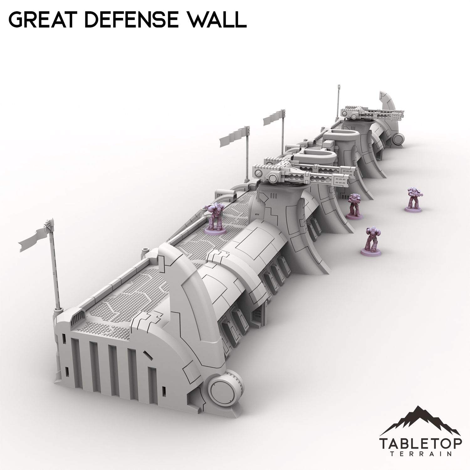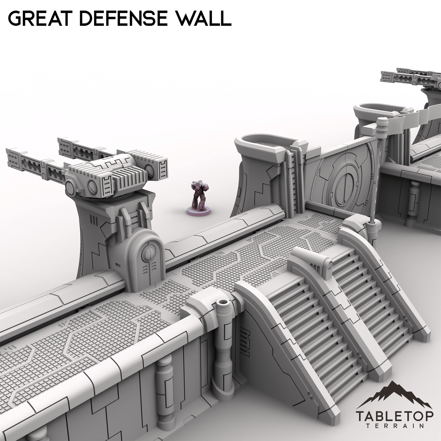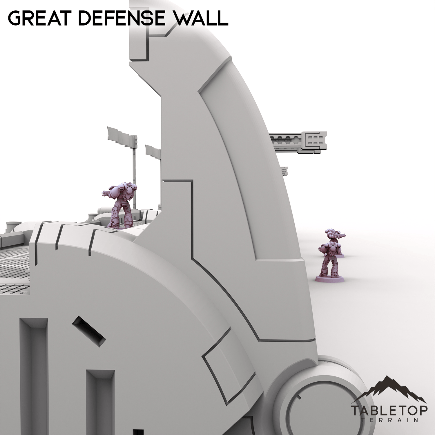 The Great Defense Wall is a long modular wall with reinforced panels and raised sections for added protection. It features gun turrets that can swivel and elevate, allowing flexible firing angles across the battlefield.