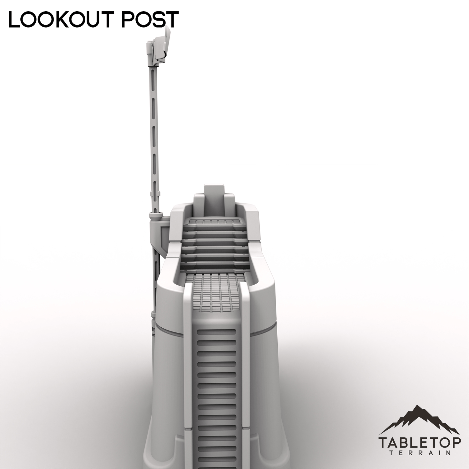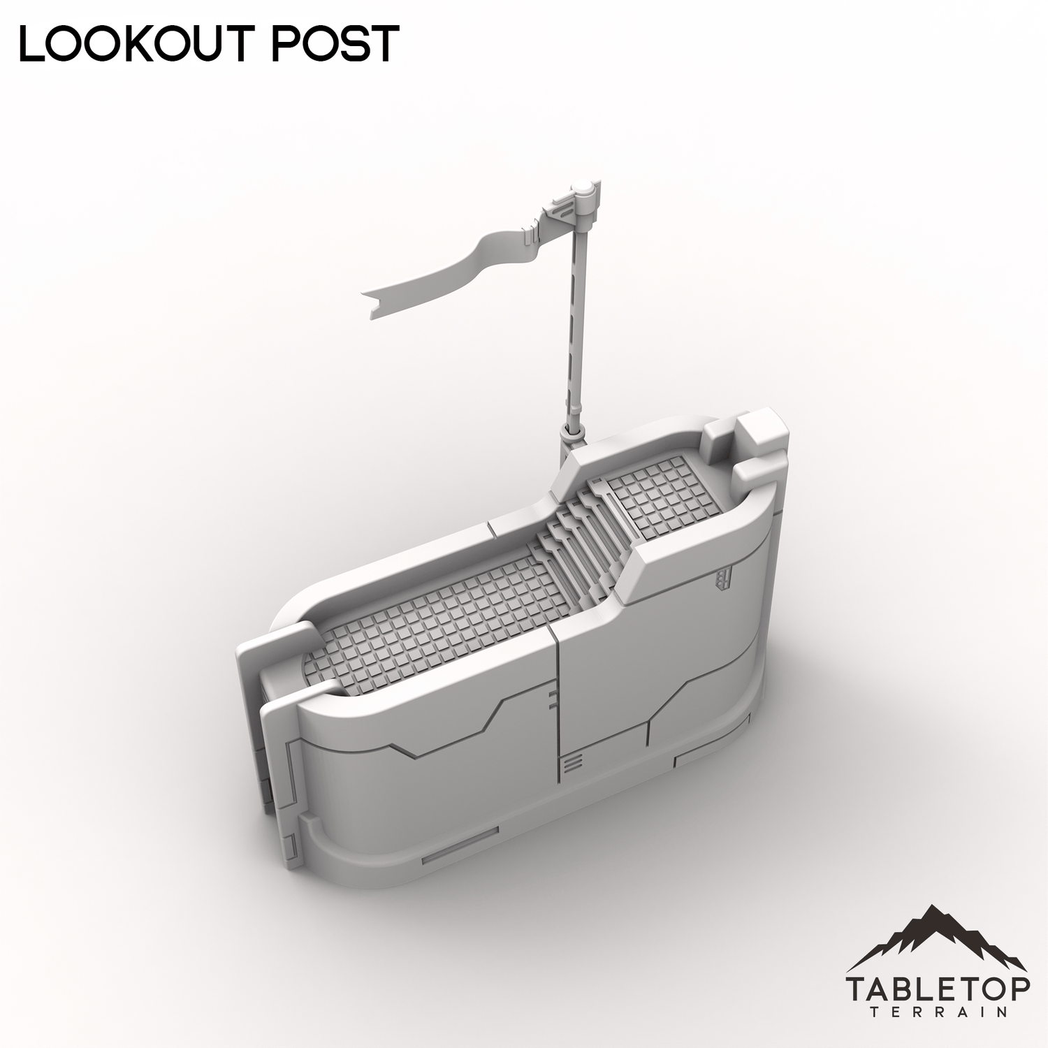 The Lookout Post stands on a sturdy platform with clean sci-fi lines and a clear vantage point. A prominent flag rises above it, marking the position for allies or enemies alike. It works well as an objective piece or a forward observation post on the table.