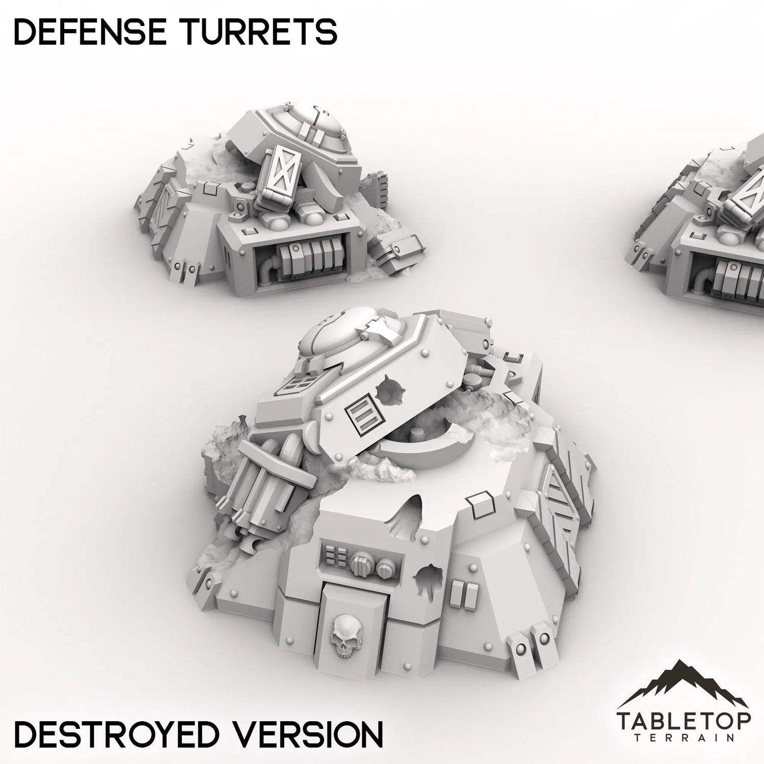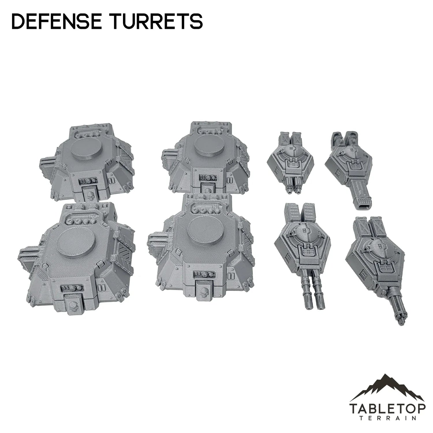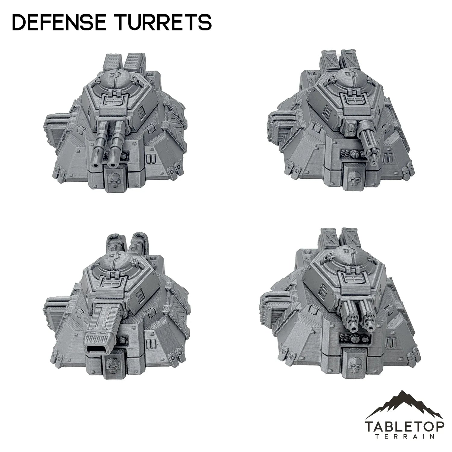 The Defense Turrets is a set of four small defense turrets with articulating turret heads. It comes with all four gun options- assault cannon, bolter, laser and plasma. They require assembly, but have a peg and groove system to aid with gluing.