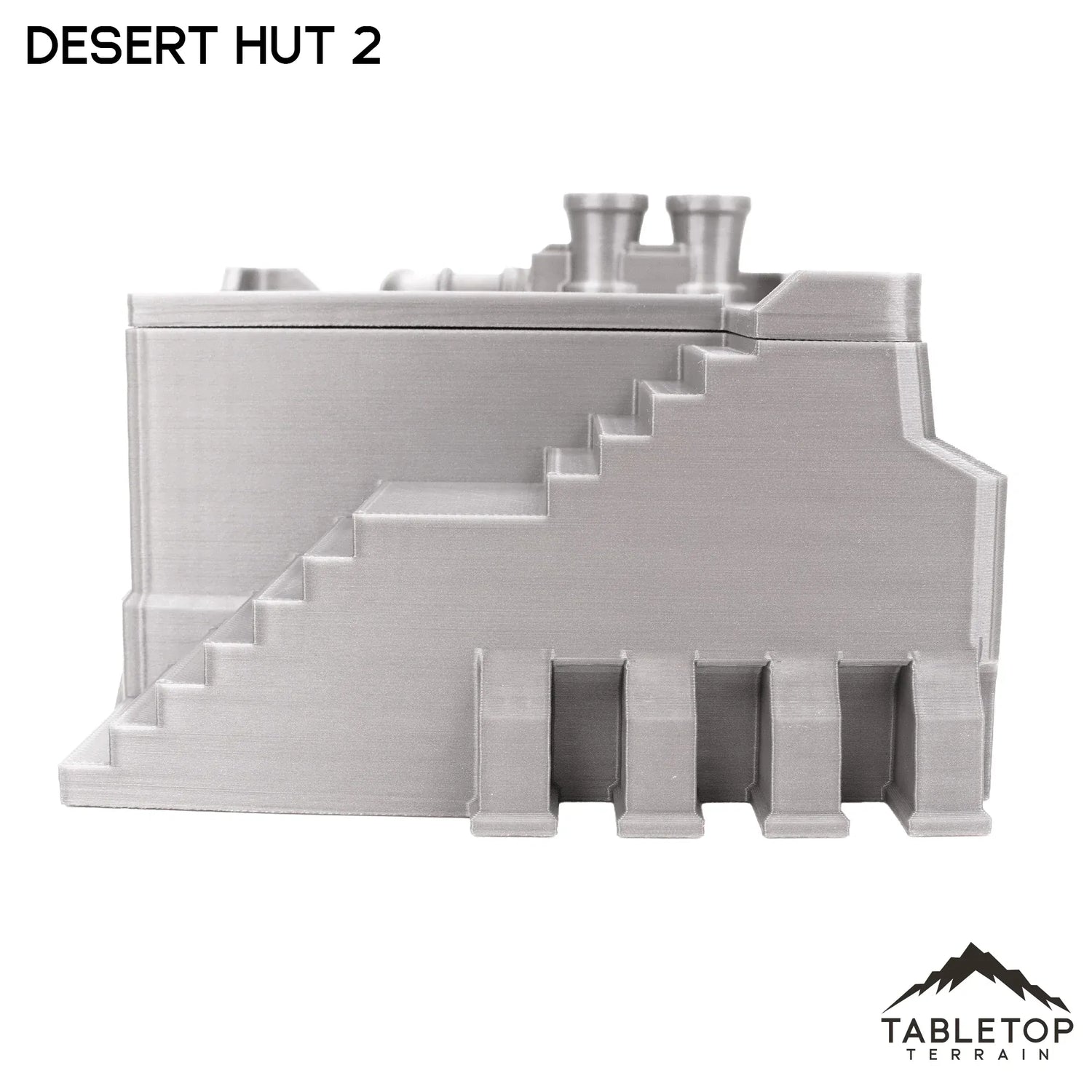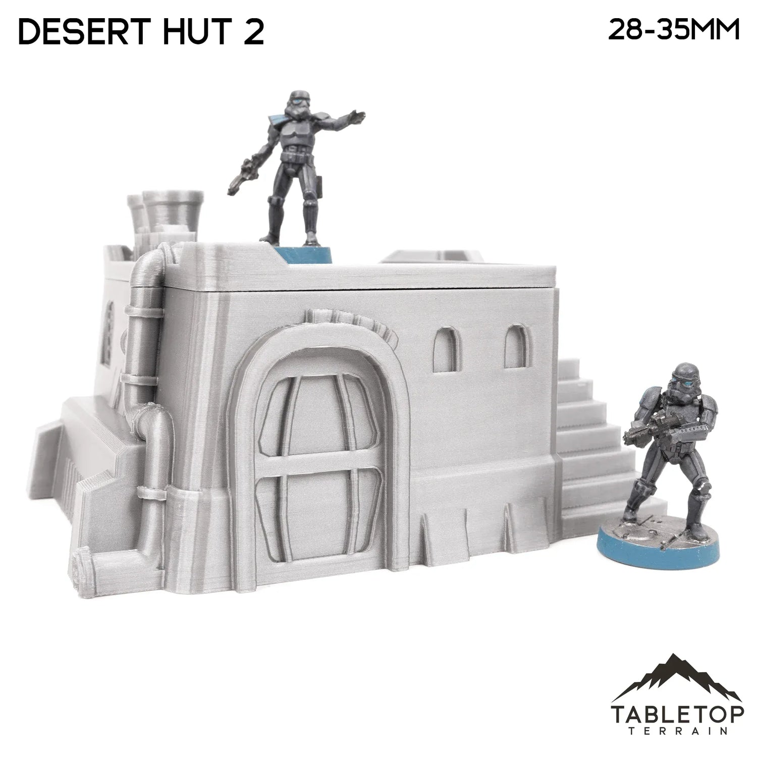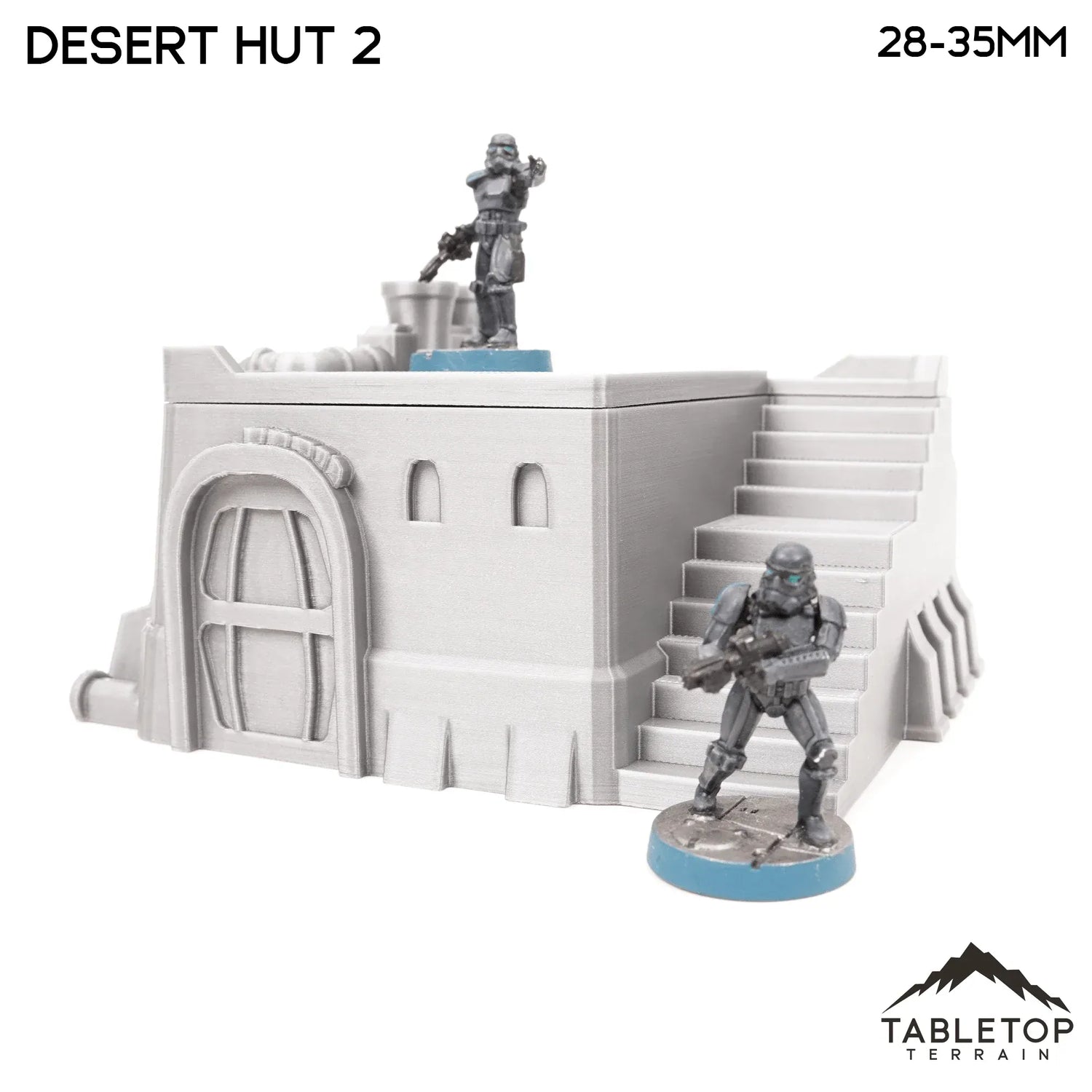 The Desert Hut 2 has an exterior staircase leading to the rooftop. These smaller buildings are a fantastic way to mix and match different houses and shops for your cityscape or town, adding a lived-in feel to the table's setup. The Hut is printed in 40mm, 28-35mm (1:47), 20mm, and 15mm scale. We recommend the 40mm scale for Shatterpoint and the 28-35mm (1:47) scale for Legion.