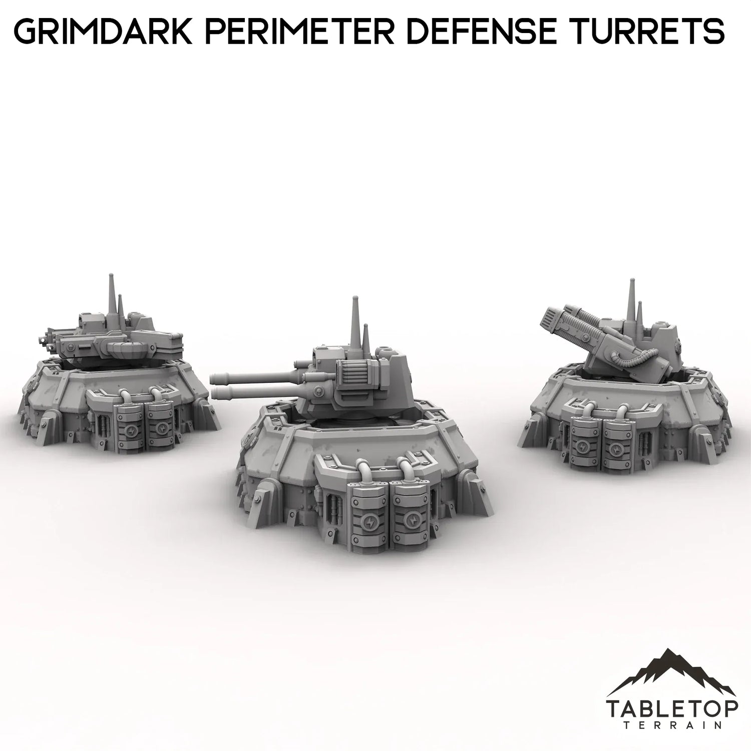 The Grimdark Perimeter Defense Turrets are a set of 3 turrets with articulating guns. All three variations of the weapons are included and require assembly.