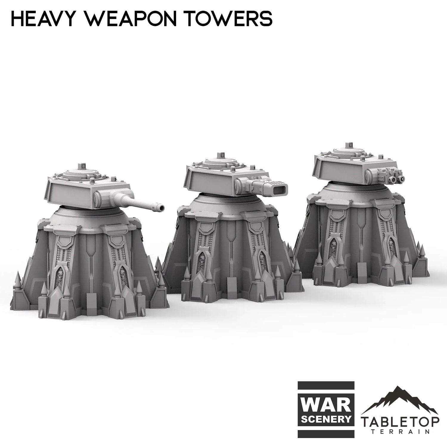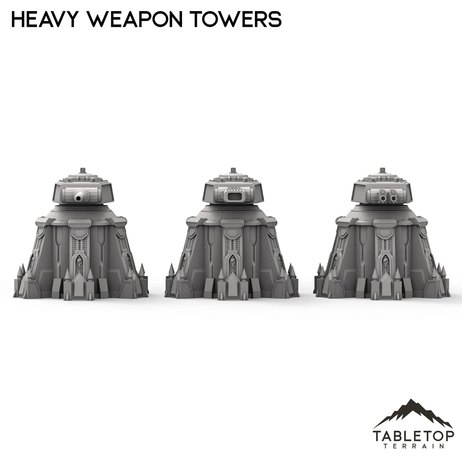 The Heavy Weapon Towers set is a trio of turrets, each with a unique type of barrel. The turrets themselves are able to swivel in place, or be glued down easily. The turrets can be spread around a battlefield, or grouped-up in defense of a single larger structure. The Heavy Weapon Towers set is designed for sci-fi wargames, but can be used with any system.