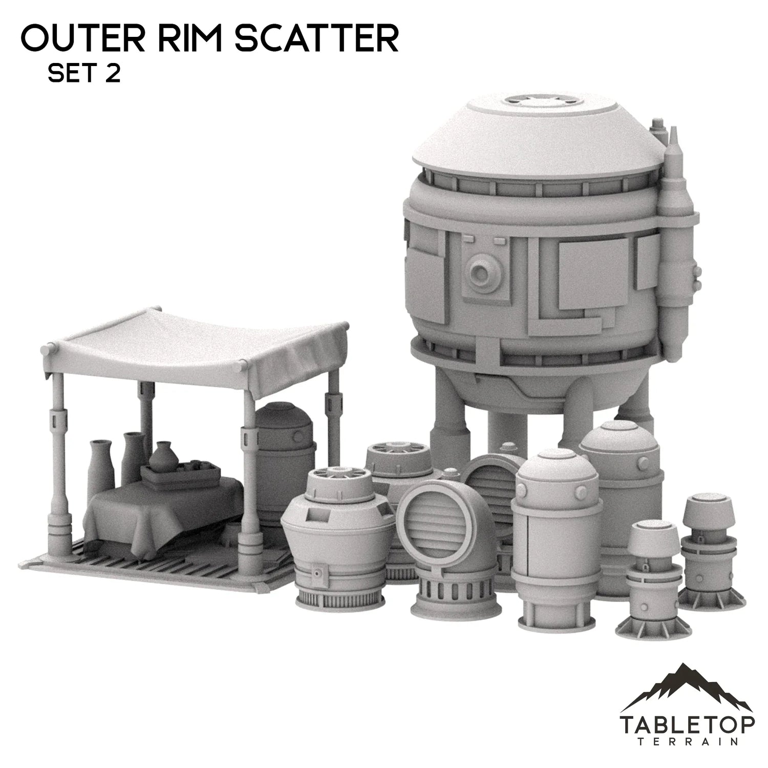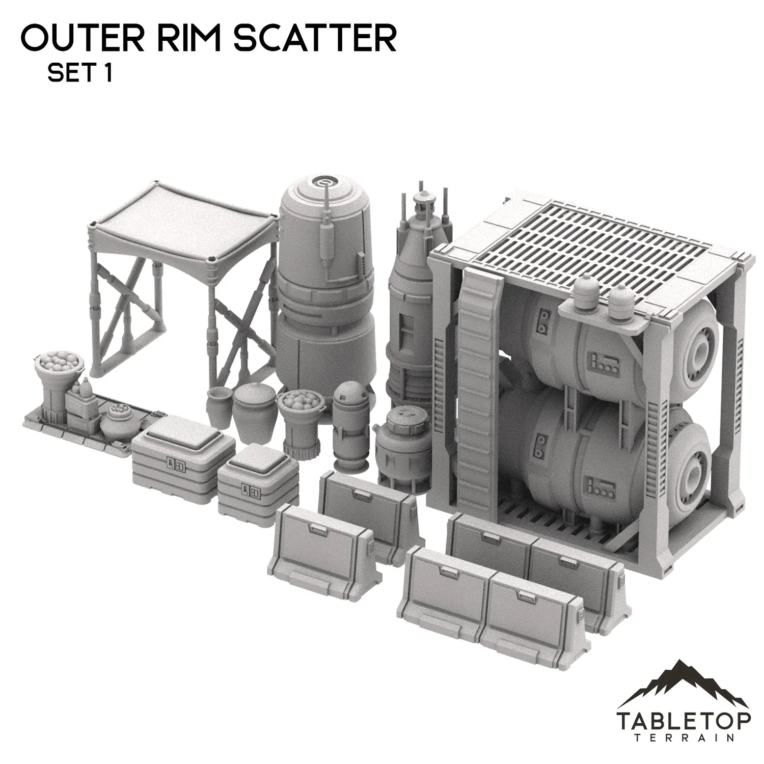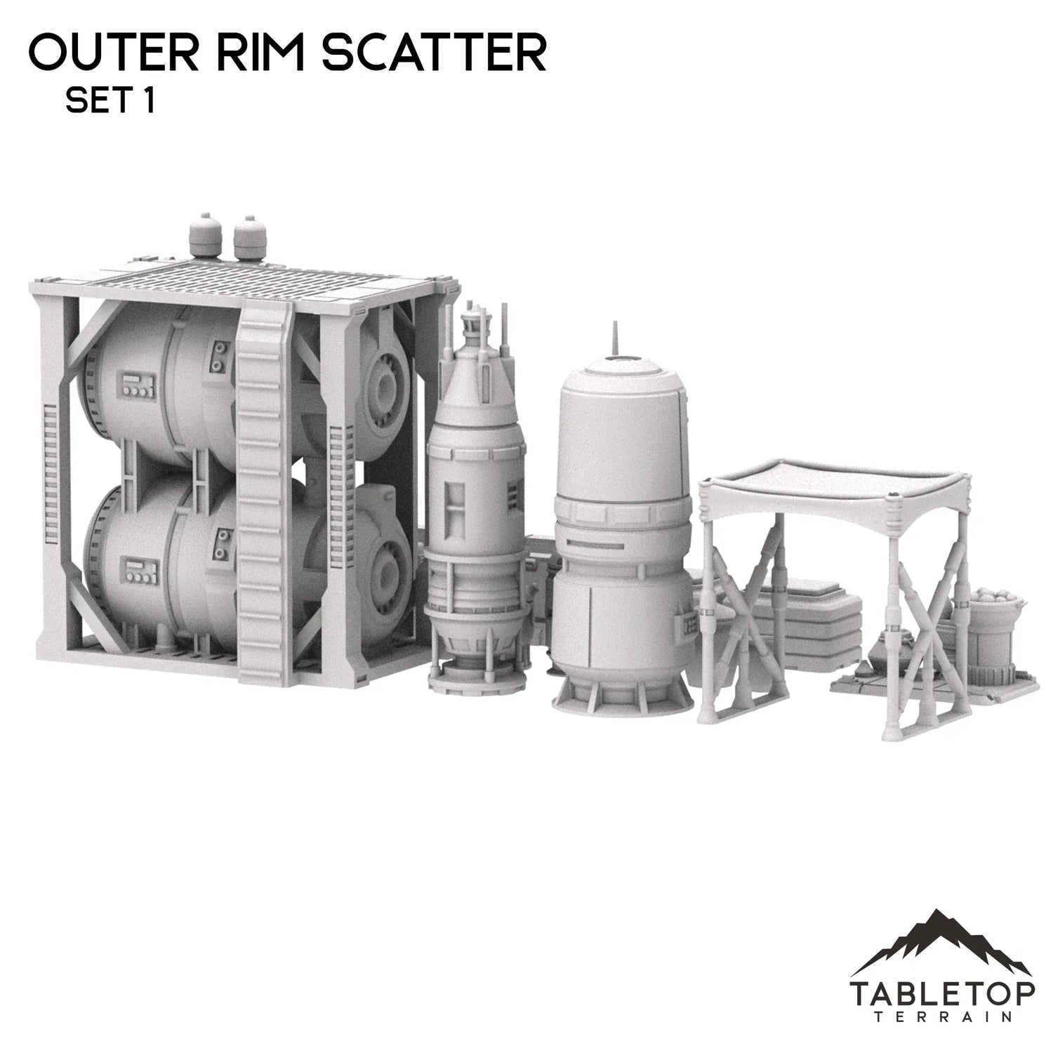 The Outer Rim Scatter sets are collections of various objects, tools, and freestanding decorations for adding character and depth to an Outer Rim city or town. The sets would also work well for a small outpost or military base, to give a stronger feeling of intentionality and believability. The Outer Rim Scatter sets are printed in 40mm, 28-35mm (1:47), 20mm, and 15mm scale. We recommend the 40mm scale for Shatterpoint and the 28-35mm (1:47) scale for Legion.