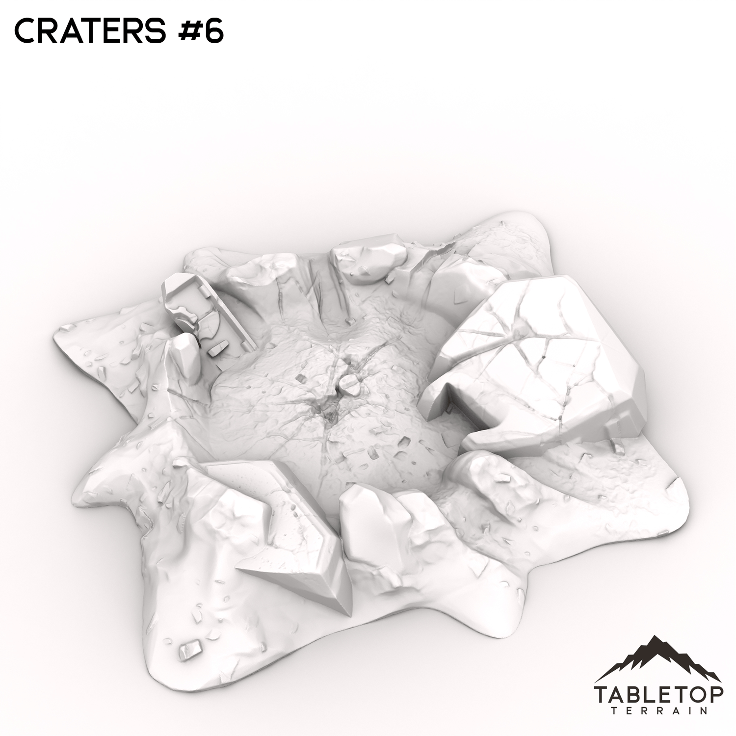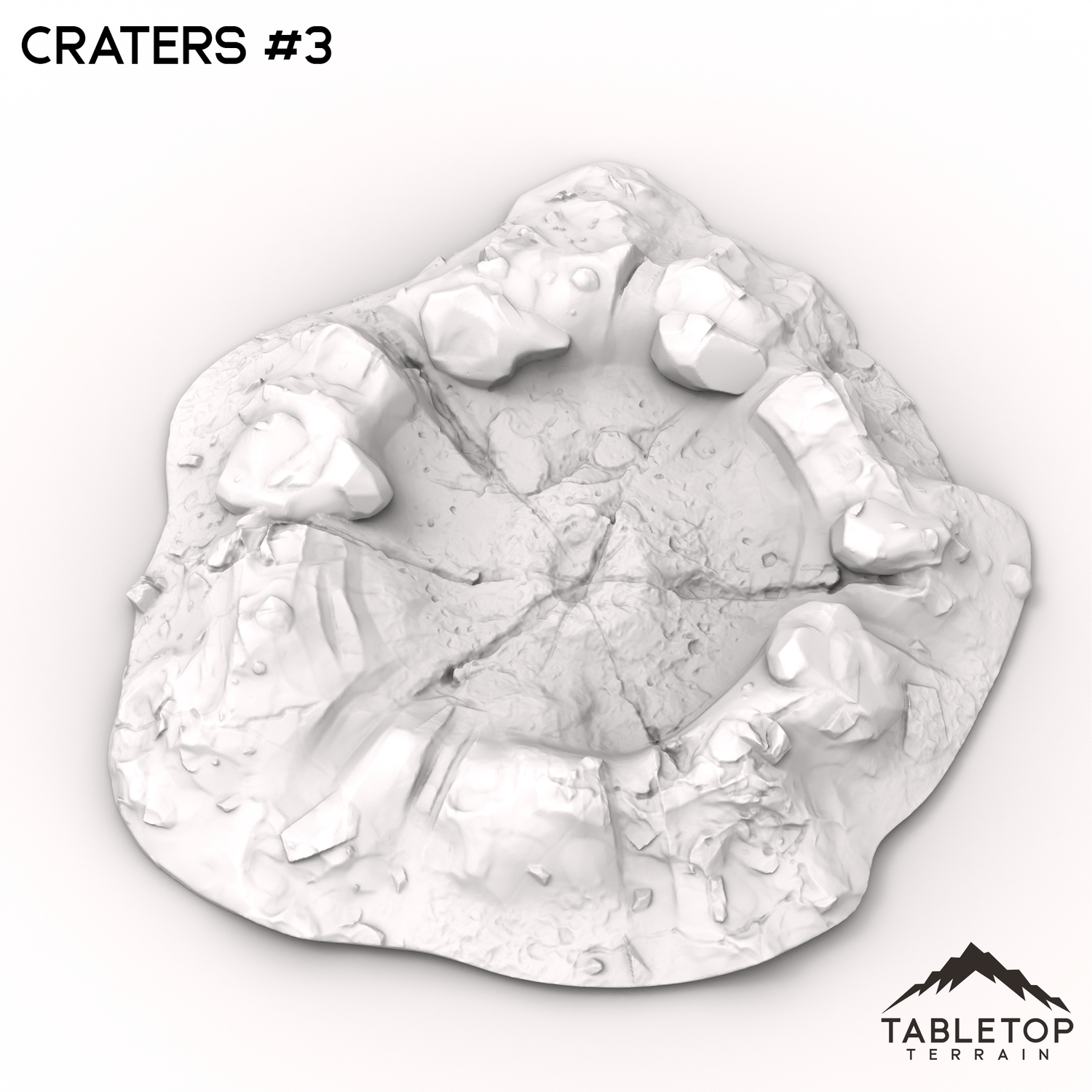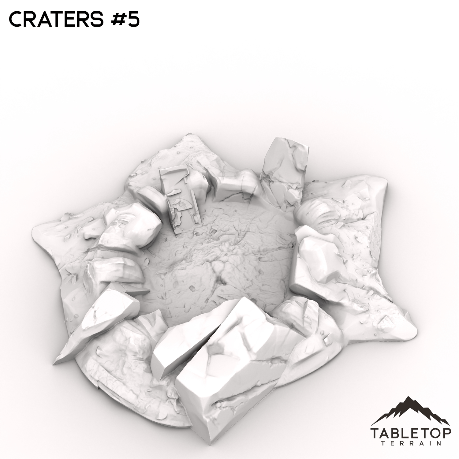 This cratered landscape features deep, jagged depressions scattered across a barren and scarred terrain, each crater varying in size and depth. This terrain is ideal for tabletop scenarios involving recent or ancient impacts, perhaps from meteorites or as a result of intense battles. You can buy each piece individually or the whole set at a discount.