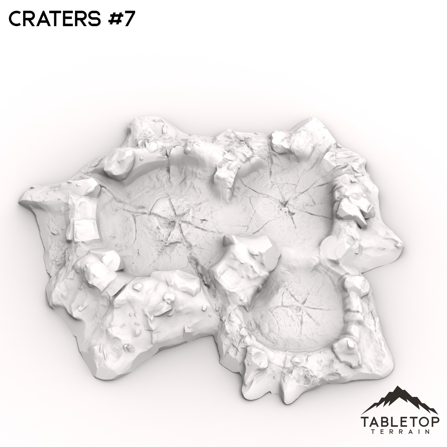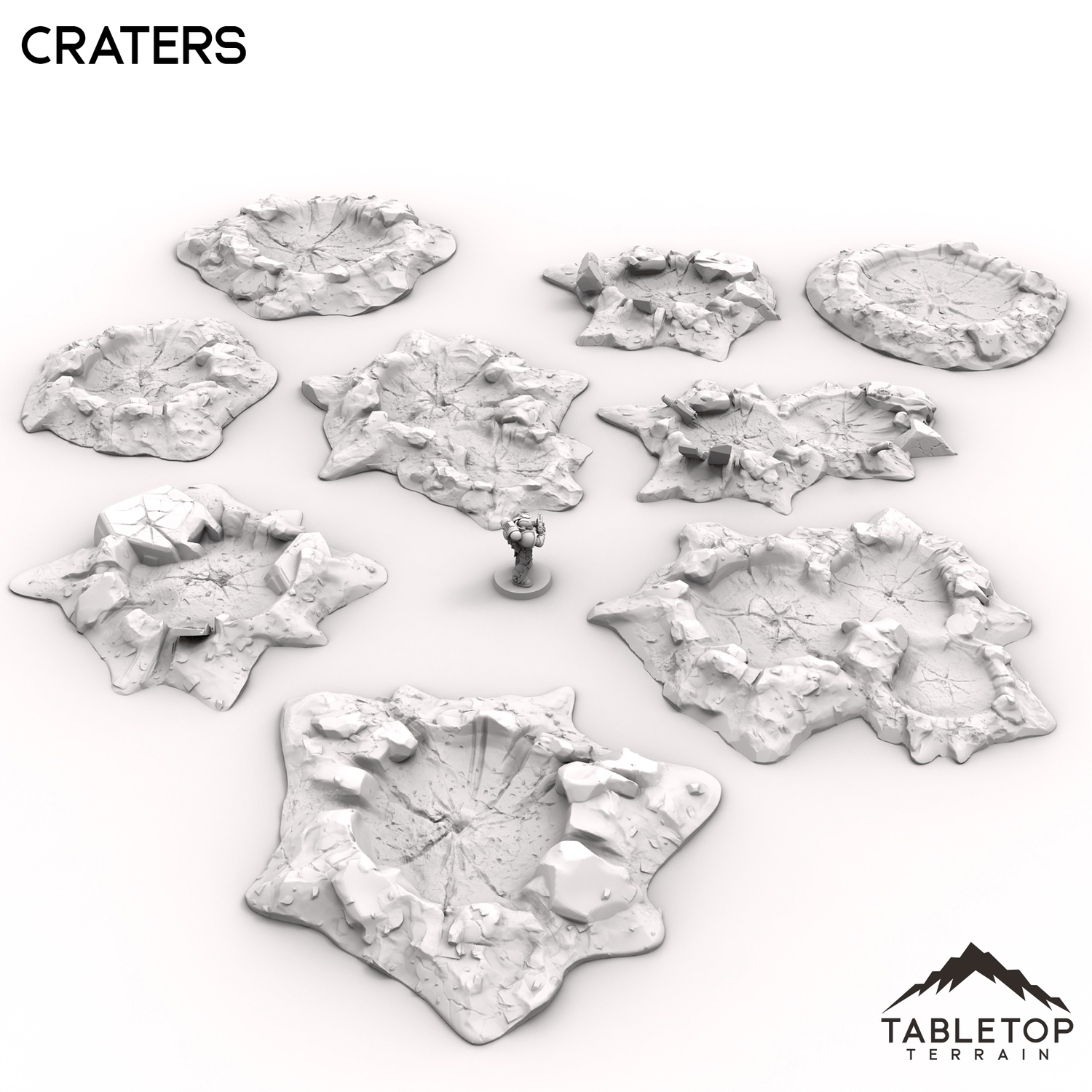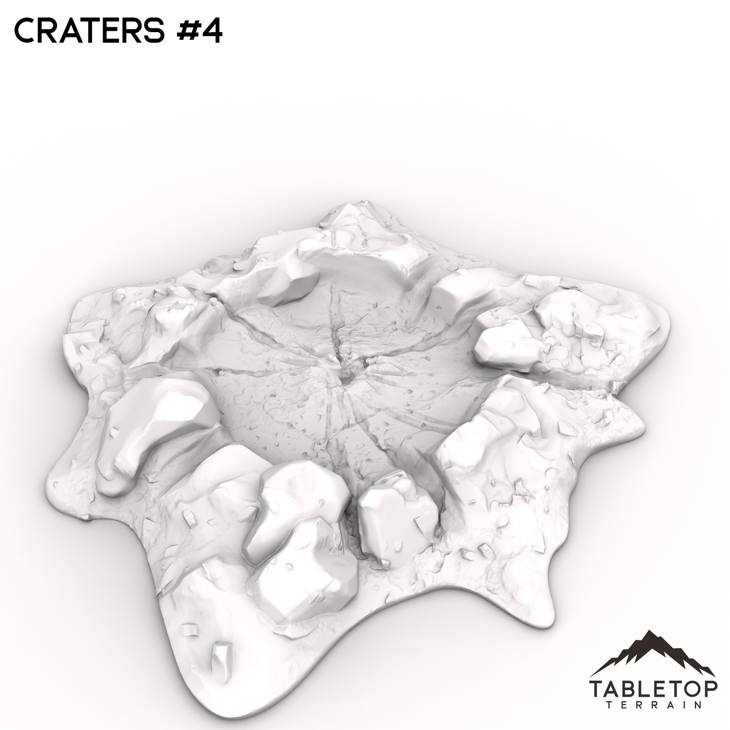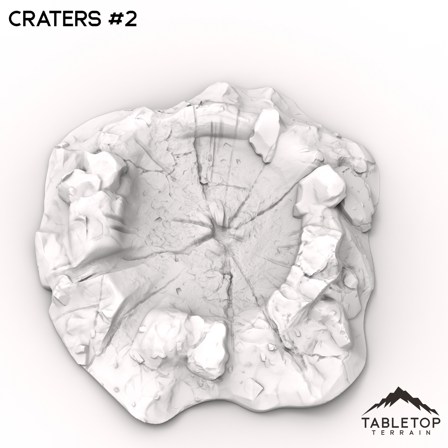 This cratered landscape features deep, jagged depressions scattered across a barren and scarred terrain, each crater varying in size and depth. This terrain is ideal for tabletop scenarios involving recent or ancient impacts, perhaps from meteorites or as a result of intense battles. You can buy each piece individually or the whole set at a discount.
