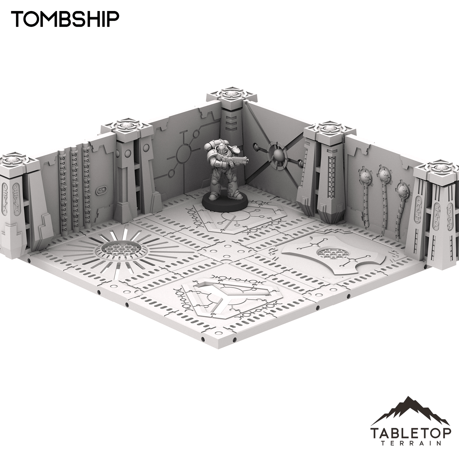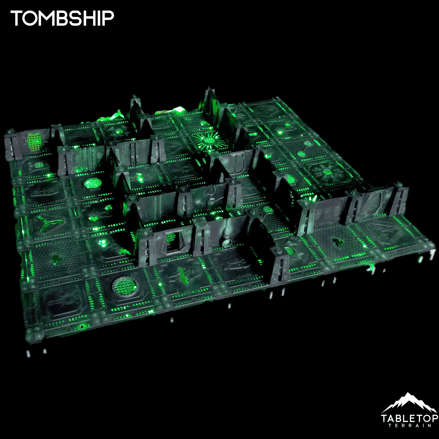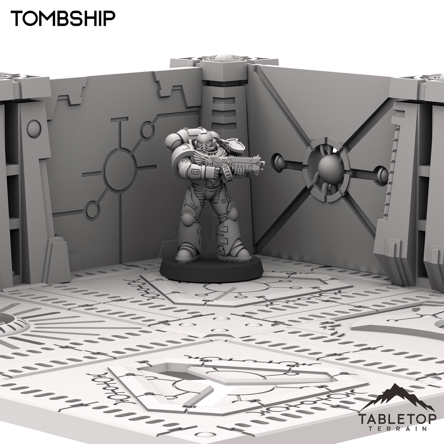 The Tombship Necrontyr Terrain set is a combination of walls and scatter accessories, forming the interior of an Necrontyr-style battleship. The terrain is fully modular for arranging into whatever order you'd like, and is 100% compatible with the official GW terrain. These pieces slot in with the official ones, allowing you to mix and match to create a larger battlefield. We also sell styles of ship terrain for different factions, such as Gothic Navy or Space Elves.