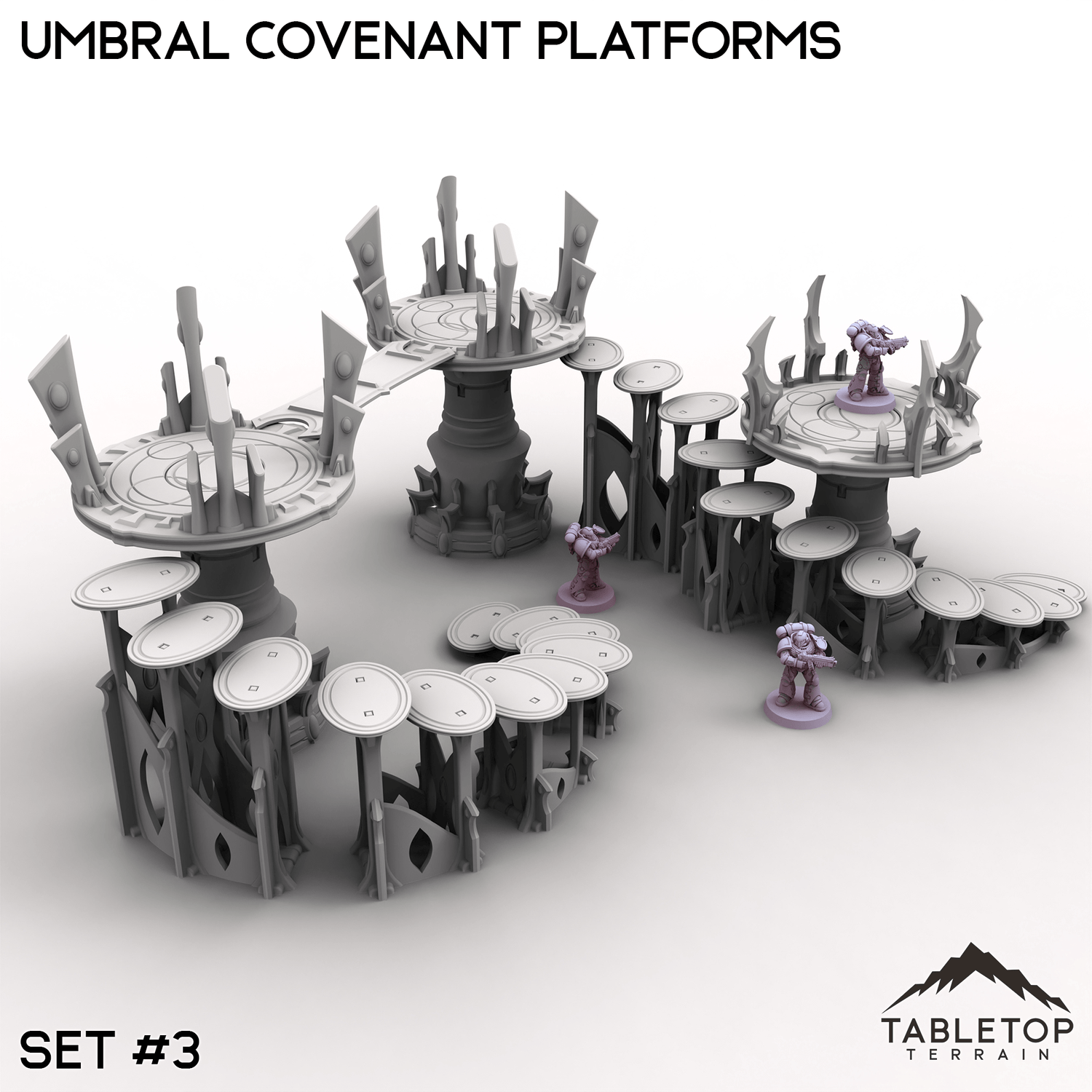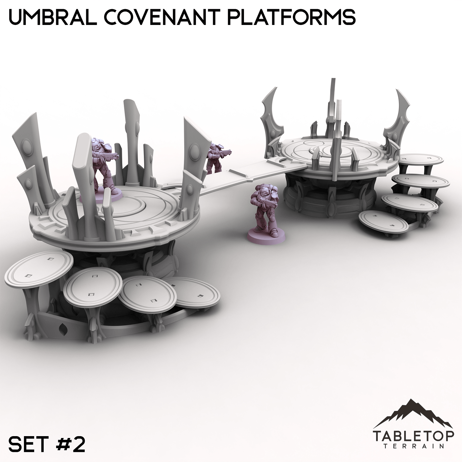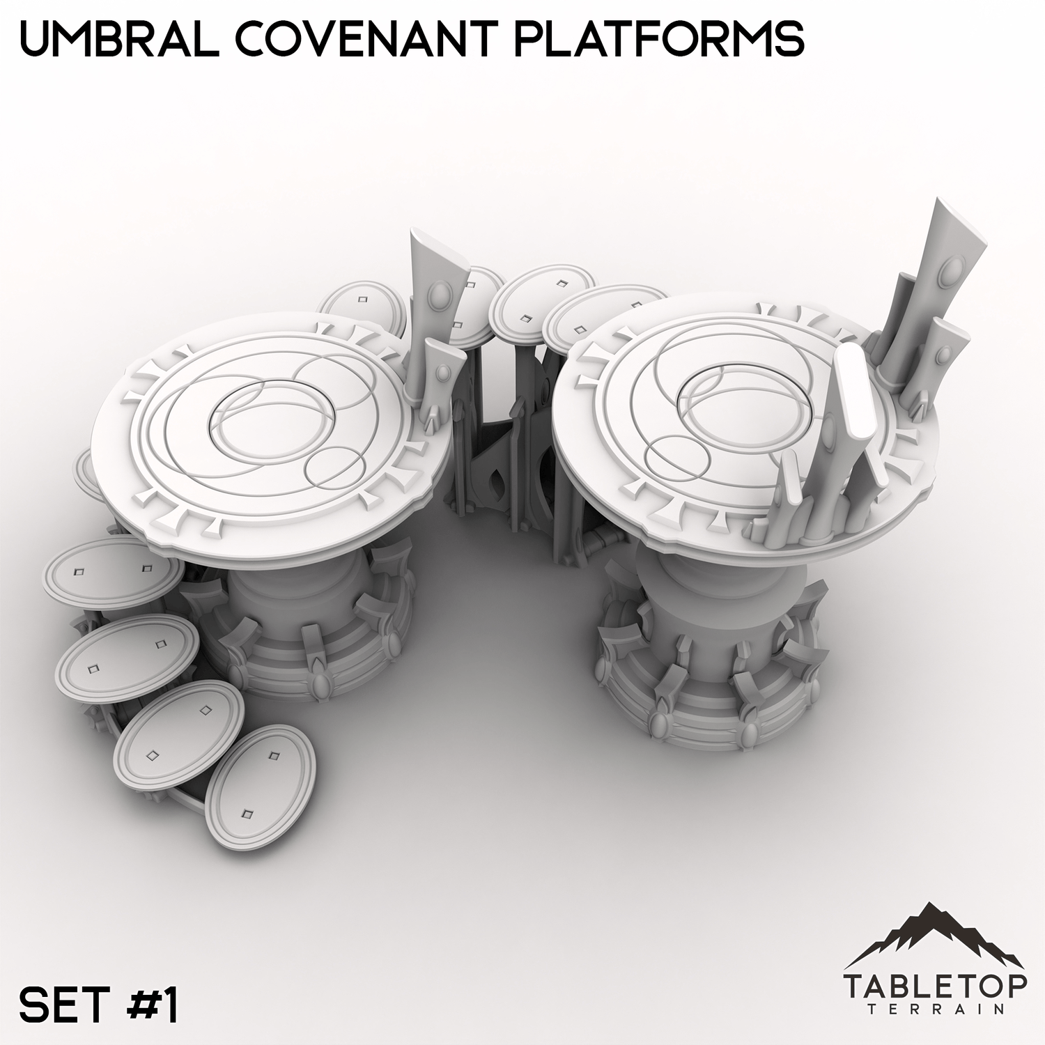 The Umbral Covenant Platforms are modular platforms with sleek, curved surfaces and intricate designs common for an advanced civilization. With walkways and steps stretching between high platforms, this set provides a perfect battleground for sci fi tabletops with lots of elevation to play around. Purchase each set individually or the whole bundle at a discount!
