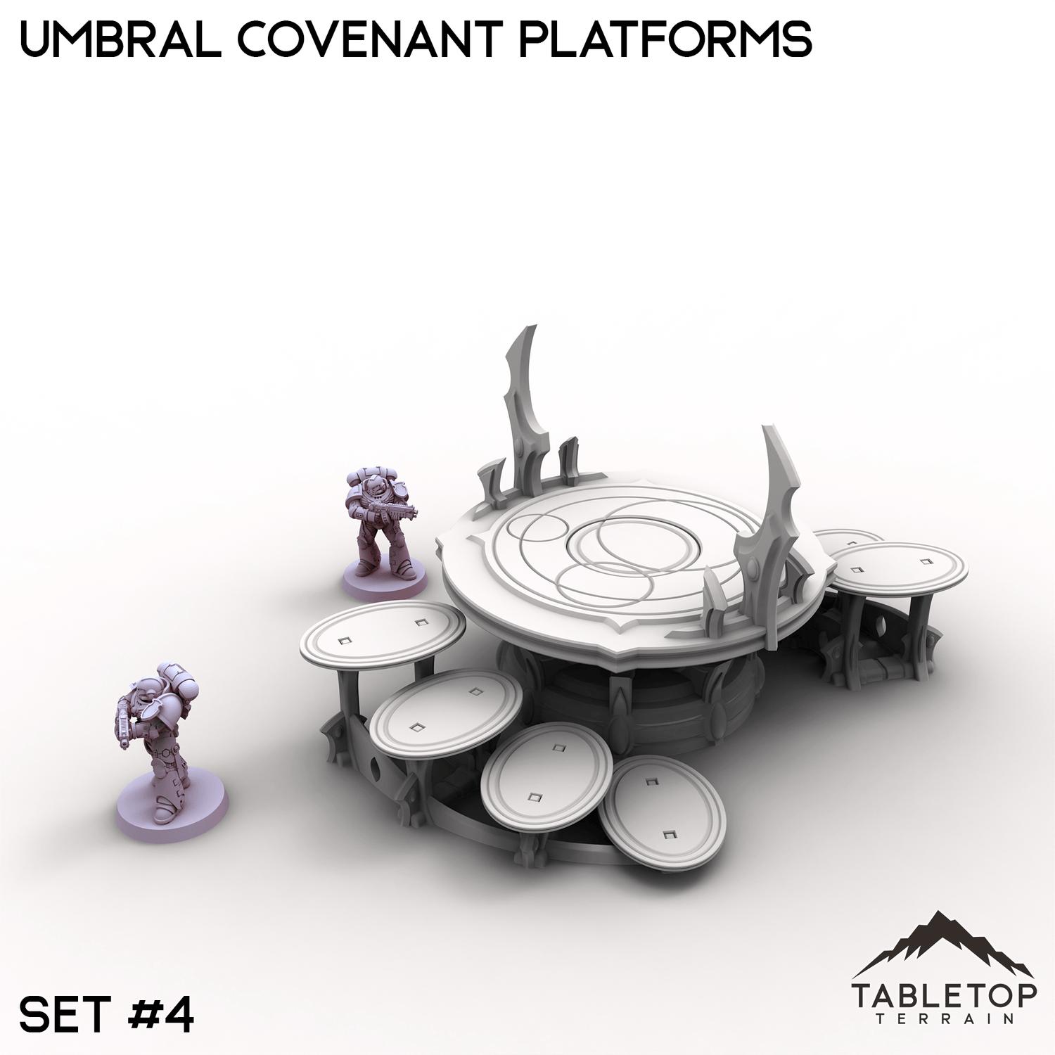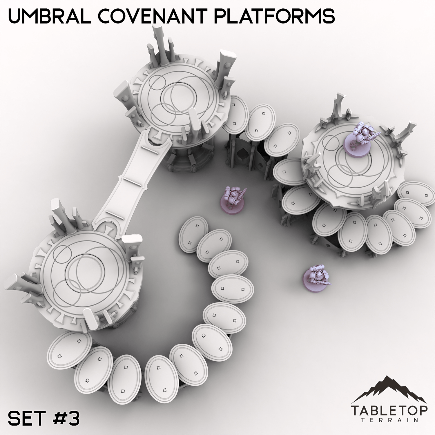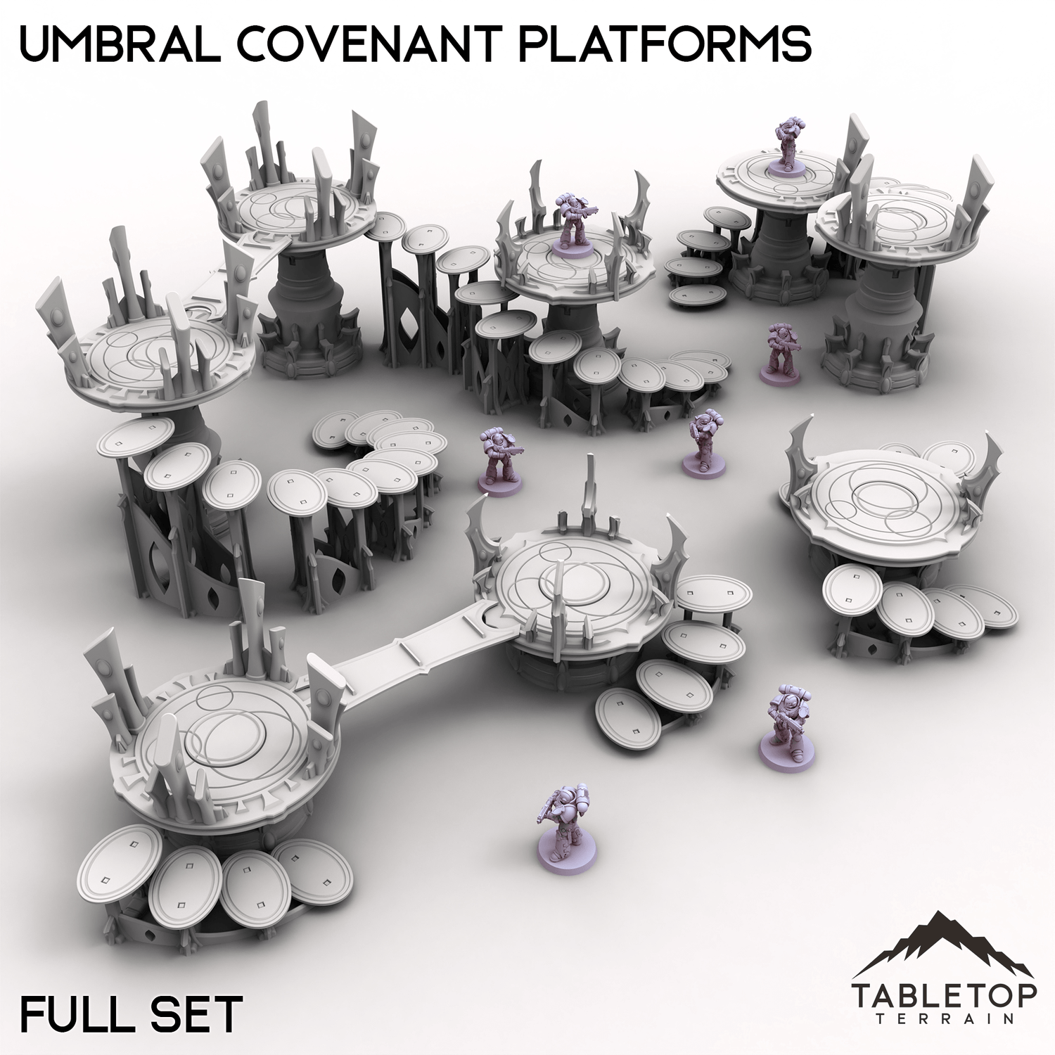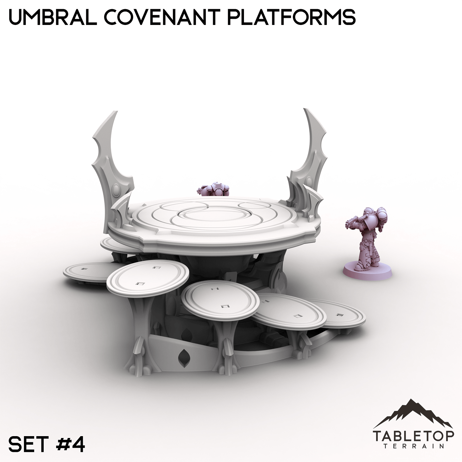 The Umbral Covenant Platforms are modular platforms with sleek, curved surfaces and intricate designs common for an advanced civilization. With walkways and steps stretching between high platforms, this set provides a perfect battleground for sci fi tabletops with lots of elevation to play around. Purchase each set individually or the whole bundle at a discount!