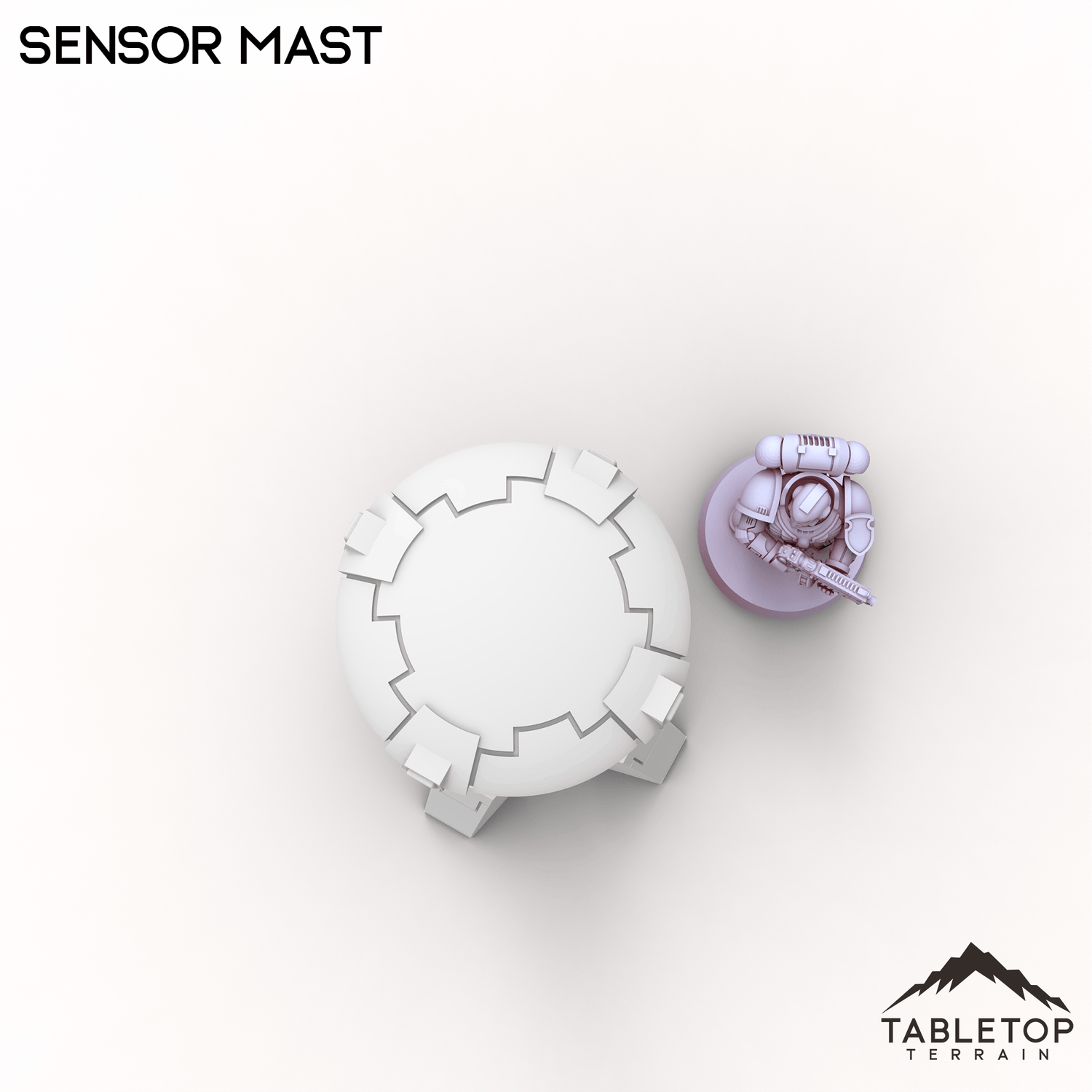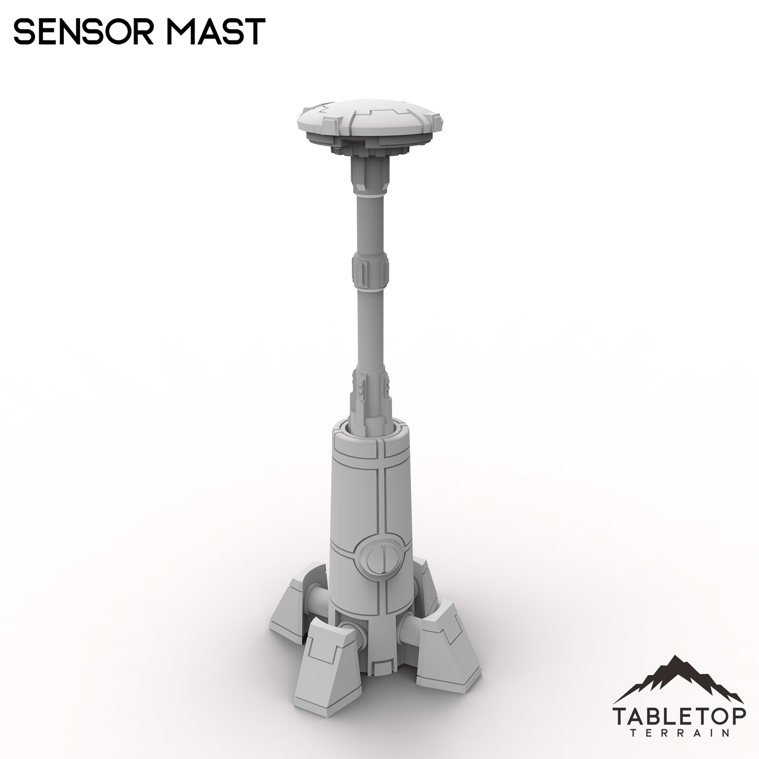 This Sensor Mast stands tall as a sleek tech landmark for any sci-fi table. It has a tall mast leading up to a round sensor suite at the top. It can serve as a comms relay, scanner node, or early-warning post depending on the mission.