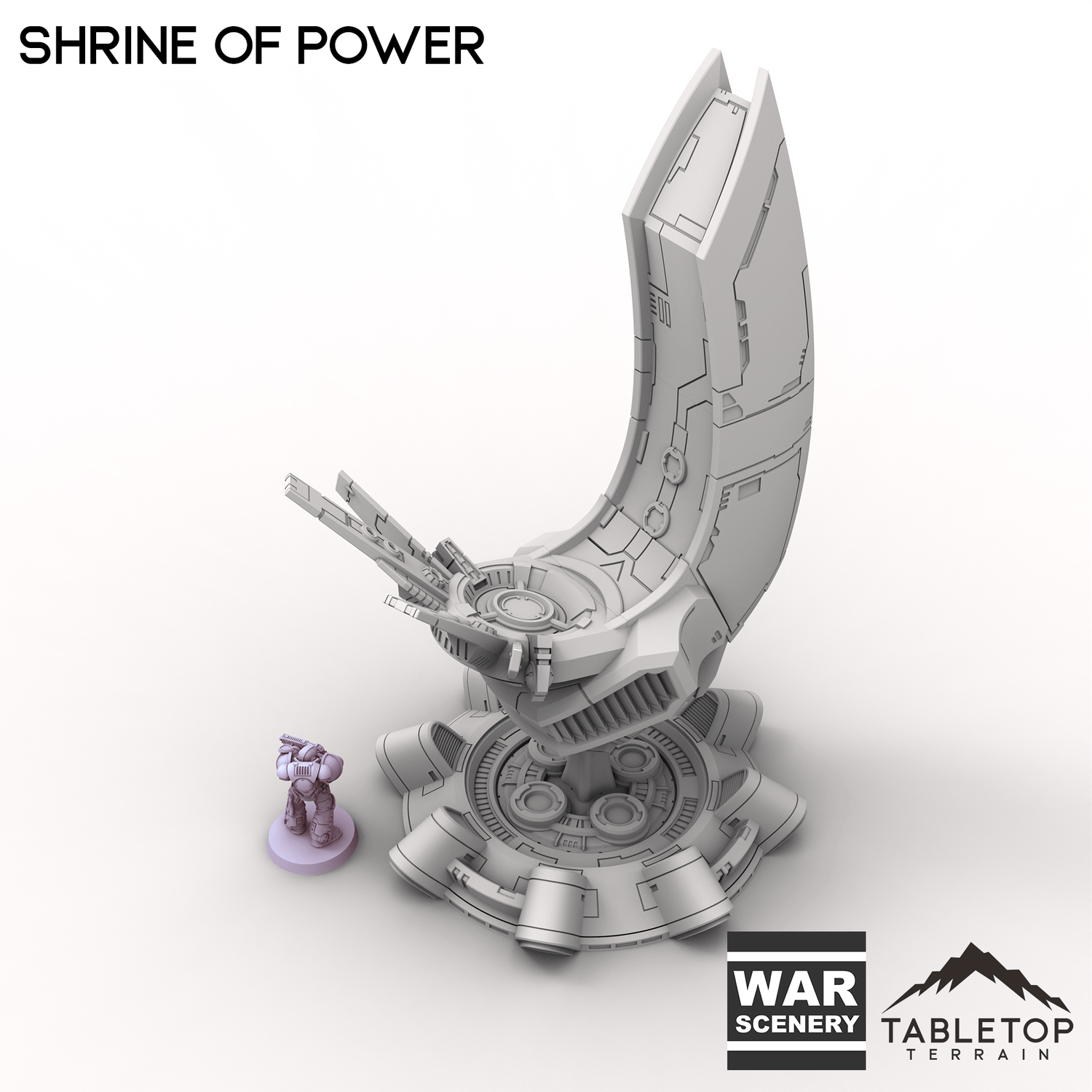 The Shrine of Power rises with a sharp, imposing arc and a cluster of energy conduits at its base. It feels like a place where raw force is focused, channeled, or unleashed. Perfect for a point of conflict or other objective on your tabletop.