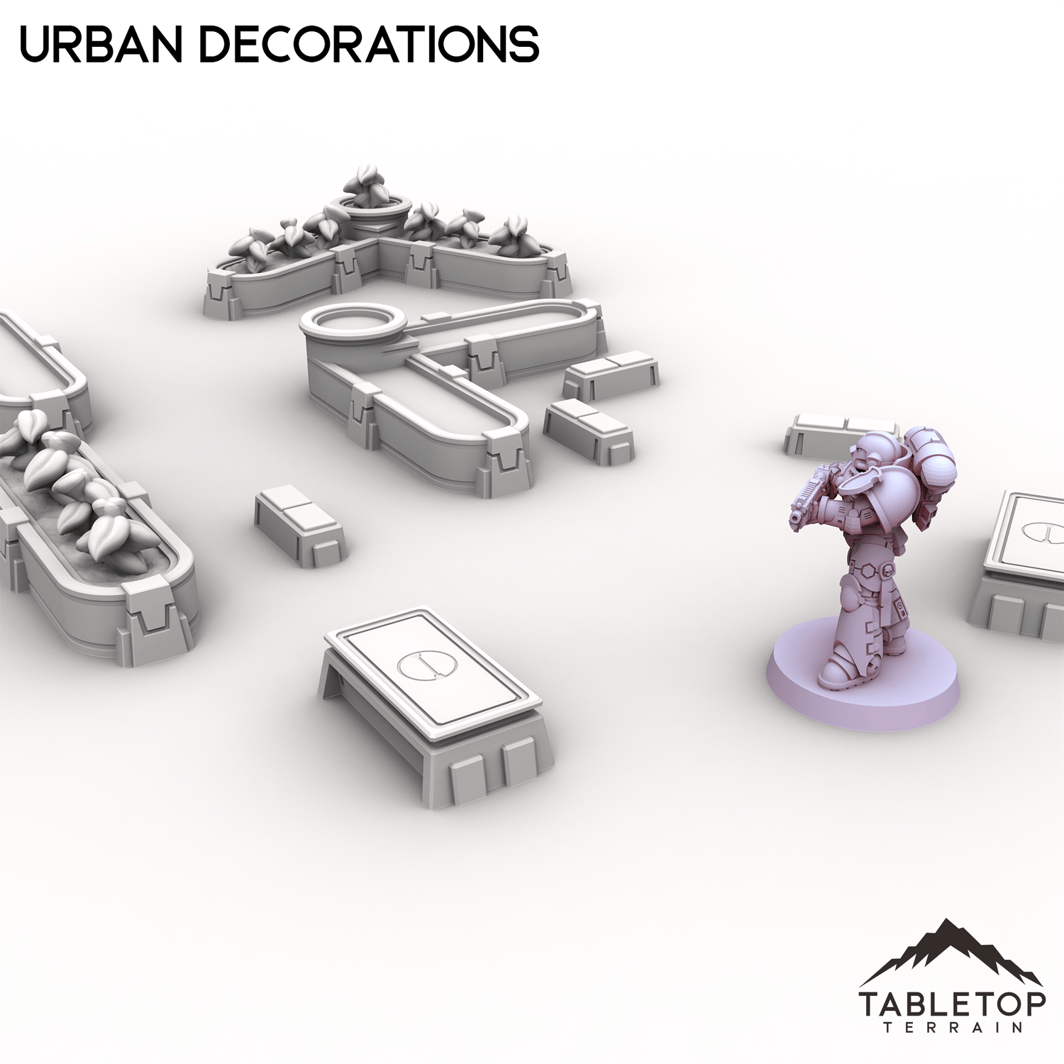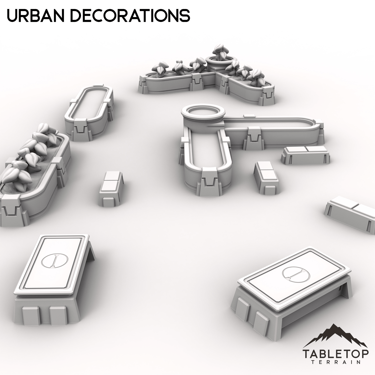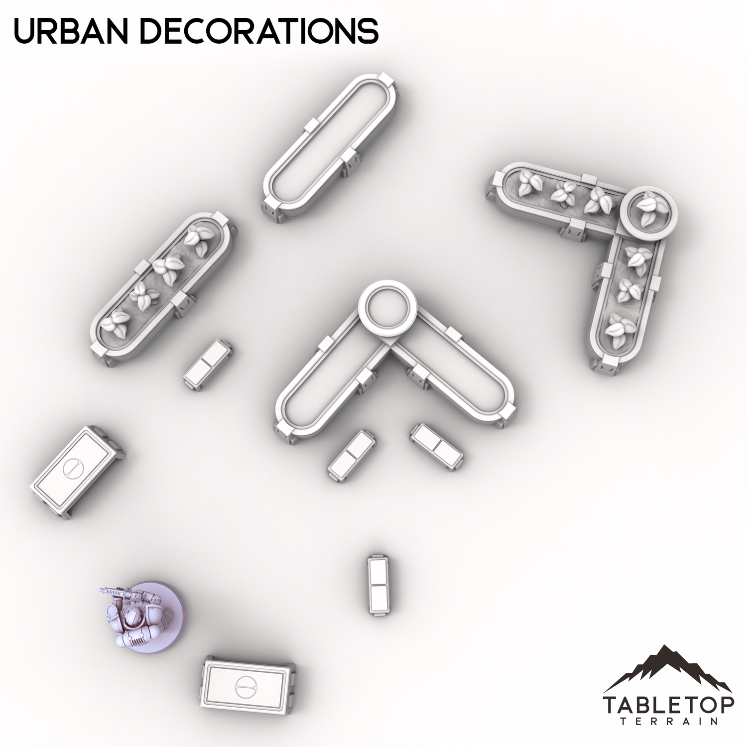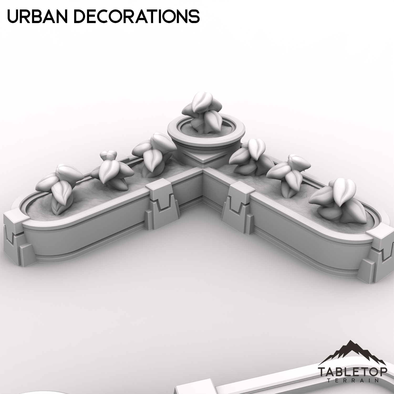 These Urban Decorations add a clean, sci-fi touch with planters and tidy seating pieces. The bright foliage pops against the sleek white frames, giving your streets or plazas a bit of life.