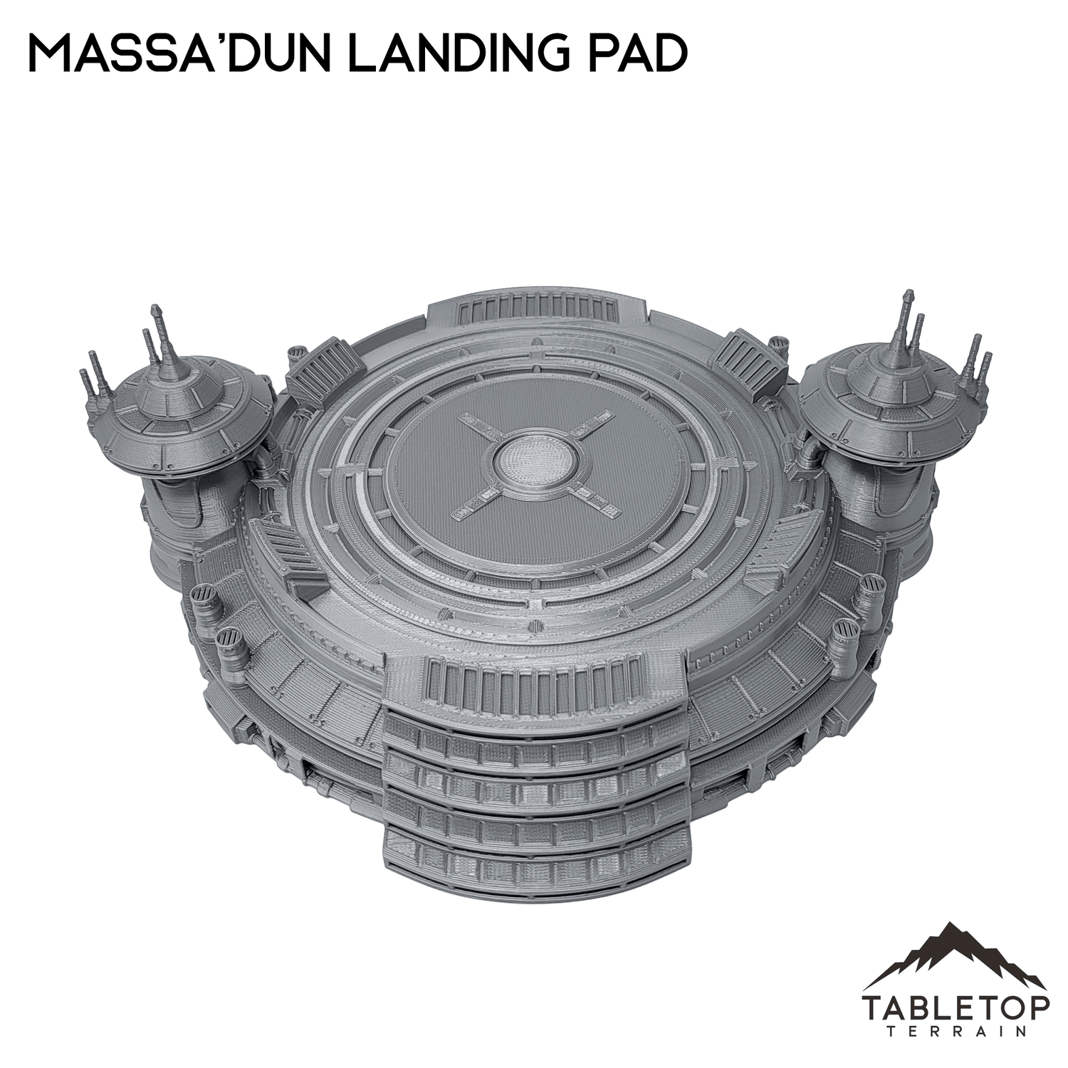 La plataforma de aterrizaje es una estructura estilo Borde Exterior construida para que vehículos o aerodeslizadores aterricen o estacionen. El edificio está impreso en escala de 40 mm, 28-35 mm (1:47), 20 mm y 15 mm. Recomendamos la escala de 40 mm para Shatterpoint y la escala de 28-35 mm (1:47) para Legion.