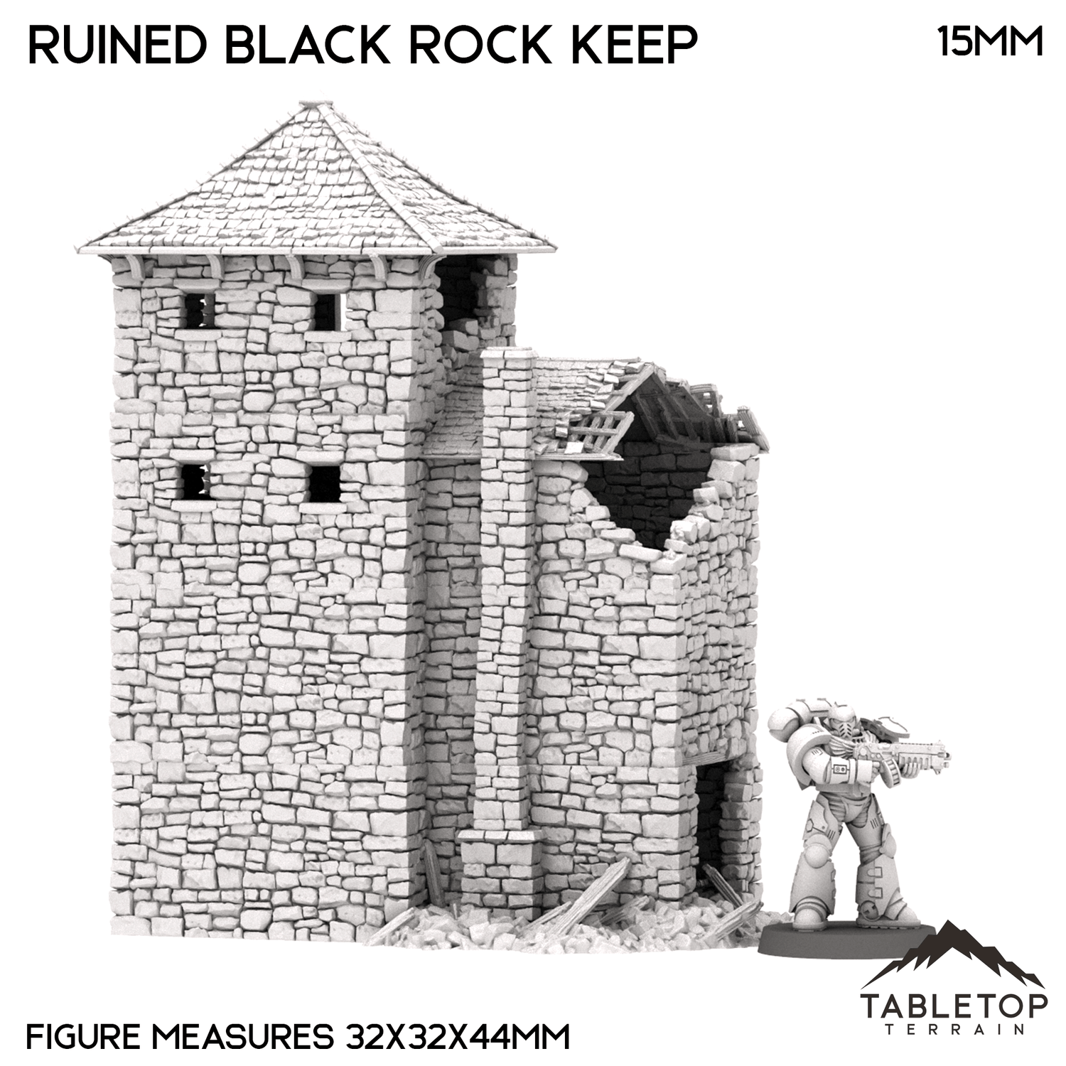 El Fuerte de Roca Negra en Ruinas es la versión destruida del castillo original, mostrando los efectos devastadores de una balista enemiga. Es una torre de cuatro pisos diseñada para ubicarse junto a los Cuarteles de Roca Negra. También encaja fácilmente dentro de las Murallas del Fuerte Normando, uniéndose a las almenas. Cada piso cuenta con detalles interiores y espacio para colocar miniaturas. Es ideal para juegos históricos como Bolt Action para WII, Flames of War o Fields of Glory. También es ideal para juegos de rol de fantasía como DND, Age of Sigmar, Kings of War o Conquest. El edificio está impreso en escalas de 32 mm, 28 mm, 20 mm o 15 mm, con otras escalas disponibles bajo pedido.