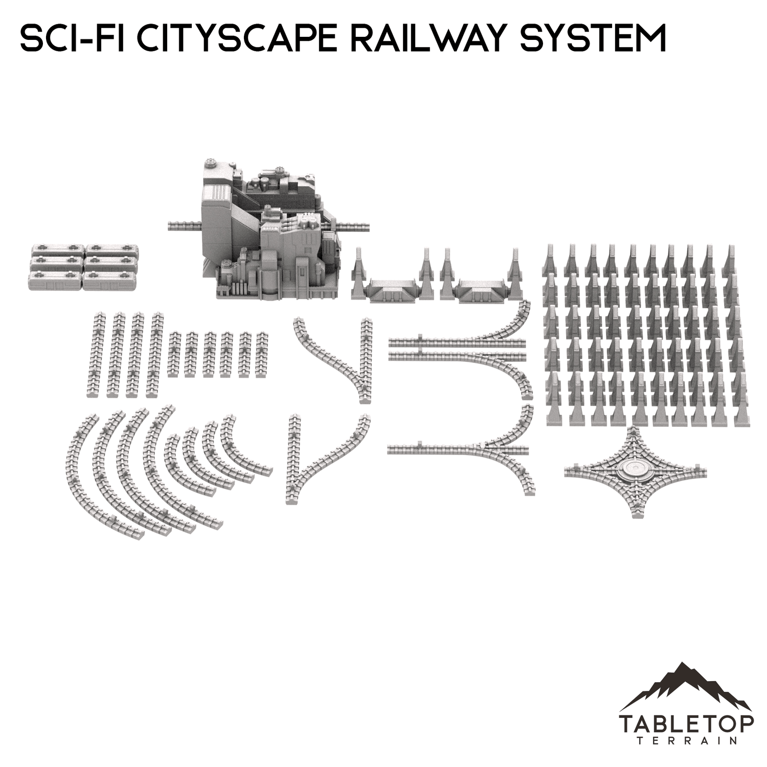 Estación de Tren, 6 vagones de vía, 30 piezas de vía, dos estaciones de acceso de viajeros, 50 puestos de vía elevados.