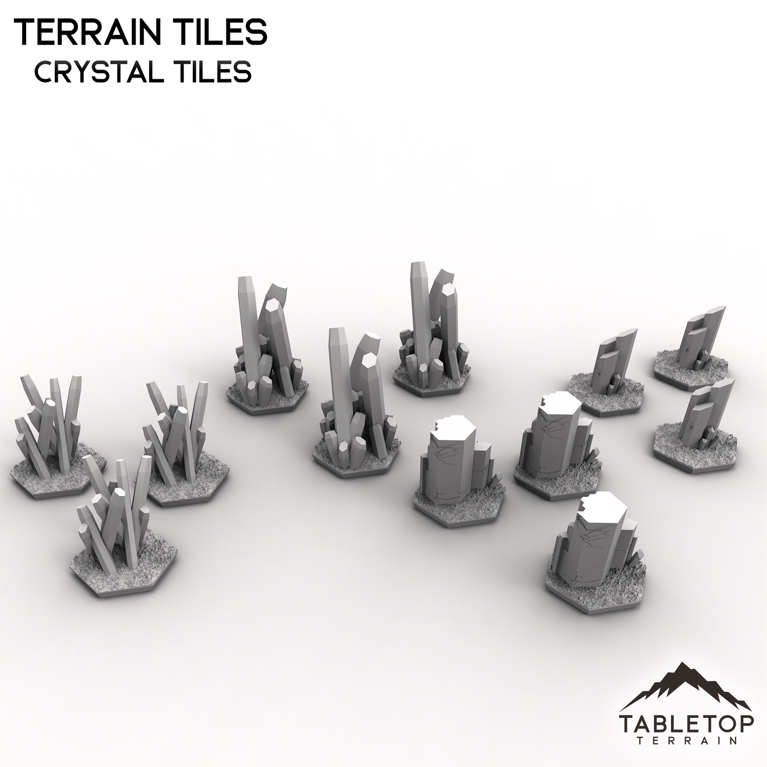 Baldosas de cristal: 12 baldosas de terreno. 3x Crystal Cluster ligero, 3x Crystal Cluster Heavy, 2x Cystal Spire A, 2x Crystal Spire B, 2x Crystal Spire C.