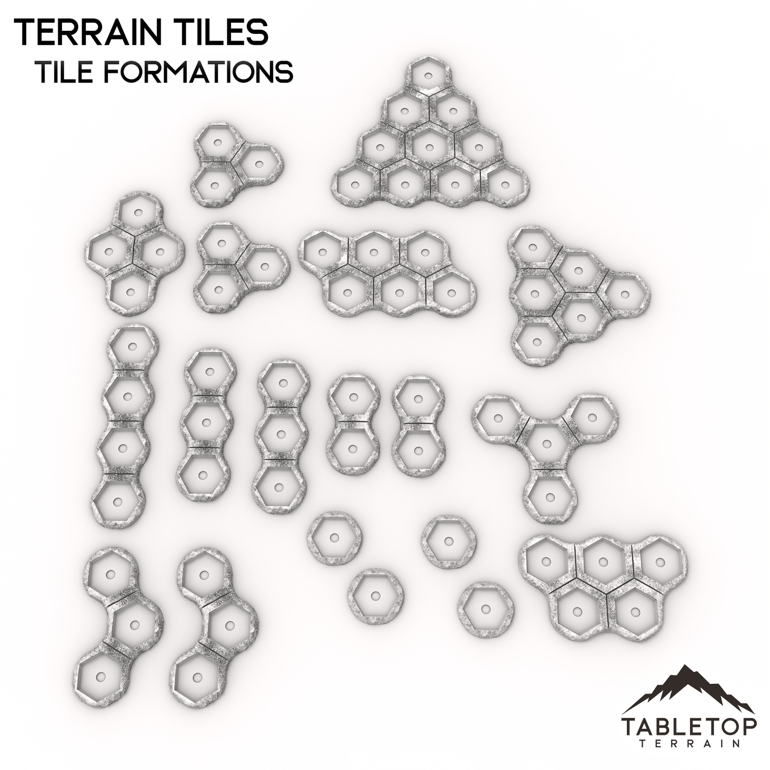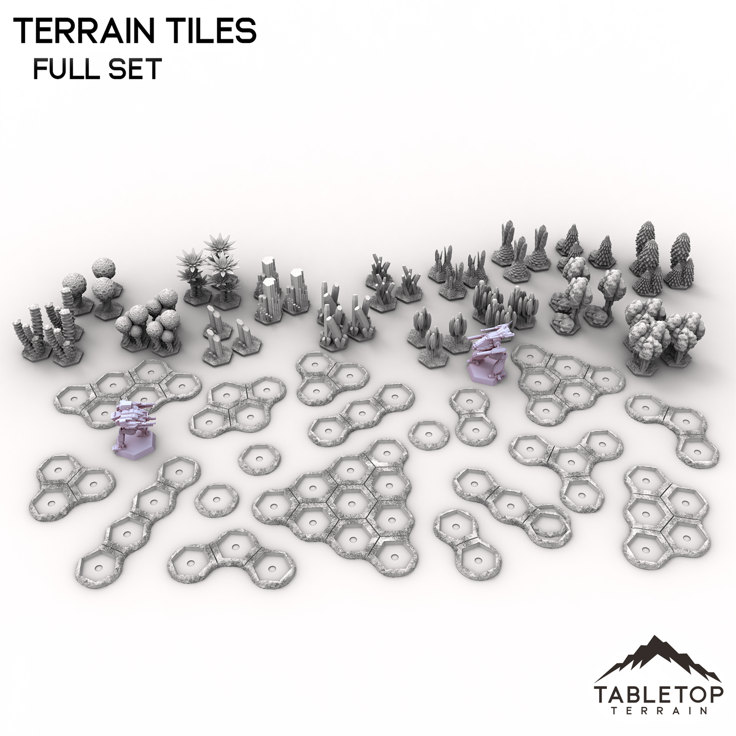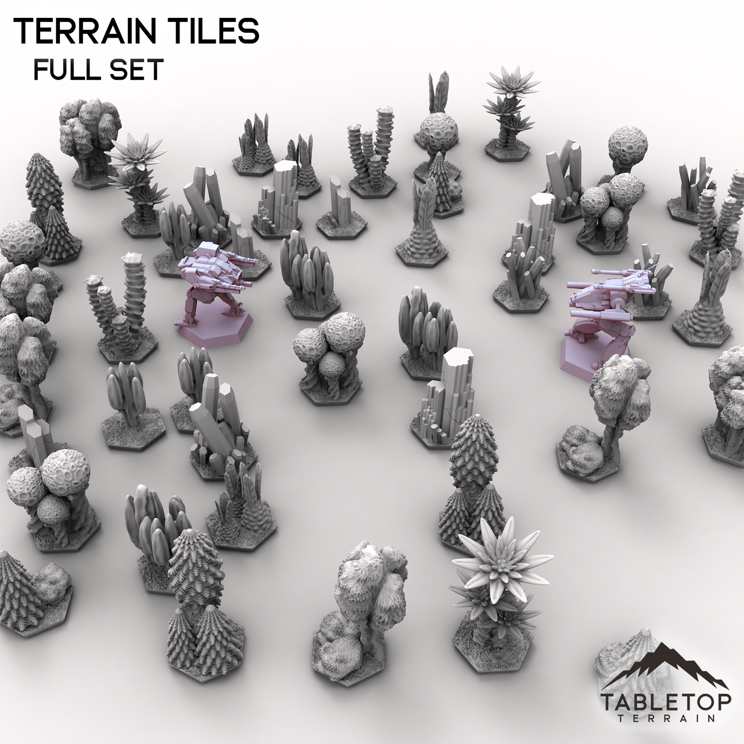 Desde grupos de densos cristales naturales hasta imponentes hongos alienígenas y densos bosques, ningún campo de batalla está exento de obstáculos. Estos mosaicos de terreno son perfectos para poblar tu campo de batalla hexagonal con una variedad de complicaciones temáticas para tus pilotos y guerreros.