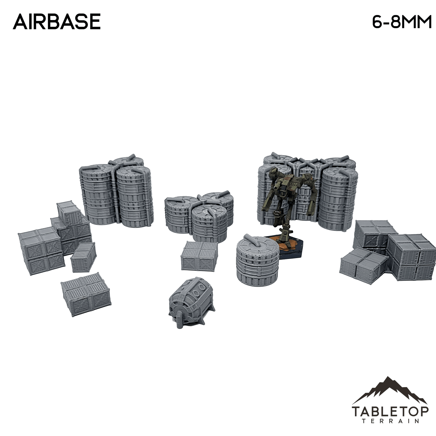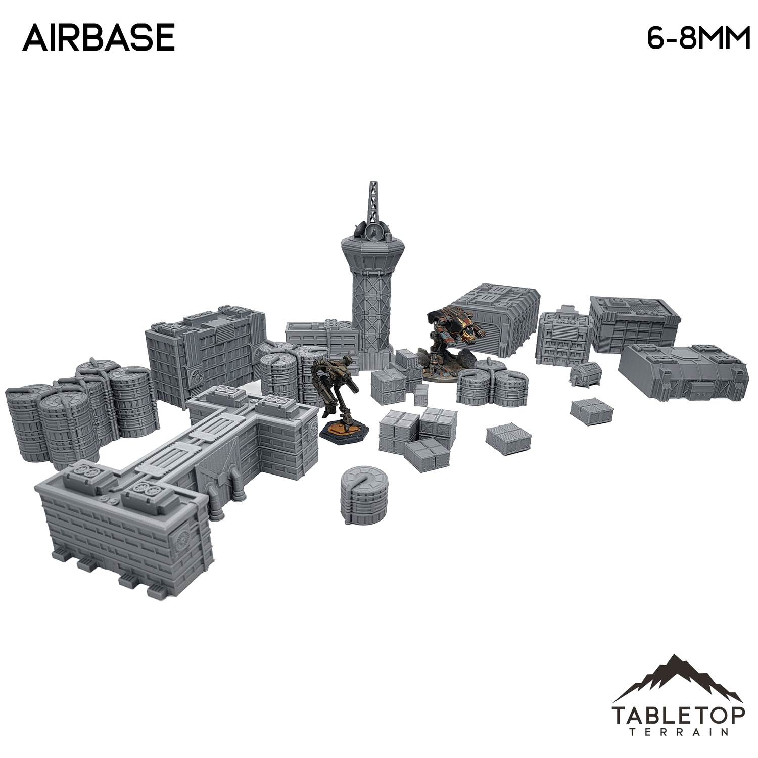 La base aérea de Mecha City se compone de cuatro edificios de oficinas de gran tamaño, una torre de control del tráfico aéreo, un hangar para vehículos, un depósito de armamento, tanques de combustible y contenedores de envío. Puedes elegir si quieres o no que tu conjunto se suministre con hexágonos. Funcionaría muy bien en cualquier juego de guerra de mesa a escala mecánica de 6 mm.
