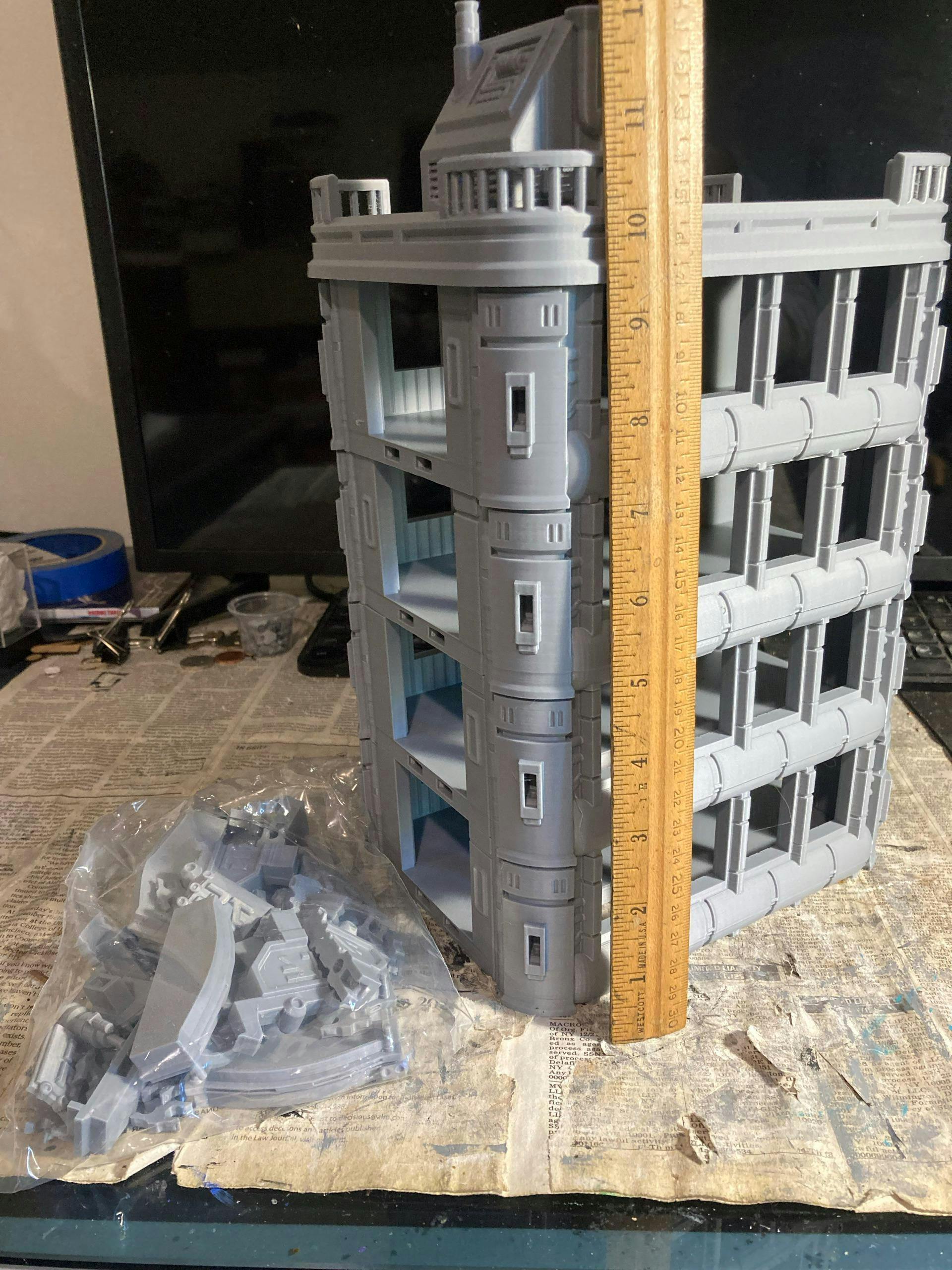 En escala de 28-35 mm, el edificio mide 191 x 136 x 209 mm / 7,5 x 5,4 x 8,2 pulgadas.