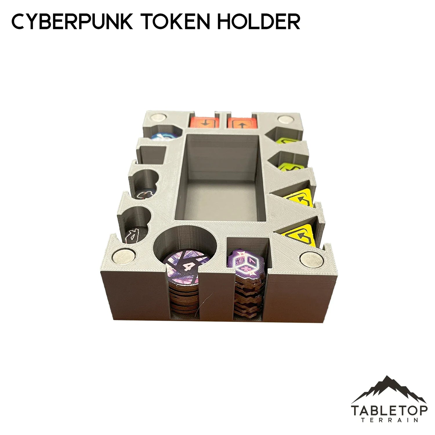 Un conjunto de fichas, dados y tarjeteros para juegos de mesa. Este soporte para fichas tiene la marca "Cyberpunk" en la tapa y tiene ranuras para varias fichas, como las fichas compatibles con Cyberpunk Red: Combat Zone. Tabletop Terrain no está afiliado a Monster Fight Club ni al juego Cyberpunk Red: Combat Zone.