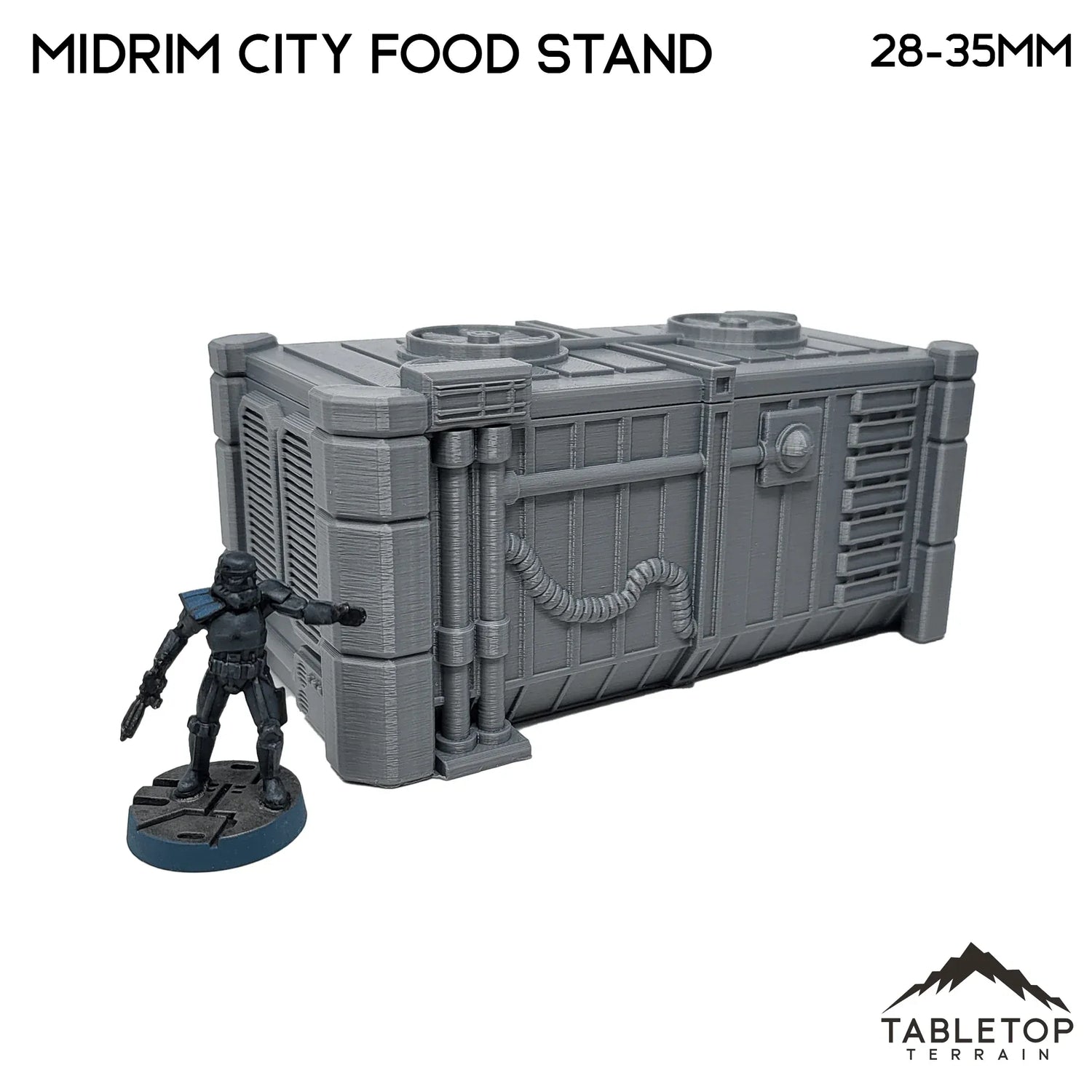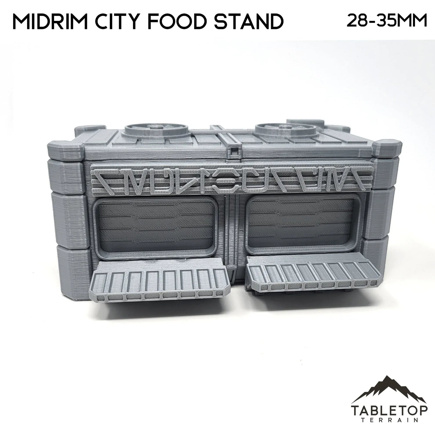 El puesto de comida de Midrim City funcionaría muy bien para Star Wars Legion u otros juegos de ciencia ficción. Funcionaría perfectamente para Star Wars Legion, Shatterpoint u otros juegos de ciencia ficción. El puesto de comida está impreso en escalas de 40 mm, 28-35 mm (1:47), 20 mm y 15 mm; otras escalas están disponibles a pedido. Se recomienda la escala de 40 mm para Shatterpoint y la escala de 28-35 mm para Legion.