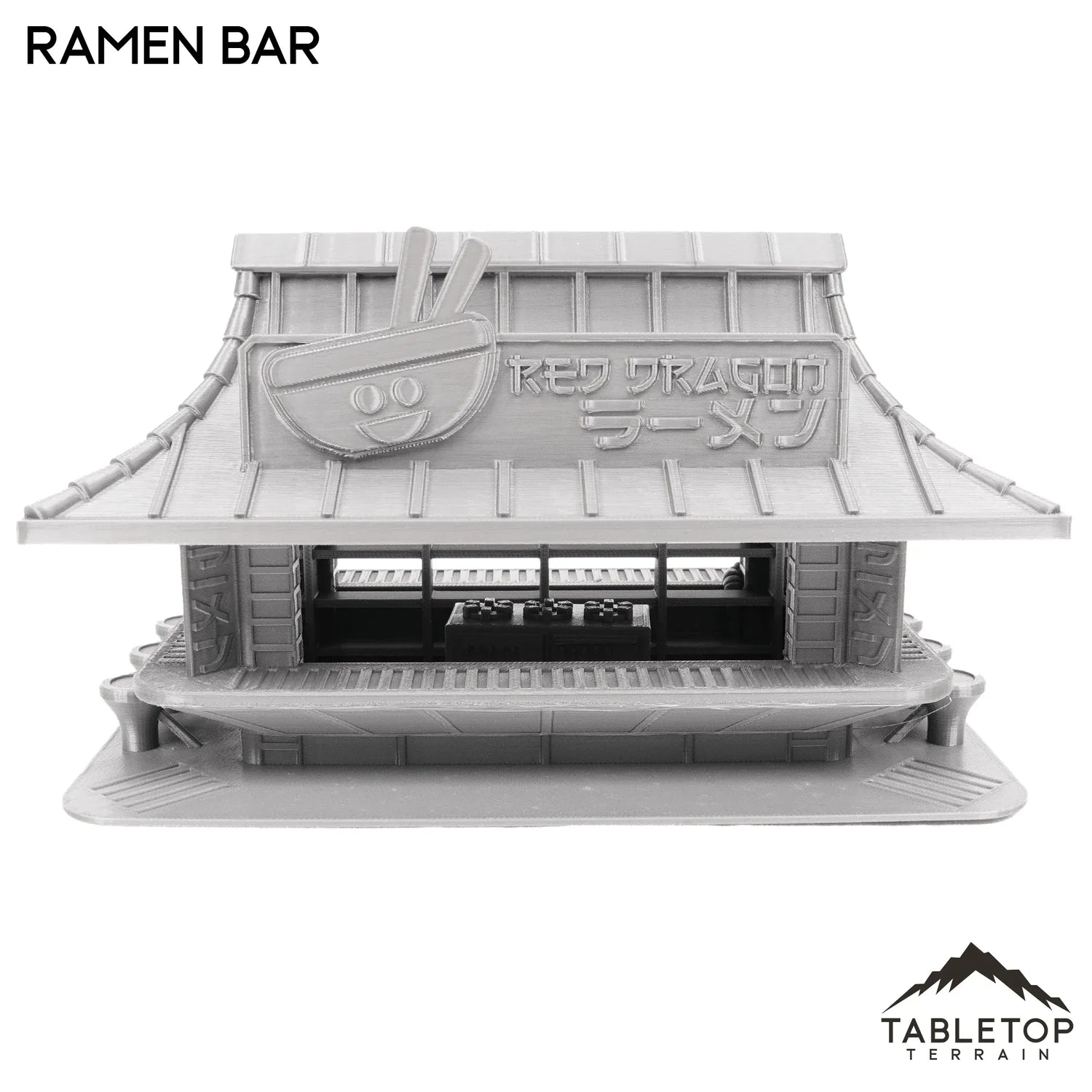 El Ramen Bar es un pequeño puesto de ramen de estilo futurista. Viene con la barra de ramen, el techo, la estantería y la estación de cocina. Hay dos variaciones de techos disponibles: la barra A es un techo abovedado alto y la barra B es un techo redondeado más corto. La barra de ramen está disponible en escalas de 32 mm, 28 mm, 20 mm y 15 mm. Este edificio es una gran adición a una mesa futurista para juegos como Stargrave o Cyberpunk Red.