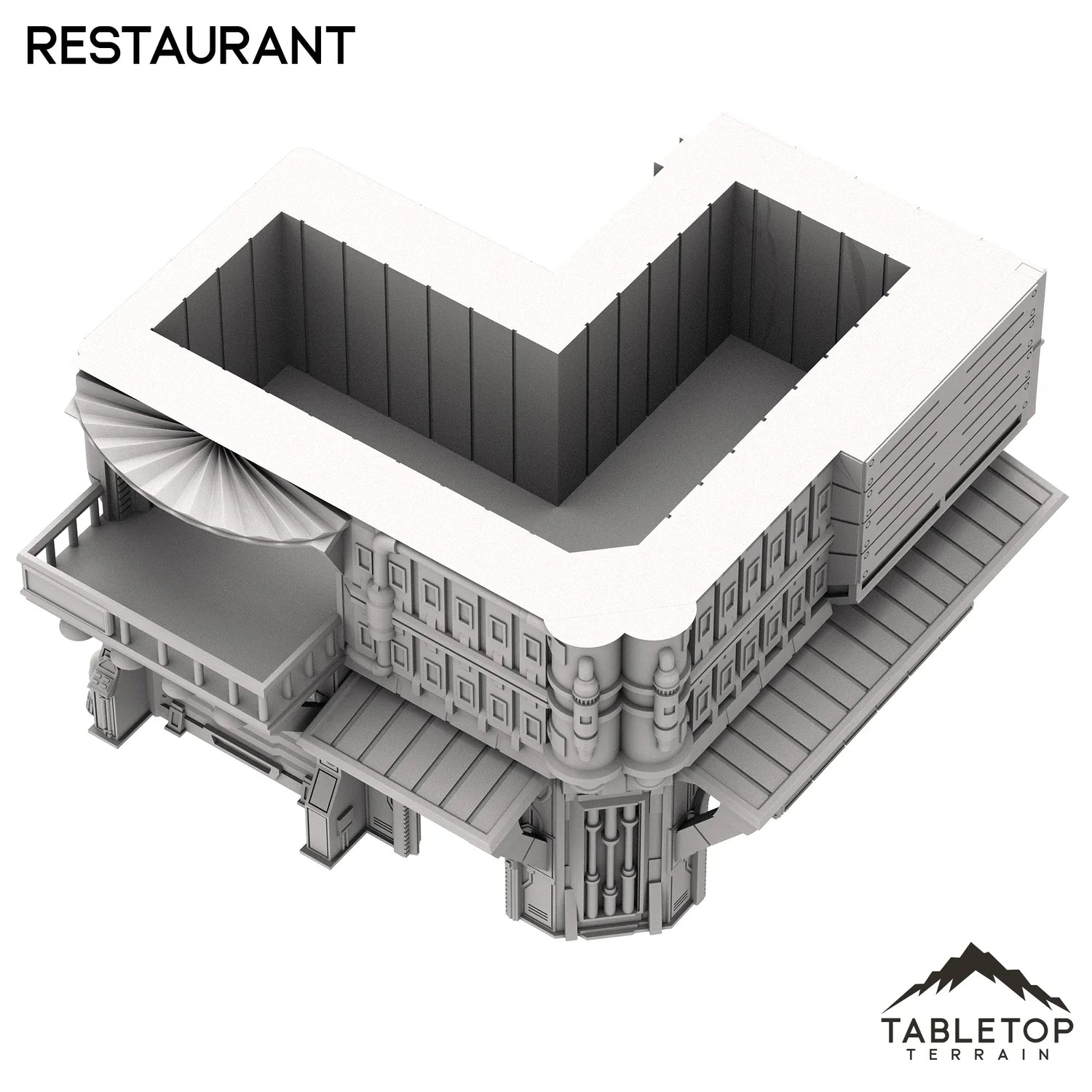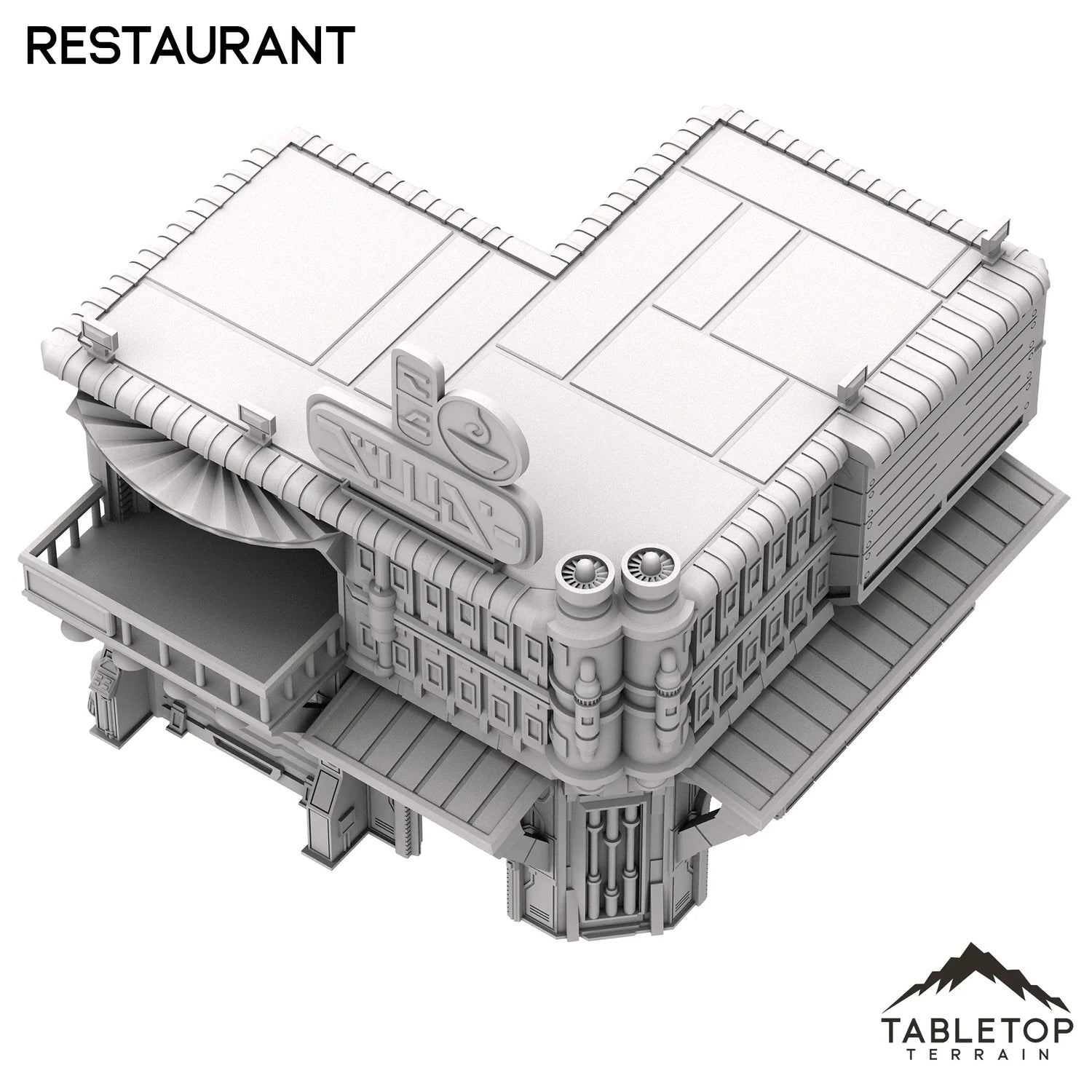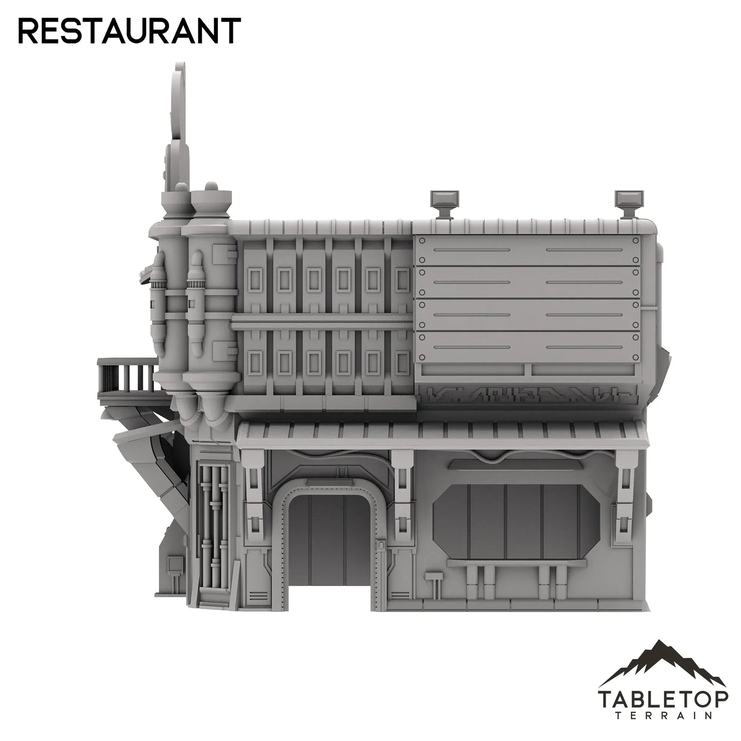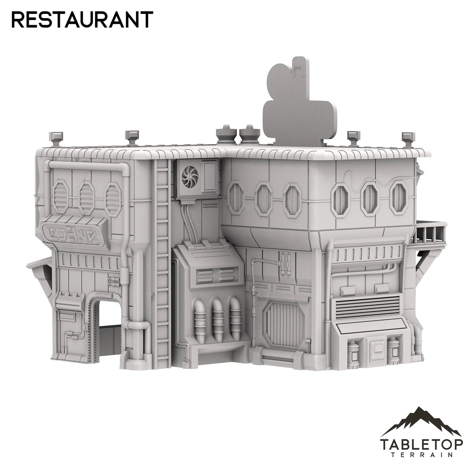 El set del restaurante está diseñado para imitar la apariencia de un pequeño local en una ciudad de ciencia ficción. El edificio cuenta con un par de entradas y toldos, así como un segundo piso utilizable con espacio para miniaturas en el interior. Todo el set está hecho para agregar variedad a una mesa de ciencia ficción más grande y ayudar a que la ciudad parezca habitada. El restaurante está hecho para juegos de mesa de ciencia ficción, pero podría funcionar con cualquier género.