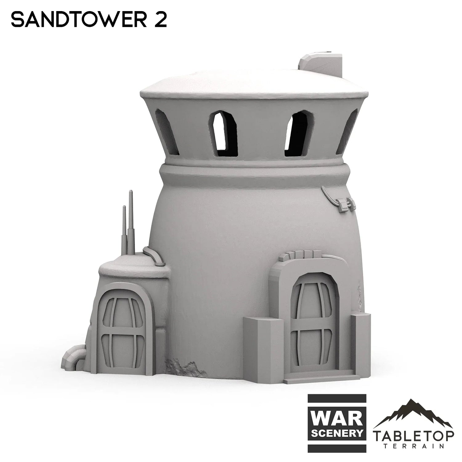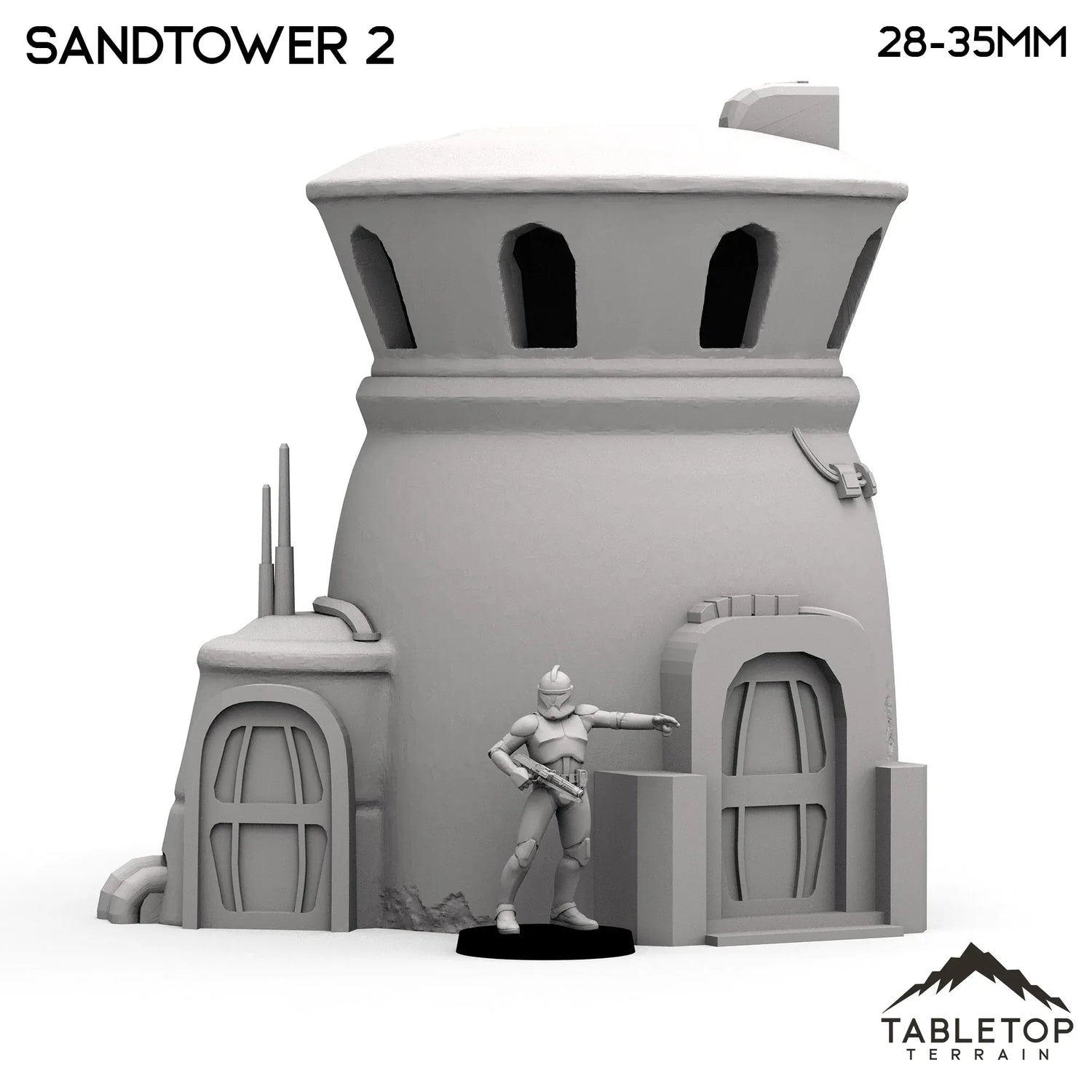 Desert Sandtower 2 es un edificio de varios niveles con una estructura lateral y entrada . Funcionaría muy bien para Star Wars Legion, Shatterpoint u otros juegos de ciencia ficción. La Torre está impresa en escalas de 40 mm, 28-35 mm (1:47), 20 mm y 15 mm; otras escalas están disponibles a pedido. Se recomienda la escala de 40 mm para Shatterpoint y la escala de 28-35 mm para Legion.