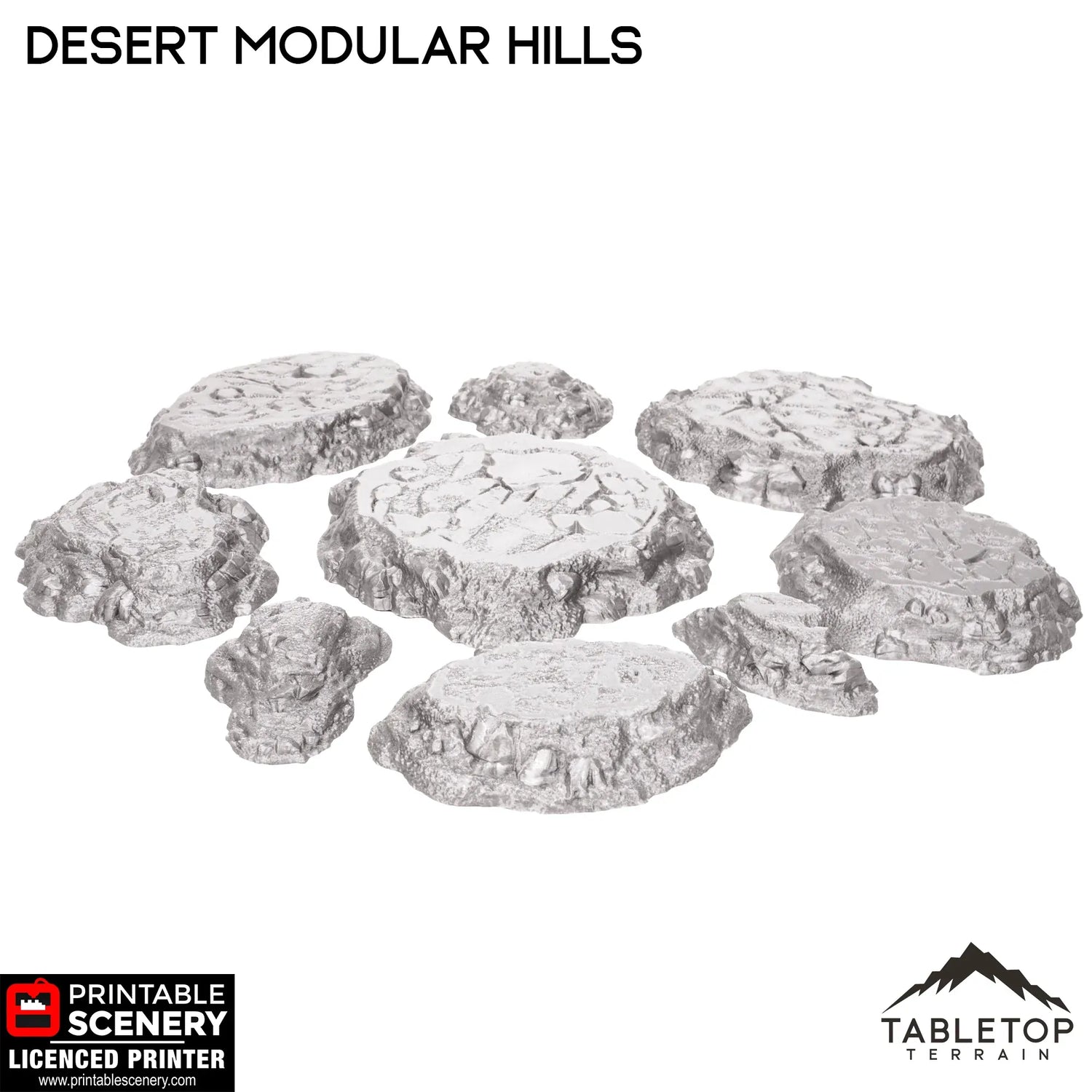 Las colinas modulares encajarán a la perfección en una batalla de mesa de Star Wars Legion o en cualquier otra escena de planeta desértico. Se apilan en 3 formaciones o se pueden mantener planas para formar 9 colinas independientes.