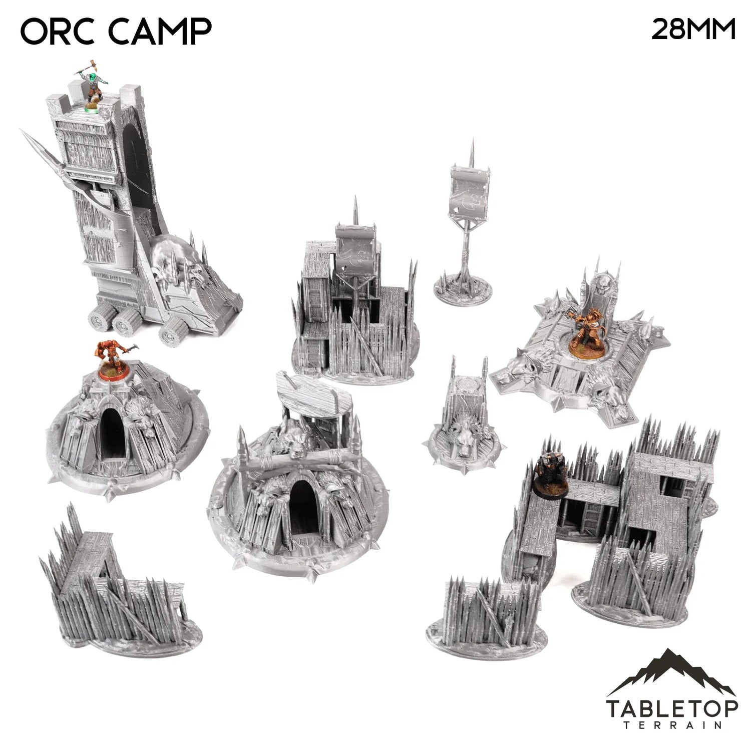 Orc Camp es un conjunto de terreno de mazmorra temático. Compuesto por varias piezas, puedes crear una experiencia de mazmorra completa a partir de este conjunto. Combina detalles de fantasía y ciencia ficción, lo que lo hace ideal para ambos géneros.