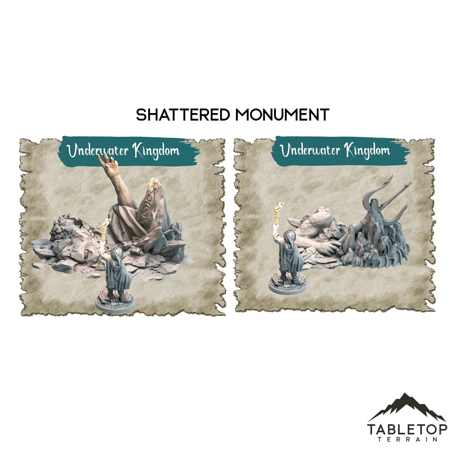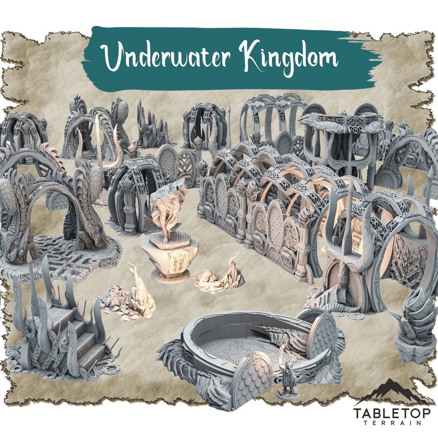 Underwater Kingdom es un conjunto de portales de mazmorras temáticas. Compuesto por varias piezas, puedes crear una experiencia de mazmorra completa a partir de este conjunto. Combina detalles de fantasía y ciencia ficción, lo que lo hace ideal para ambos géneros.