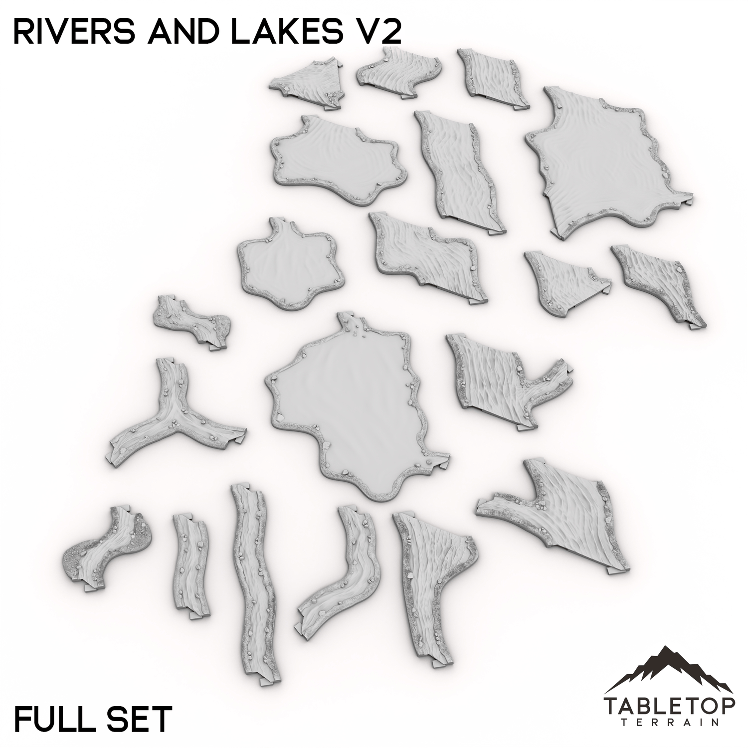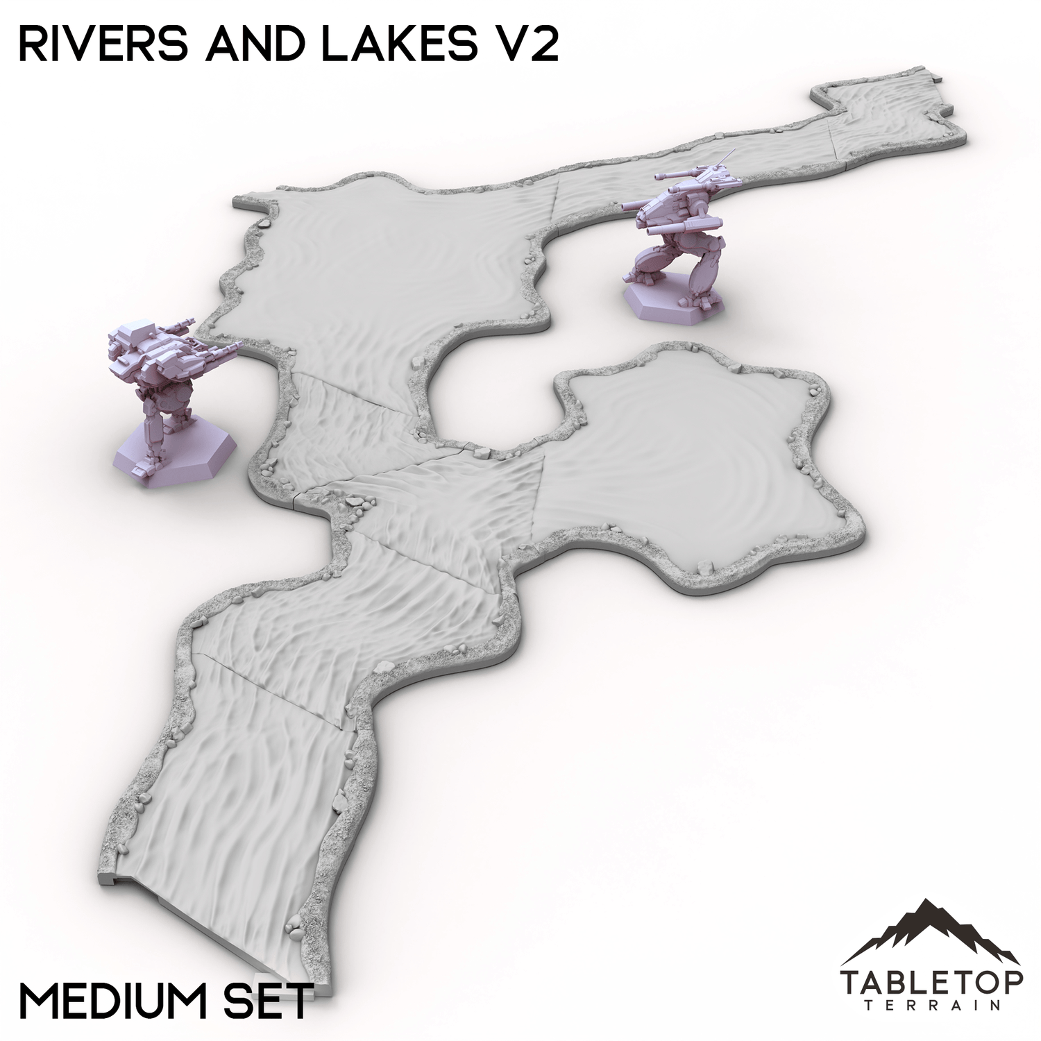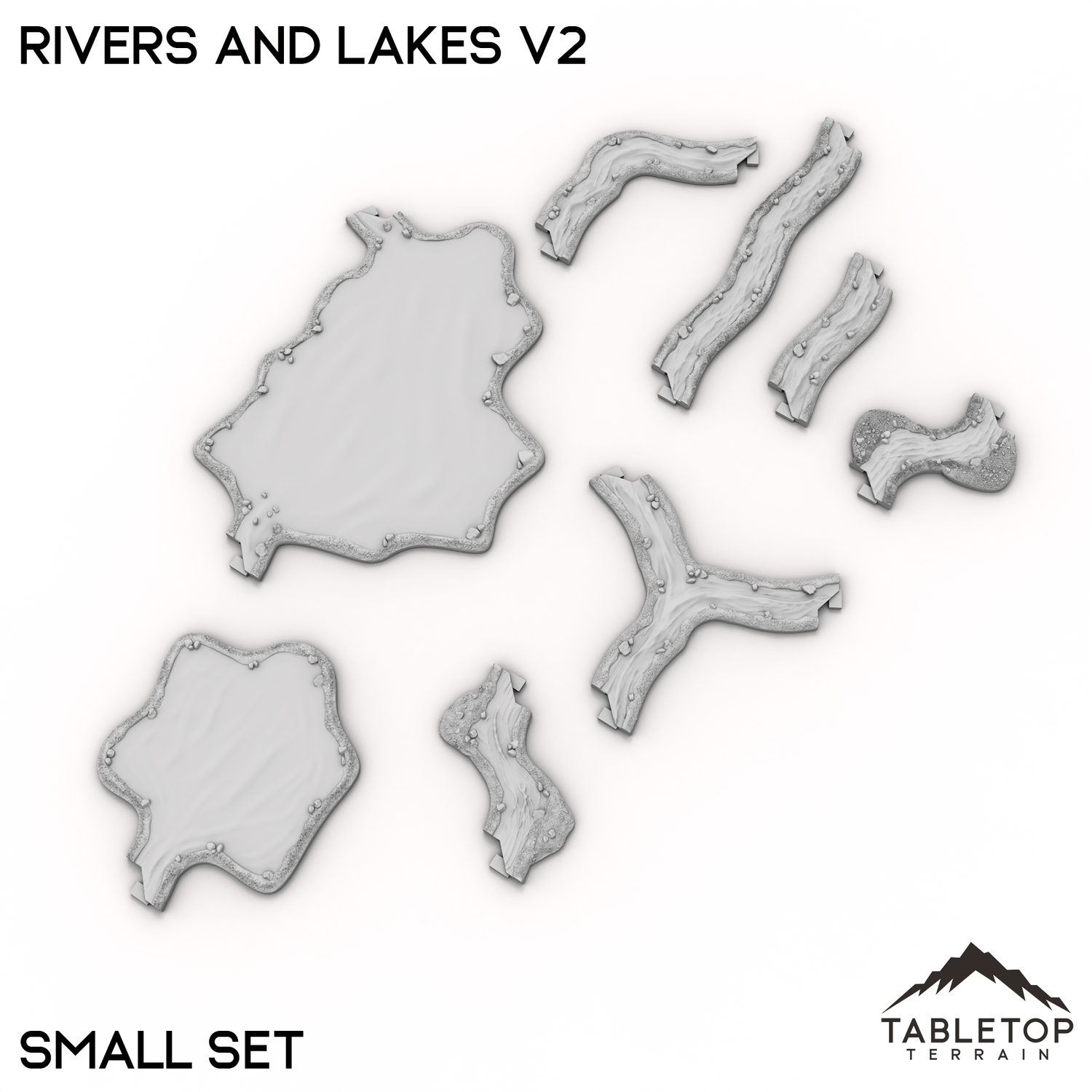 Rivers and Lakes Terrain Tiles es un conjunto de elementos de agua hexagonales para usar en sus mesas Hextech. Son totalmente modulares y no se pegan entre sí, por lo que se pueden utilizar en muchos diseños de mesa diferentes.