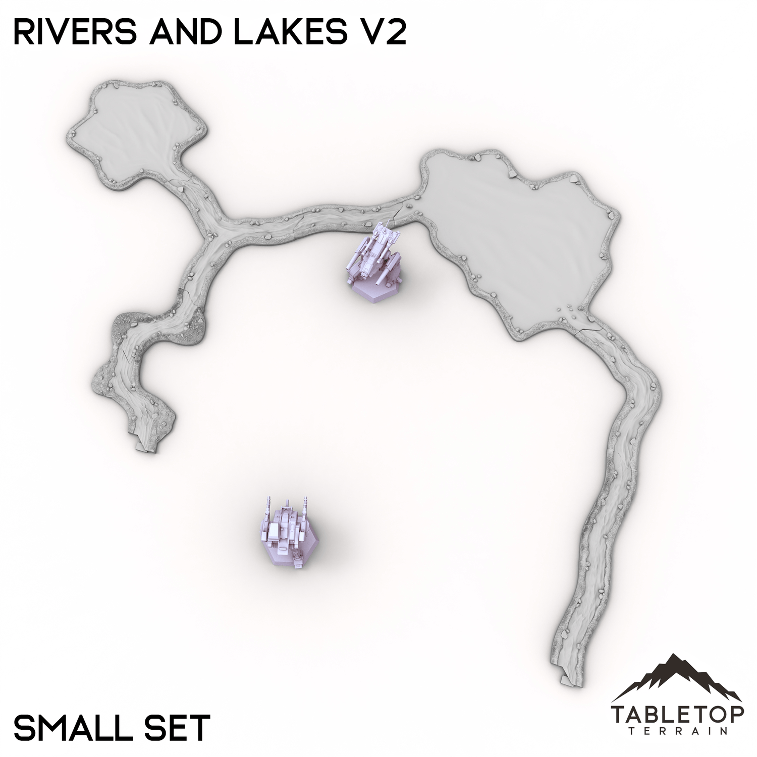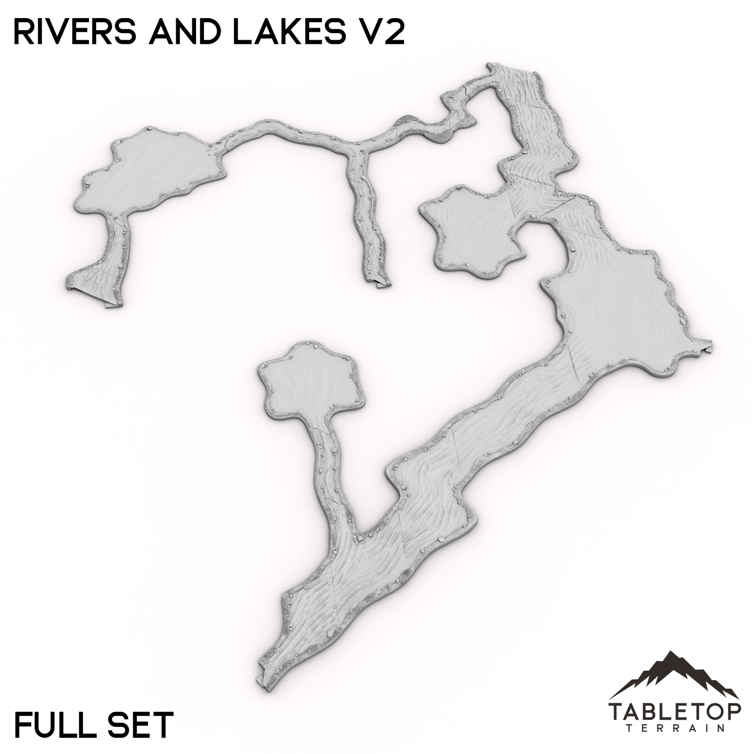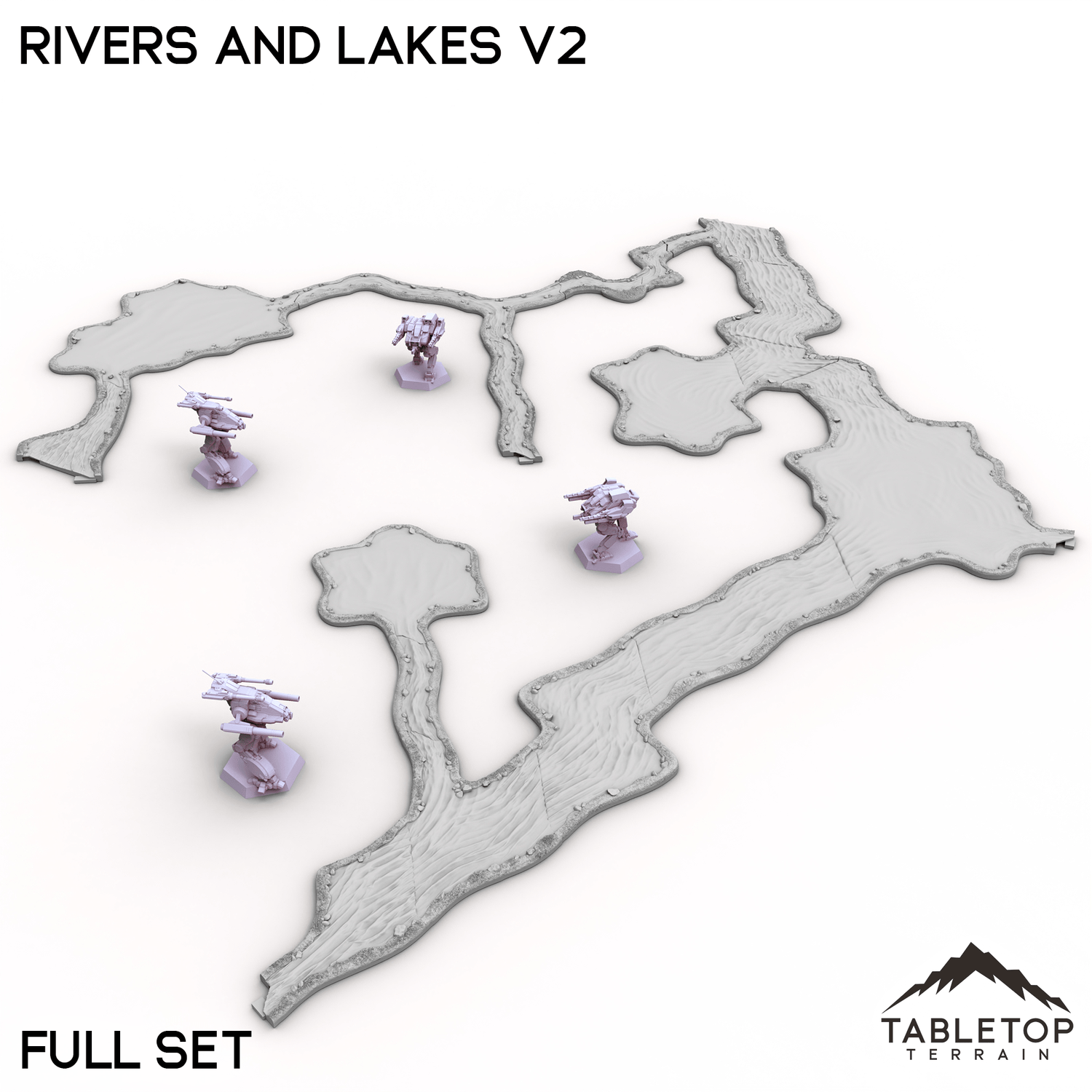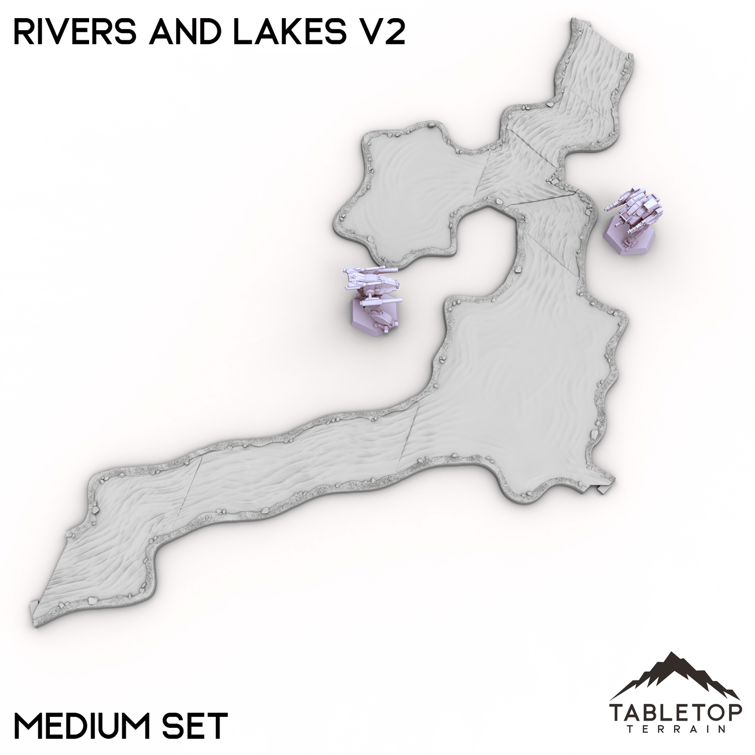 Rivers and Lakes Terrain Tiles es un conjunto de elementos de agua hexagonales para usar en sus mesas Hextech. Son totalmente modulares y no se pegan entre sí, por lo que se pueden utilizar en muchos diseños de mesa diferentes.