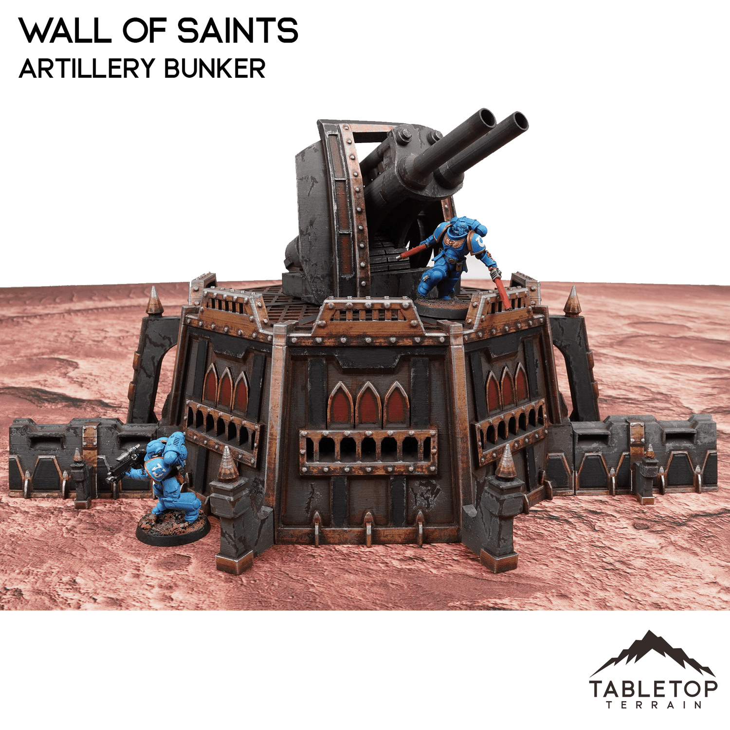 El conjunto Artillería forma parte de la colección Muro de los Santos. Este conjunto cuenta con un gran búnker con techo desmontable y un cañón doble montado. El interior de la artillería tiene ranuras abiertas para mayor visibilidad y mucho espacio para minis en el interior. La artillería de este conjunto puede funcionar sola en cualquier mesa o puede combinarse con cualquier otro conjunto de la colección Wall of Saints. El conjunto Artillery está diseñado para juegos de guerra de ciencia ficción, pero se puede utilizar con cualquier sistema.