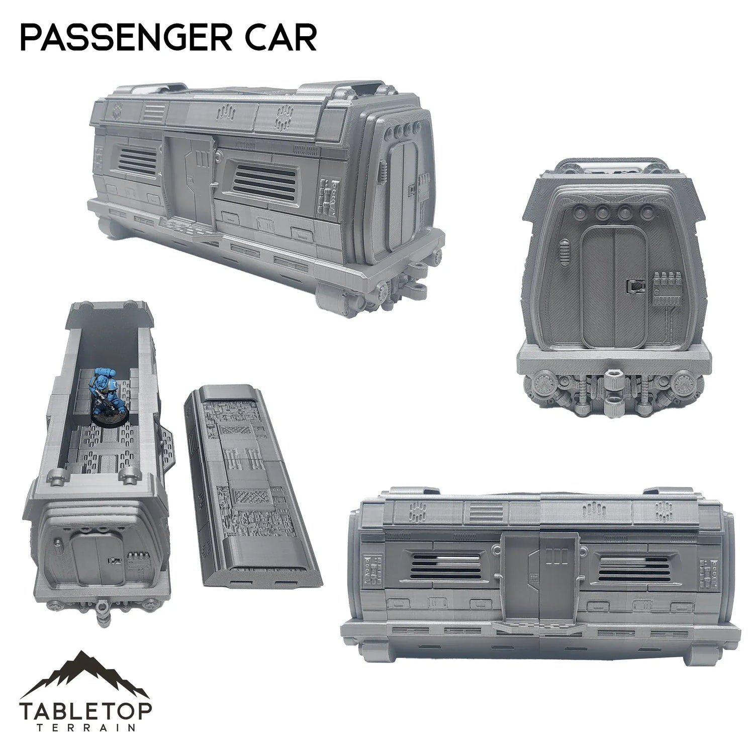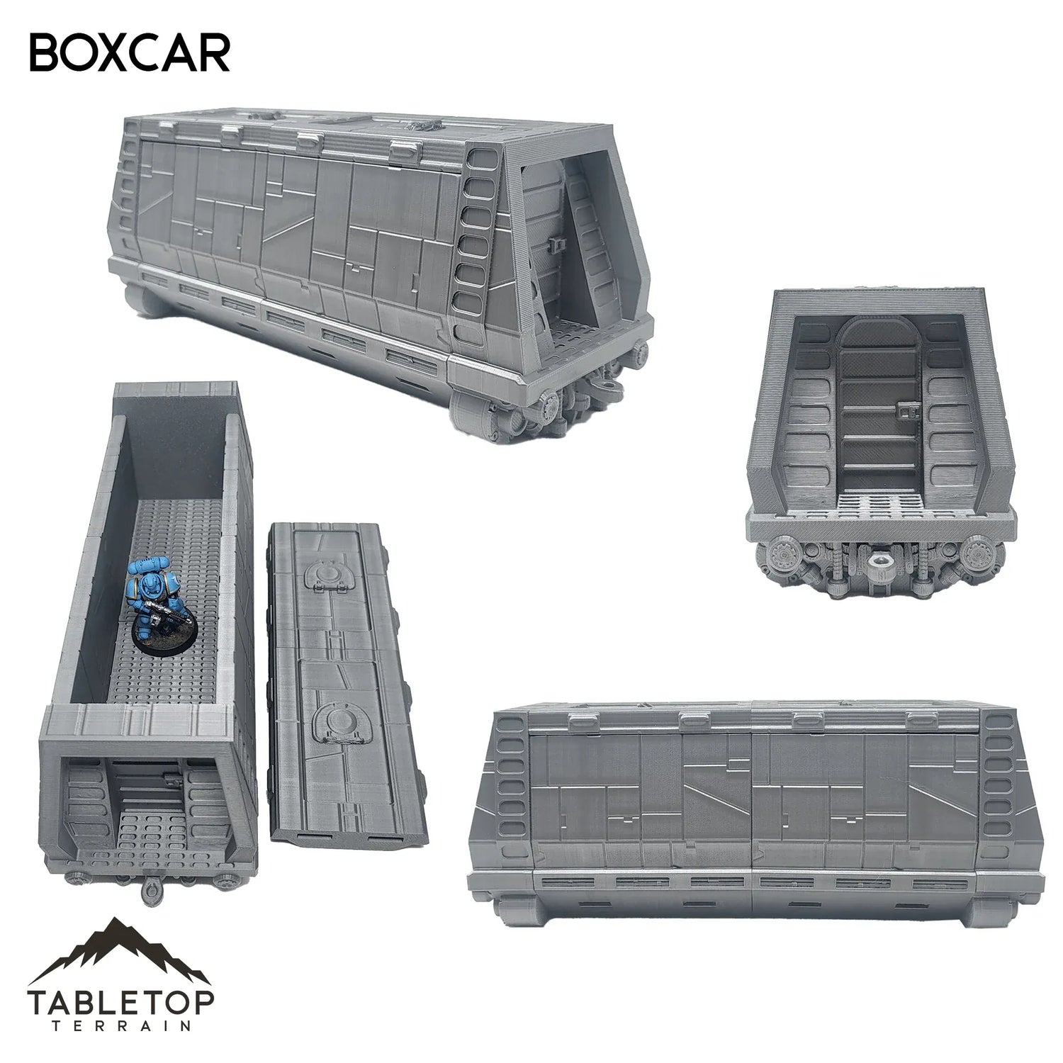 También hay disponibles cuatro escalas diferentes para elegir: 40 mm, 28-35 mm, 20 mm y 15 mm. En las imágenes a escala se muestra una figura de 28 mm para comparar. Cada vagón tiene el mismo largo y ancho y diferentes alturas. Cada tramo de tren mide: