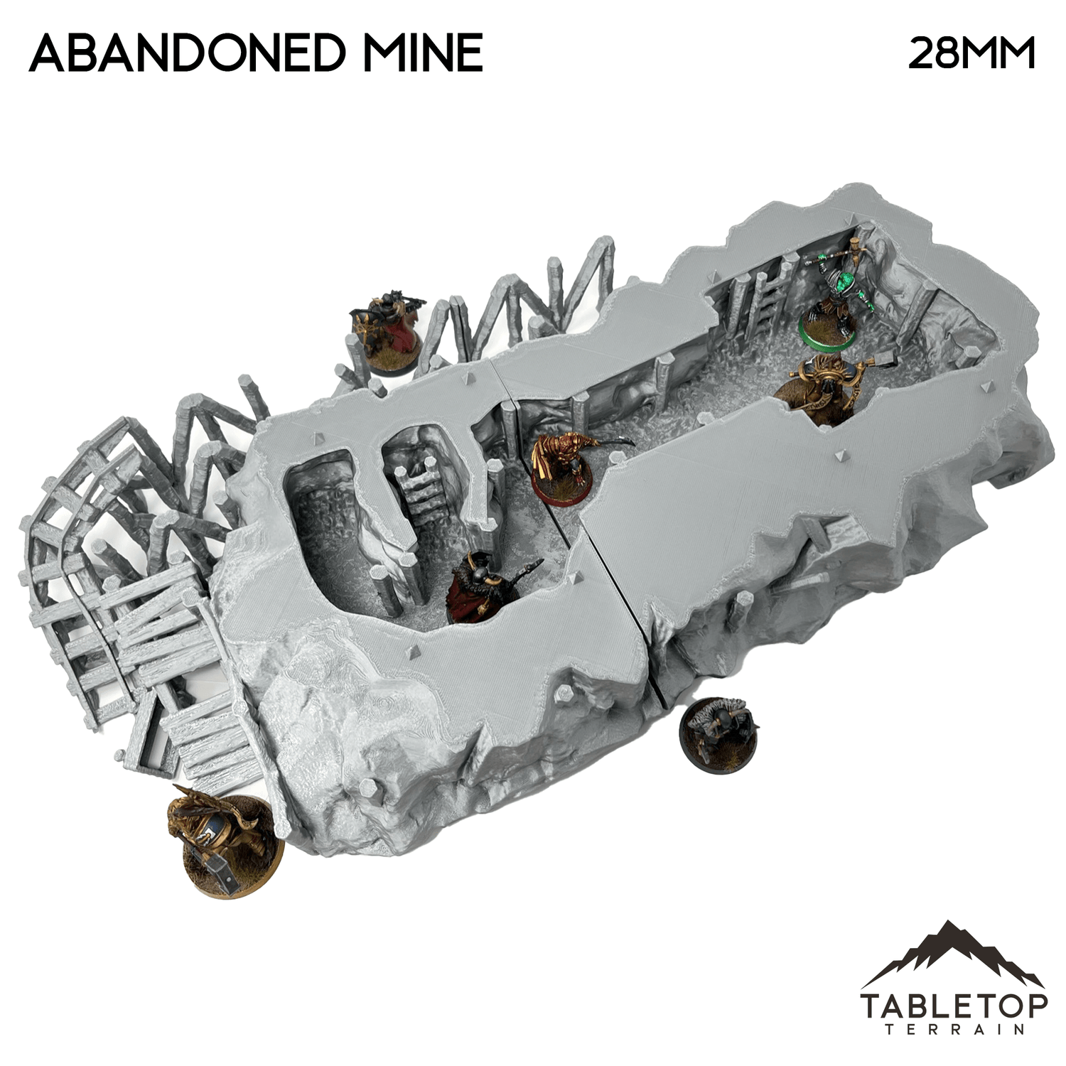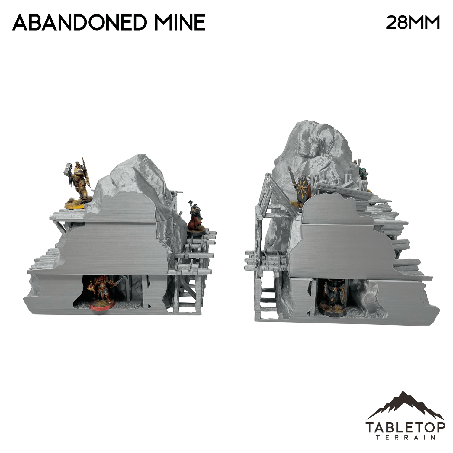 The Abandoned Mine is a mountainside with internal mine. It features an external mine cart track with two mine carts as well as a working pully system. The interior is big enough to fit miniatures and the mine is available in 32mm, 28mm, 20mm, and 15mm scales.