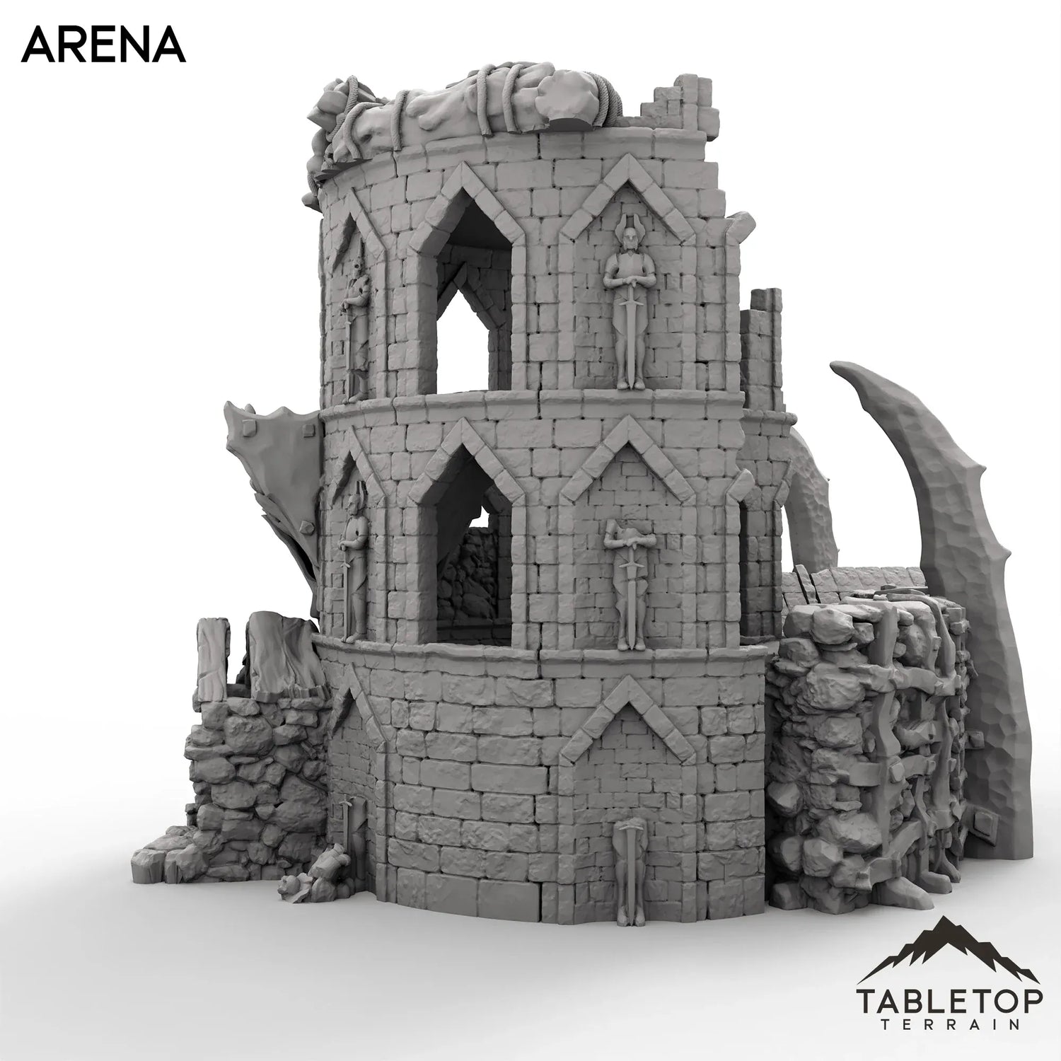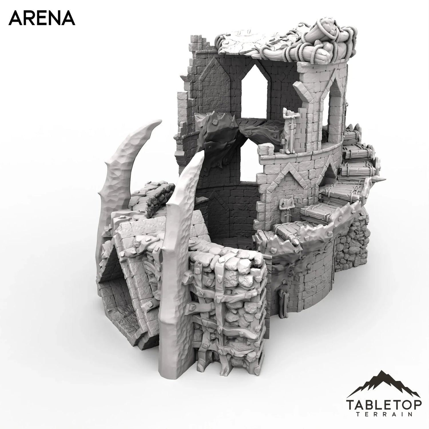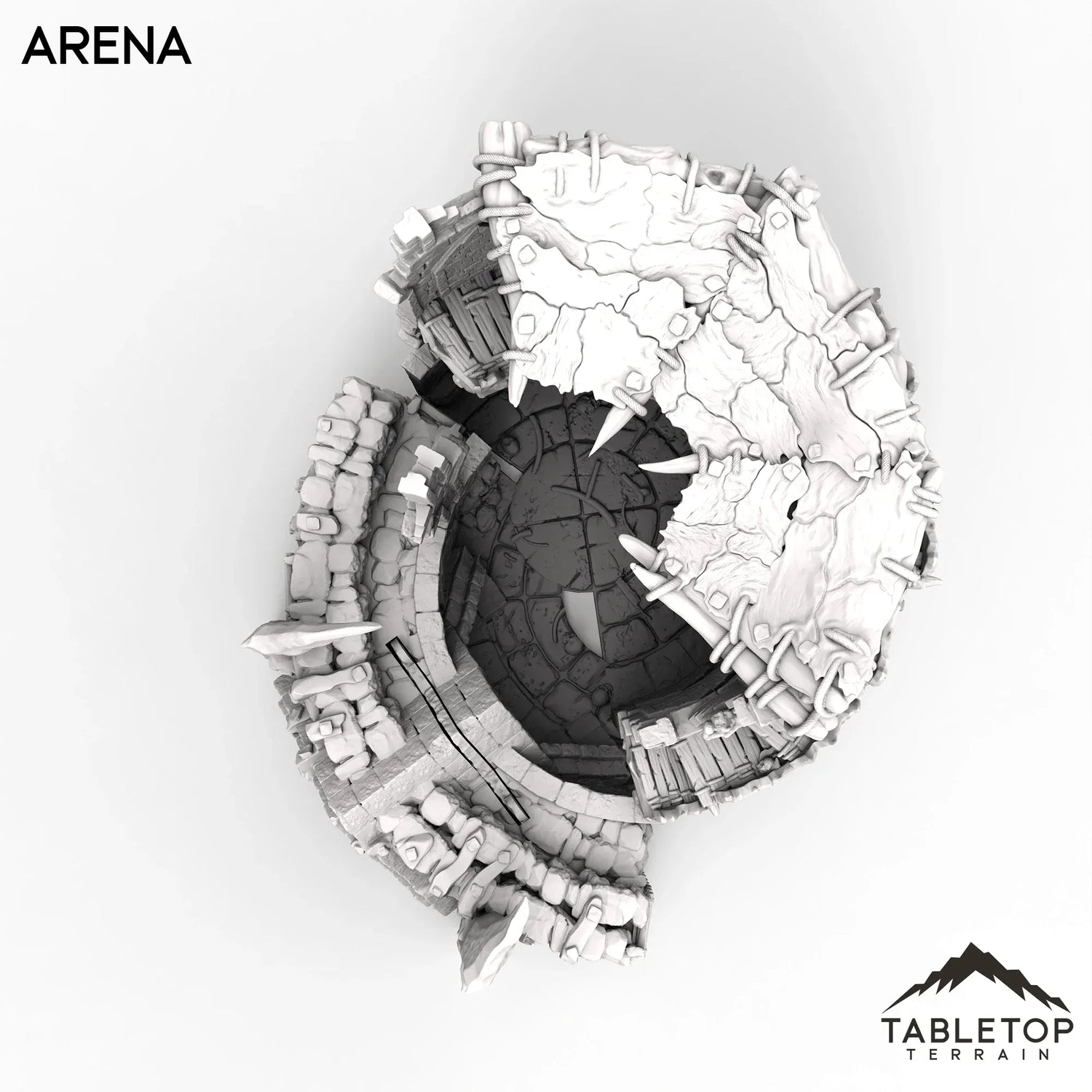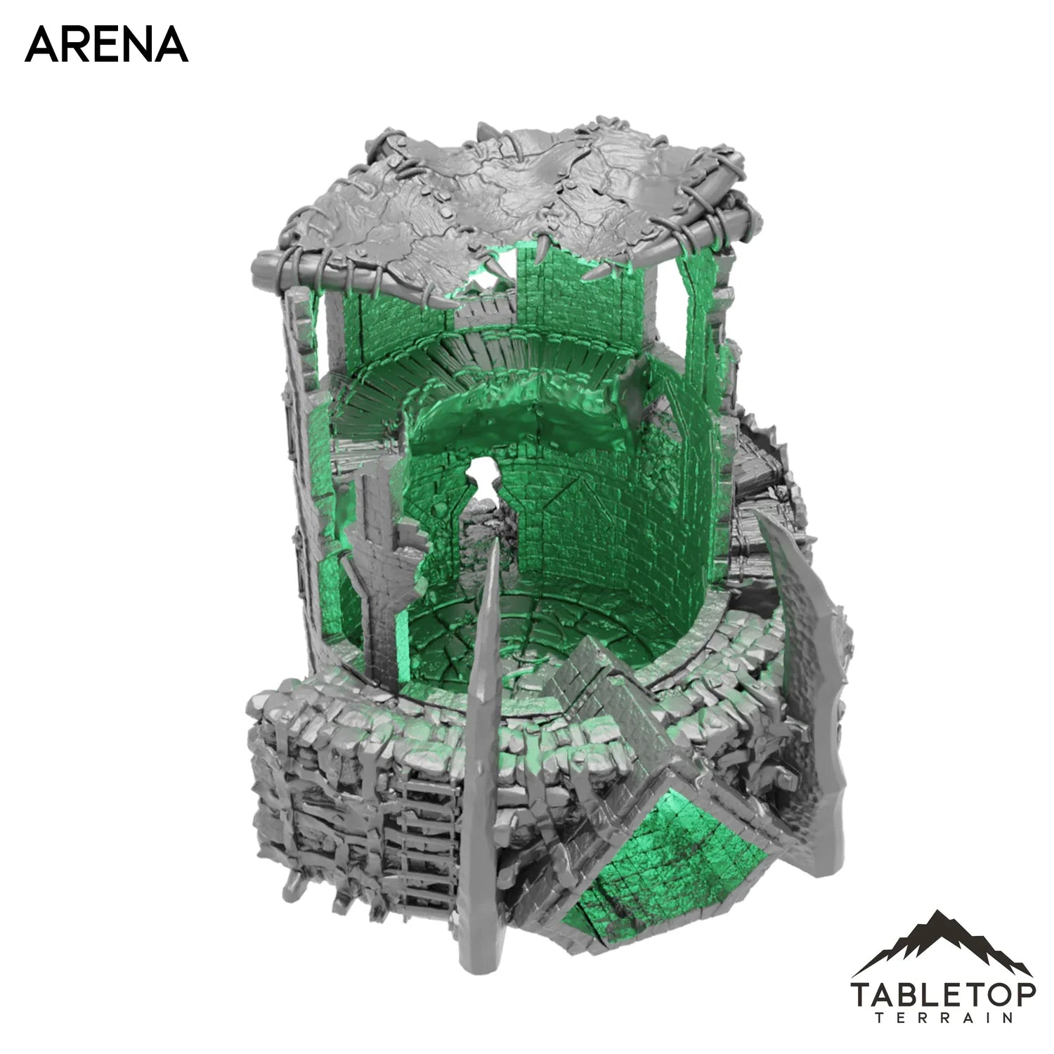 The Arena is a half-ruined watchtower, converted into a deadly ring with a removeable gate on one side. The inside of the model is detailed and textured, etched with crumbling stone and the remains of those who fought before. The Arena is made for fantasy tabletop games, but can work for any genre.