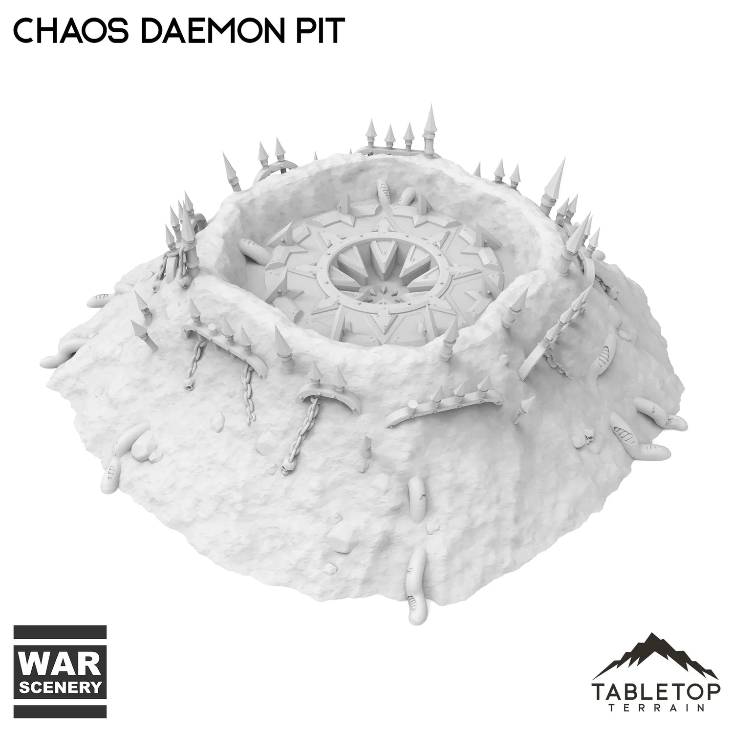 The Chaos Daemon Pit is a single-piece model designed to help it be easier for painting and storage. It's tall and wide enough to fit minis onto the opening of the pit, and has cruel spikes lining the sides. This set is from the Corrupted Sanctum collection, and matches other sets from that collection. It is designed for sci-fi wargames, but can be used with any system.