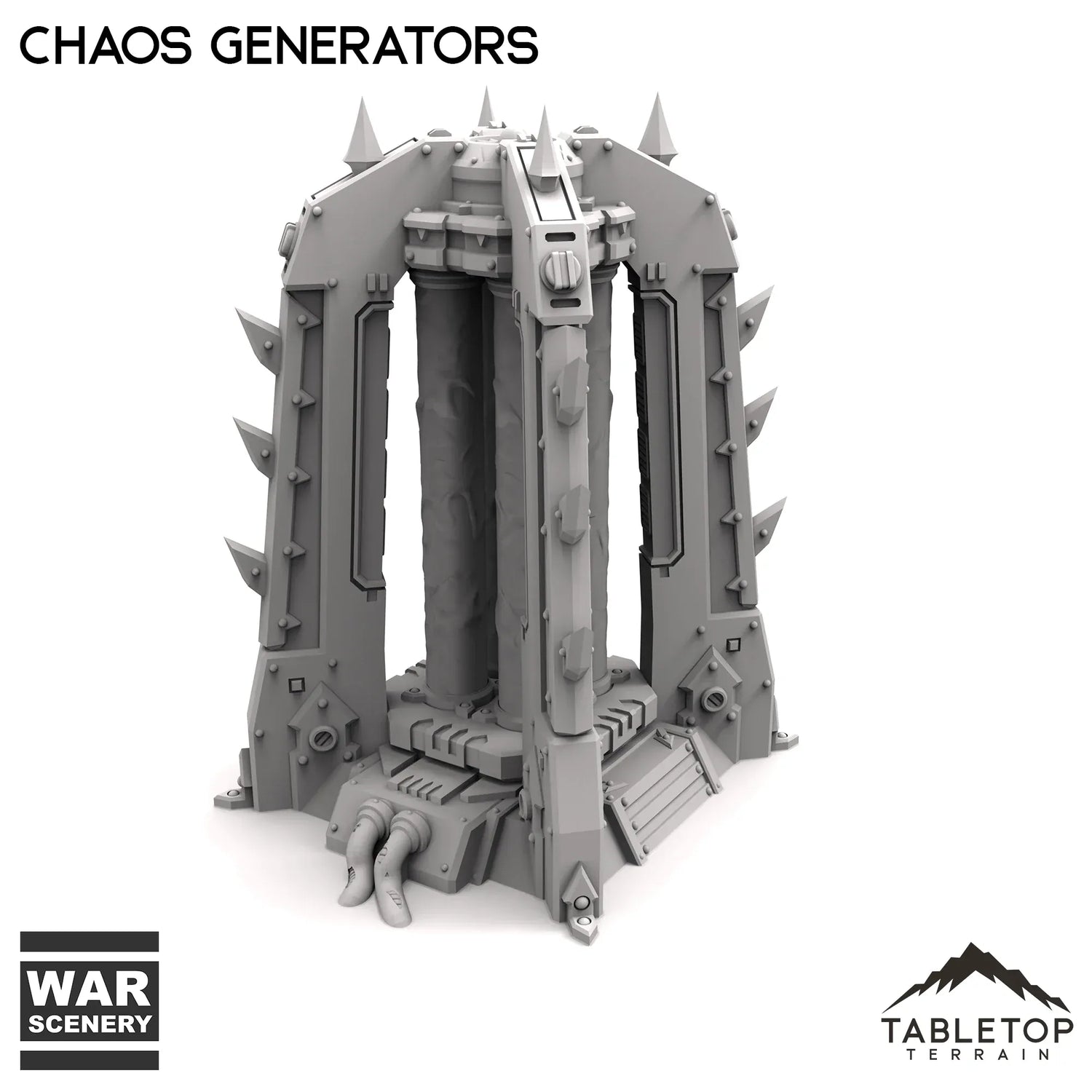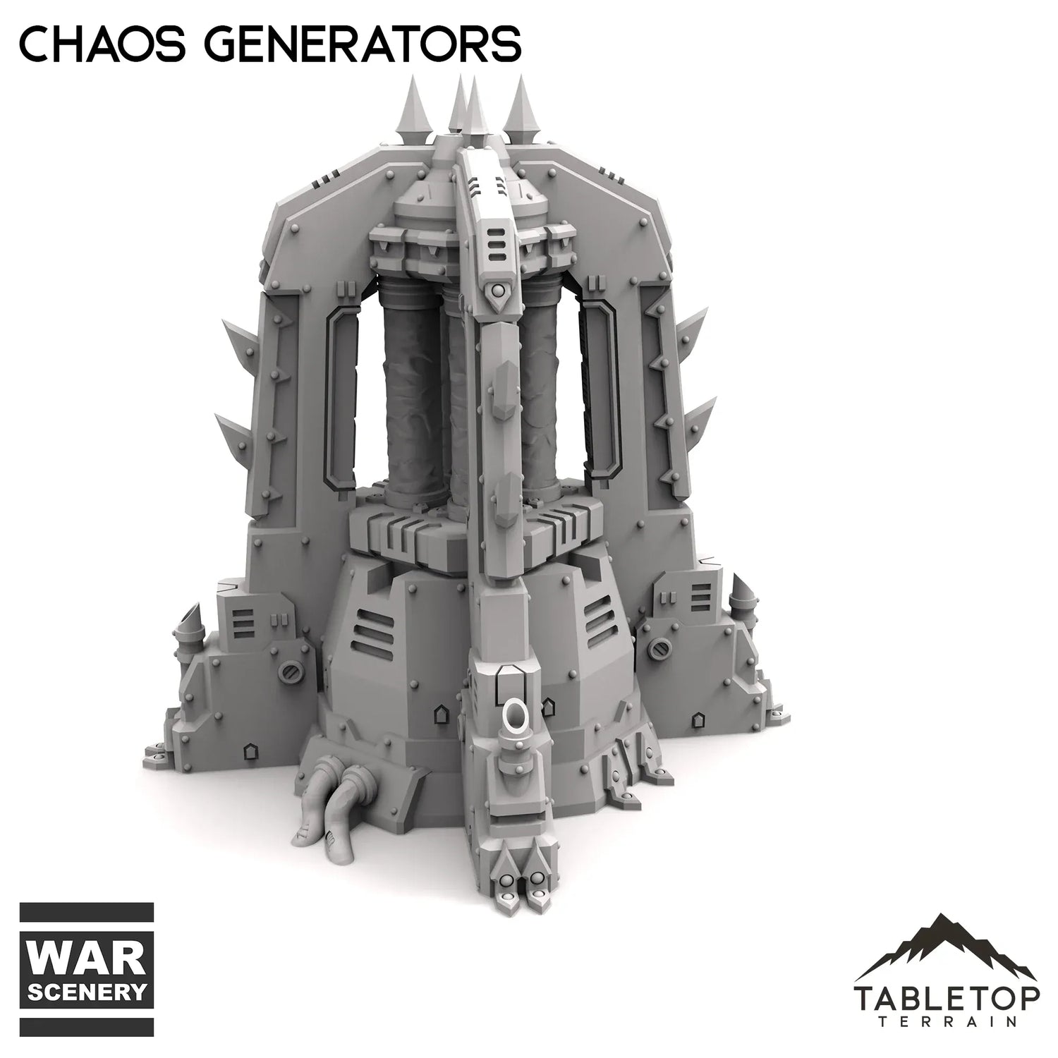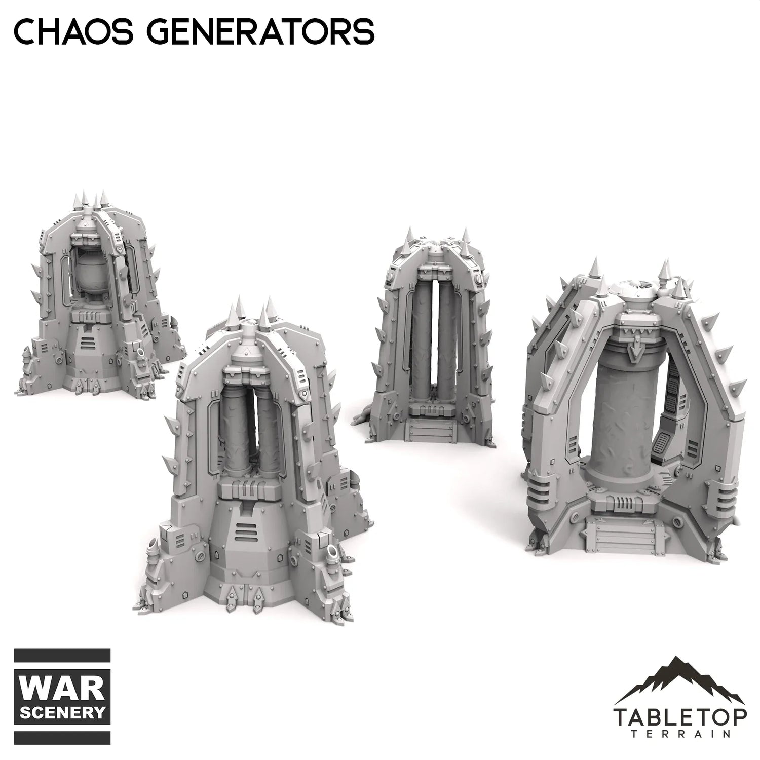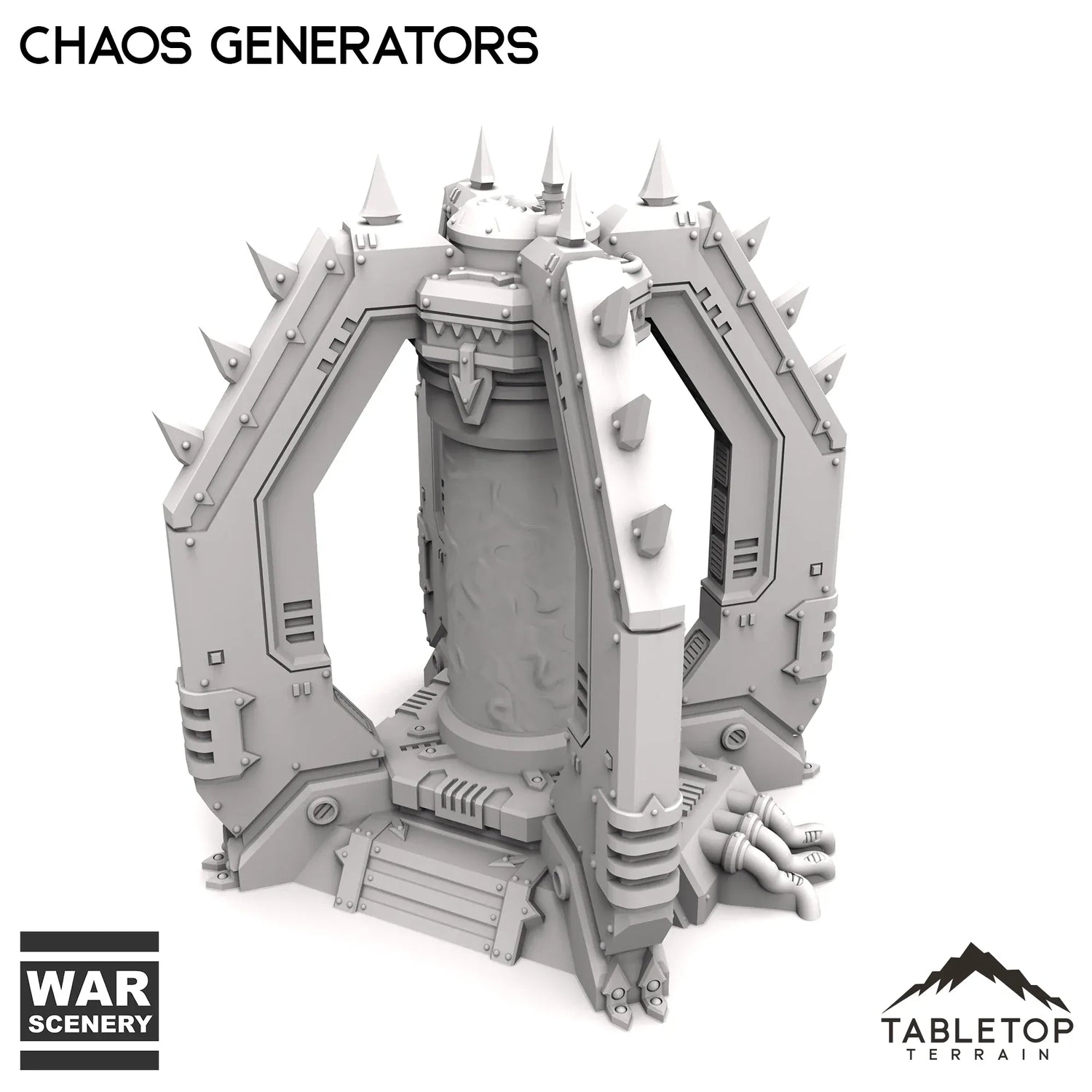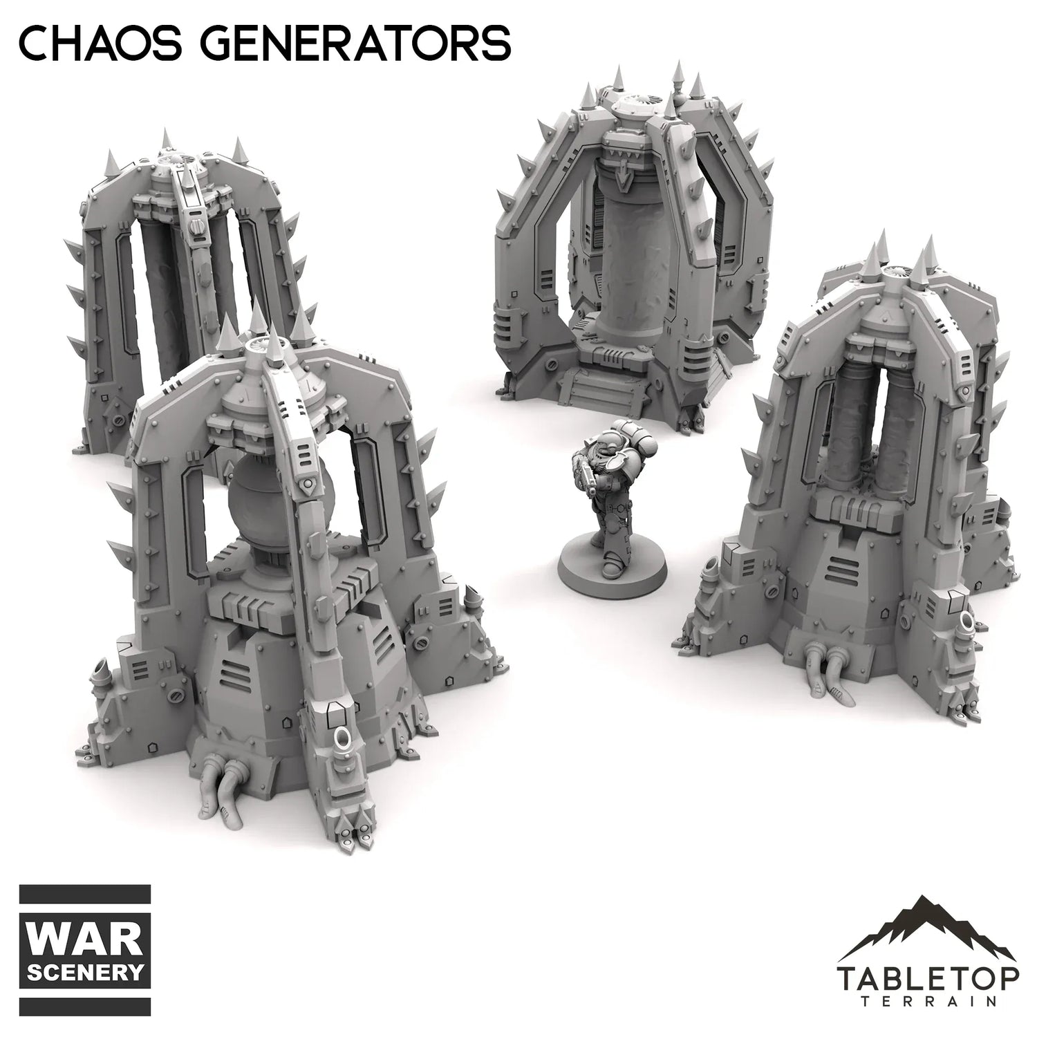 Chaos Generators set includes 4 different generators each with their own style of power. The generators themselves are roughly 2x the size of a marine in power armor. This set is from the Corrupted Sanctum collection, and matches other sets from that collection. It is designed for sci-fi wargames, but can be used with any system.