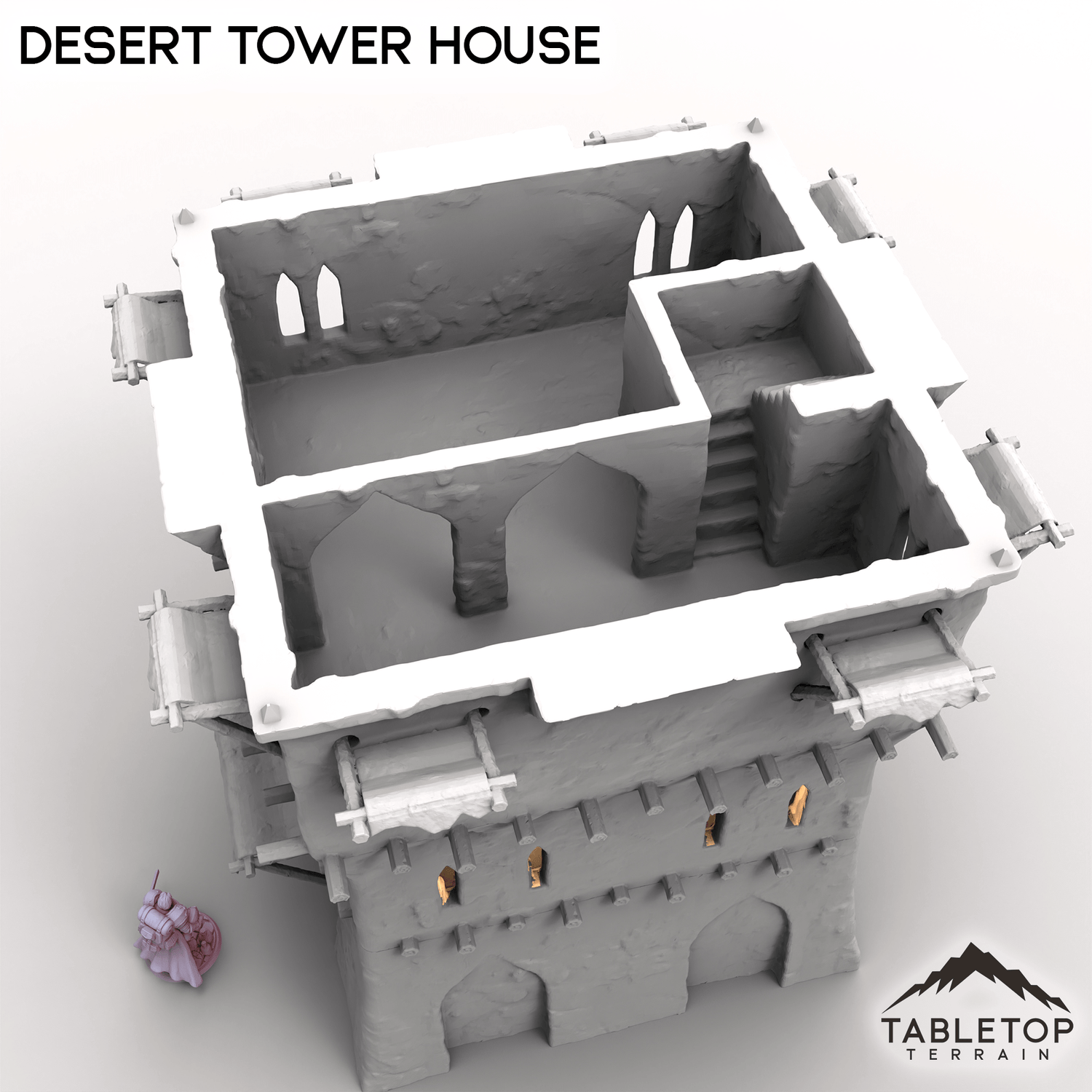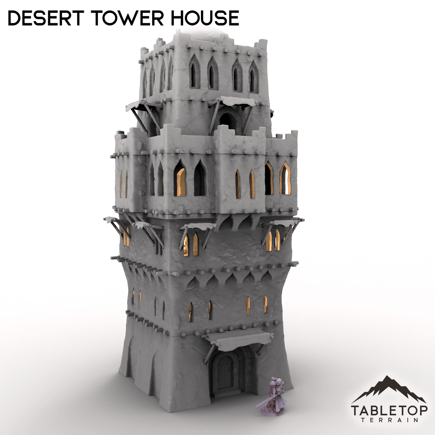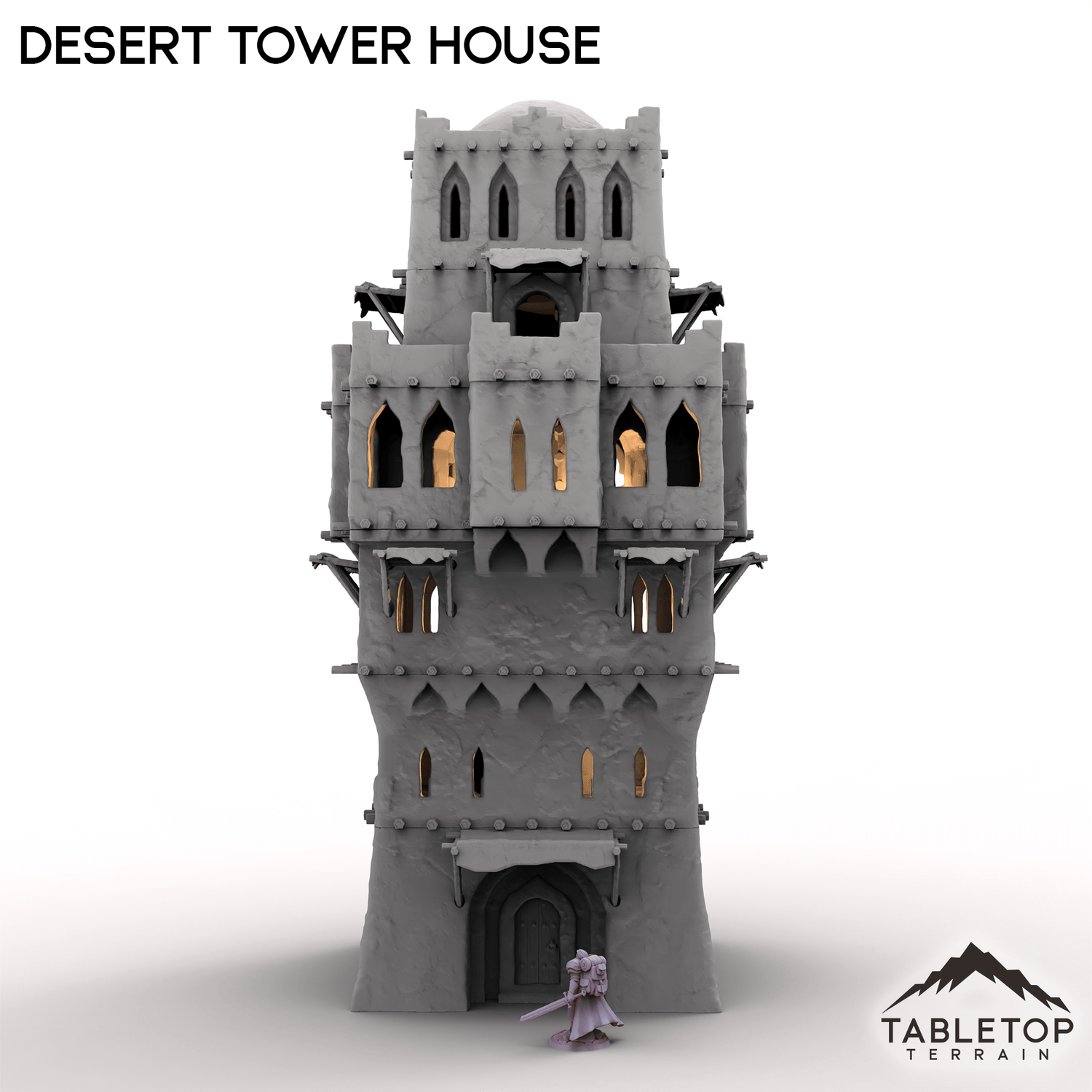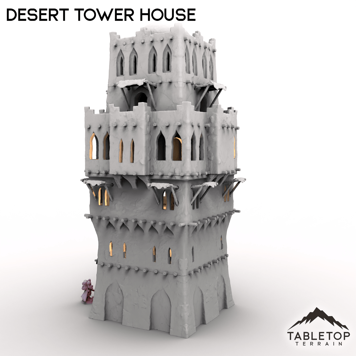 The Desert Tower House features smooth, sandy walls and rounded, weathered edges shaped by sun and time. Narrow arching windows hint at Middle Eastern architectural roots. Great for scenarios ranging from historical fantasy to sci fi settings.