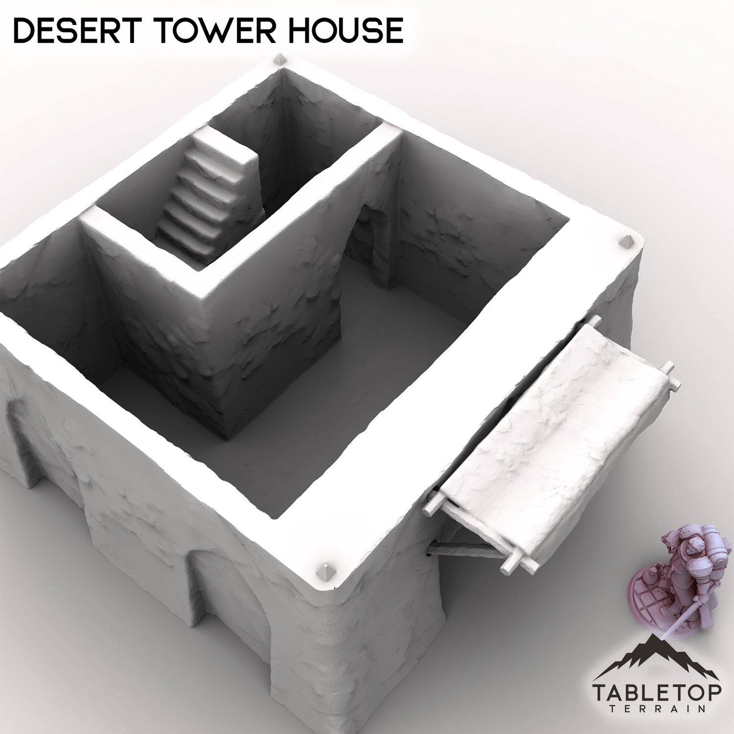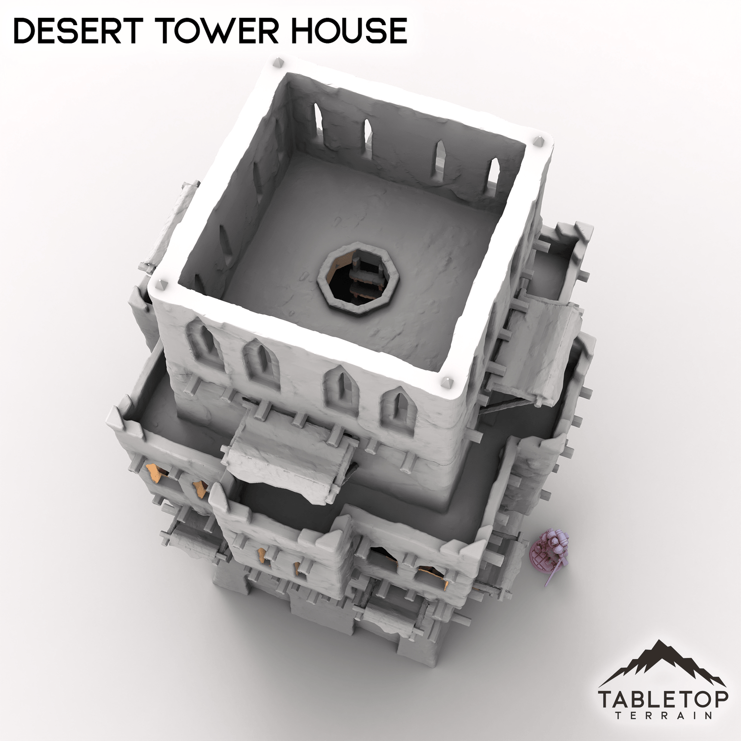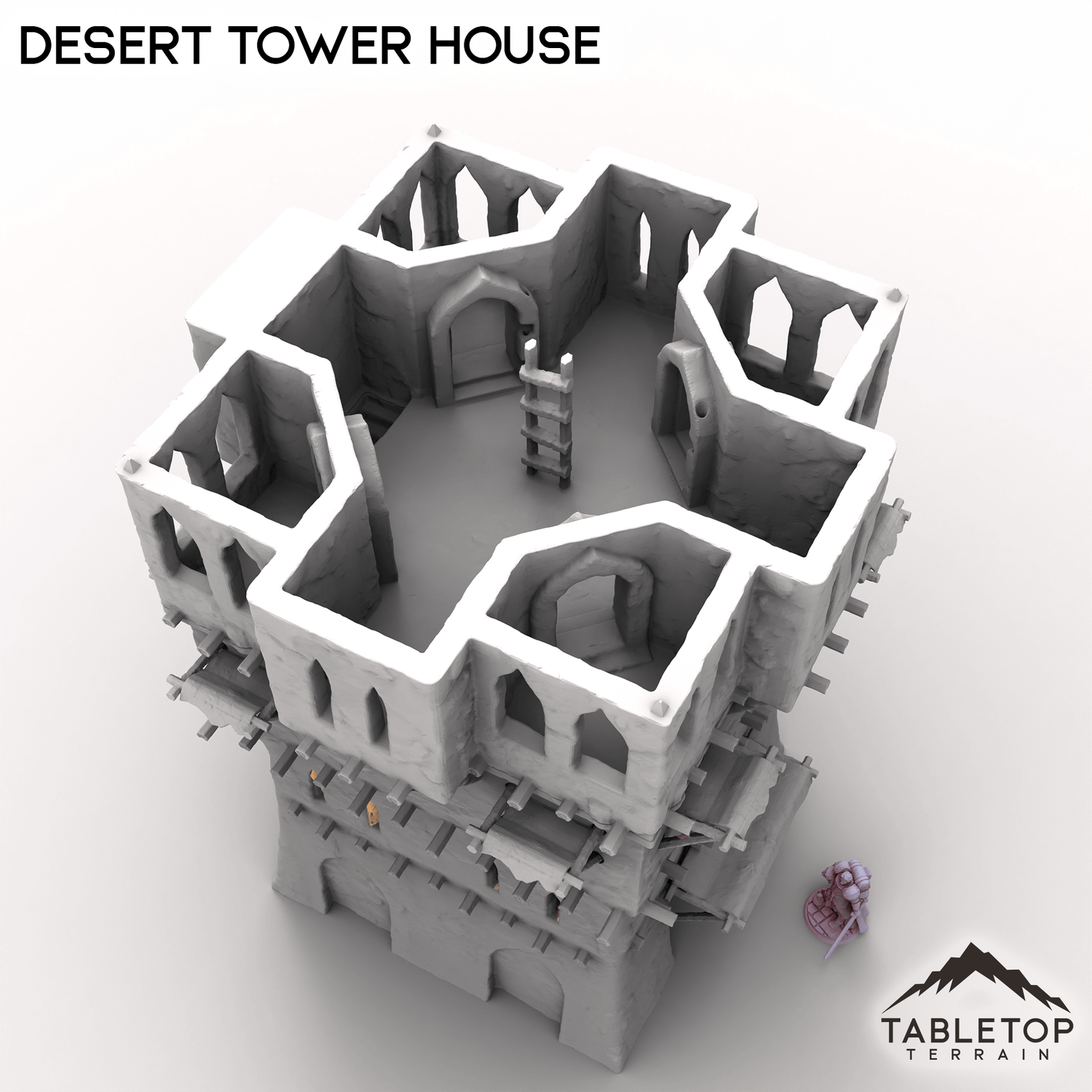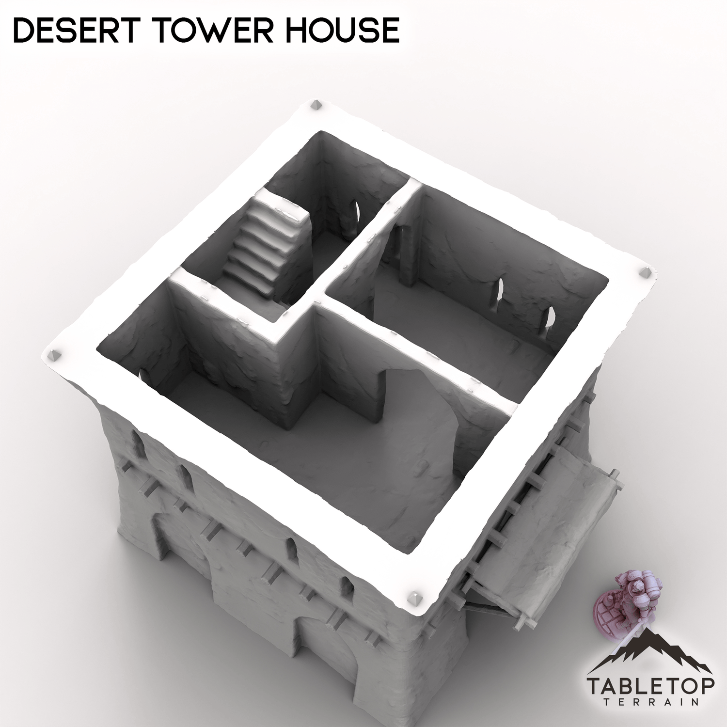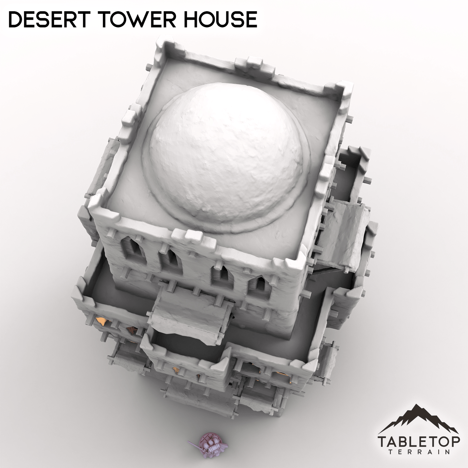 The Desert Tower House features smooth, sandy walls and rounded, weathered edges shaped by sun and time. Narrow arching windows hint at Middle Eastern architectural roots. Great for scenarios ranging from historical fantasy to sci fi settings.