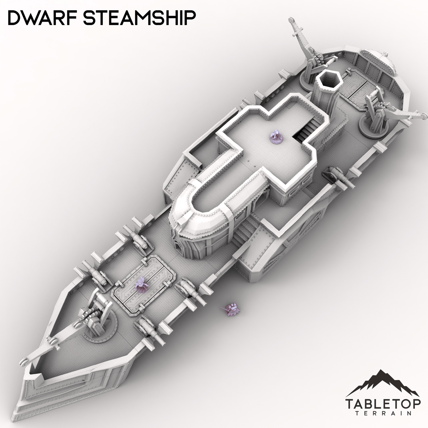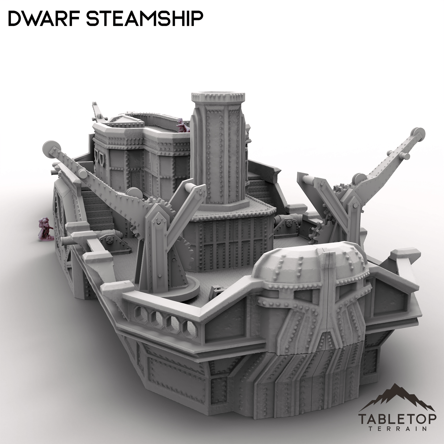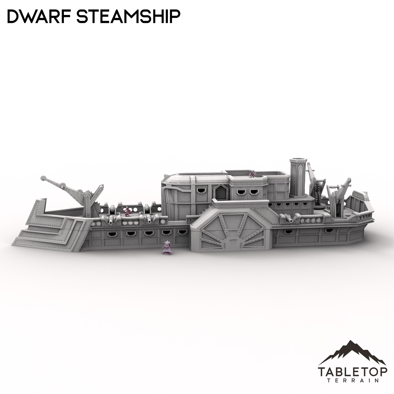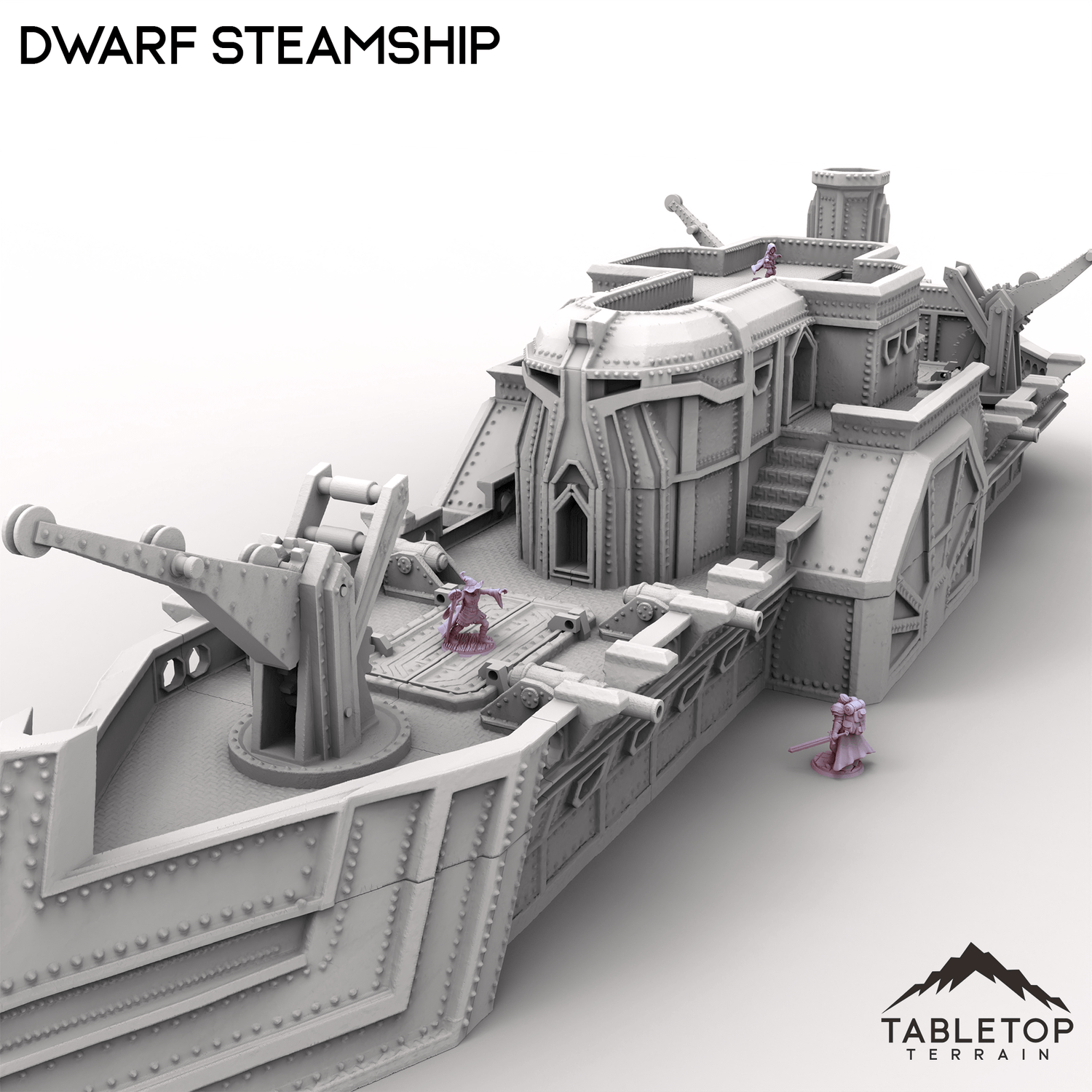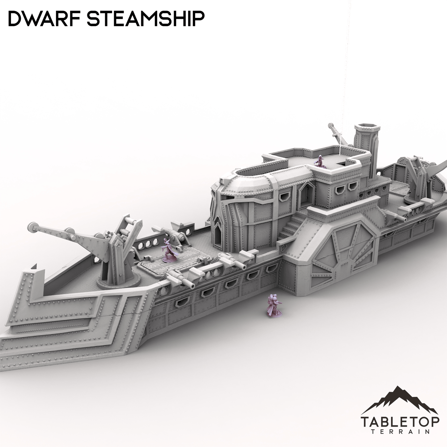 The Dwarf Steam Ship is a squat, heavily armored ship bristling with long-barreled deck guns and reinforced steel plating. Paddle wheels churn alongside its riveted hull, while smoke stacks belch black clouds into the sky. Built for both war and trade, its compact form and mechanical might make it a floating fortress of industry.