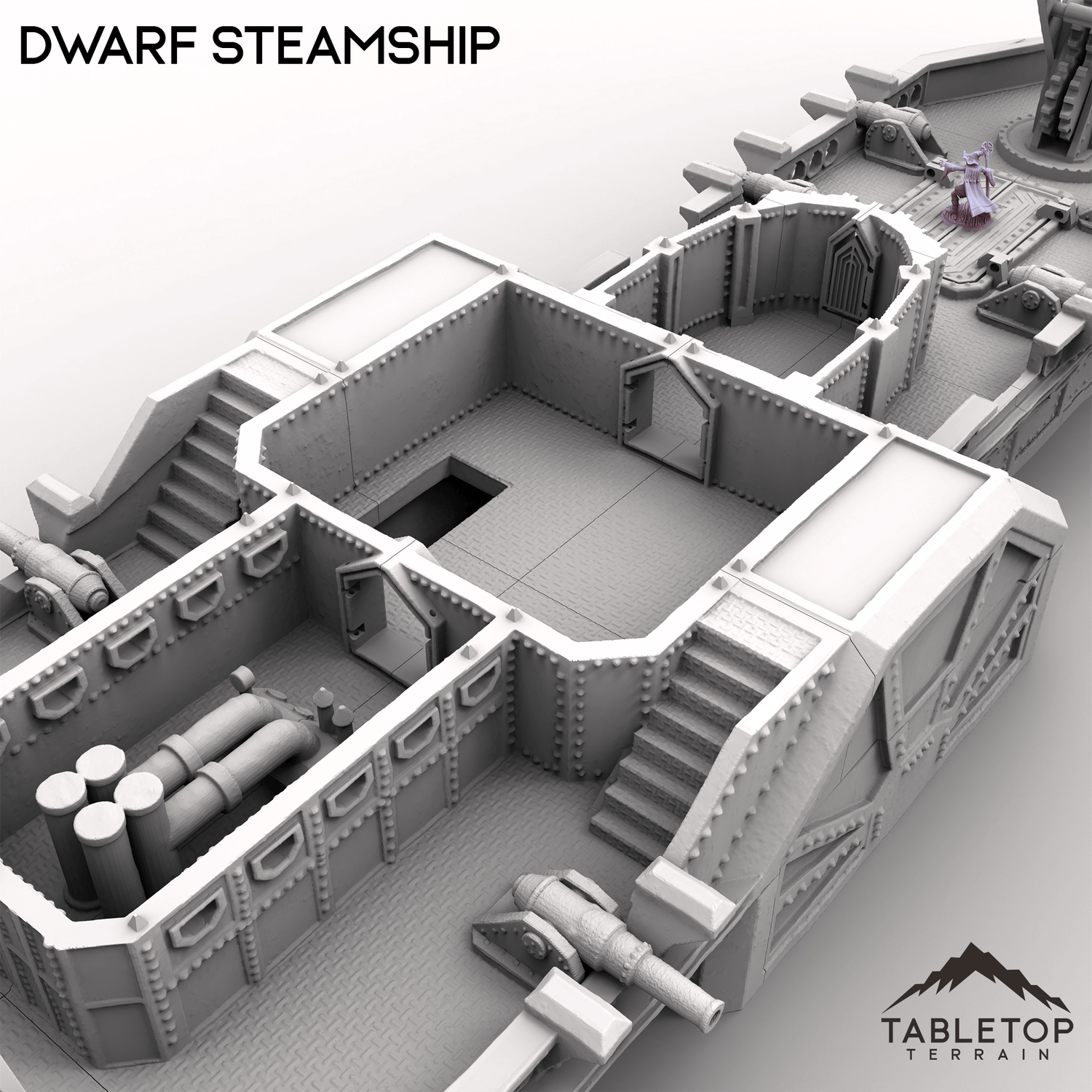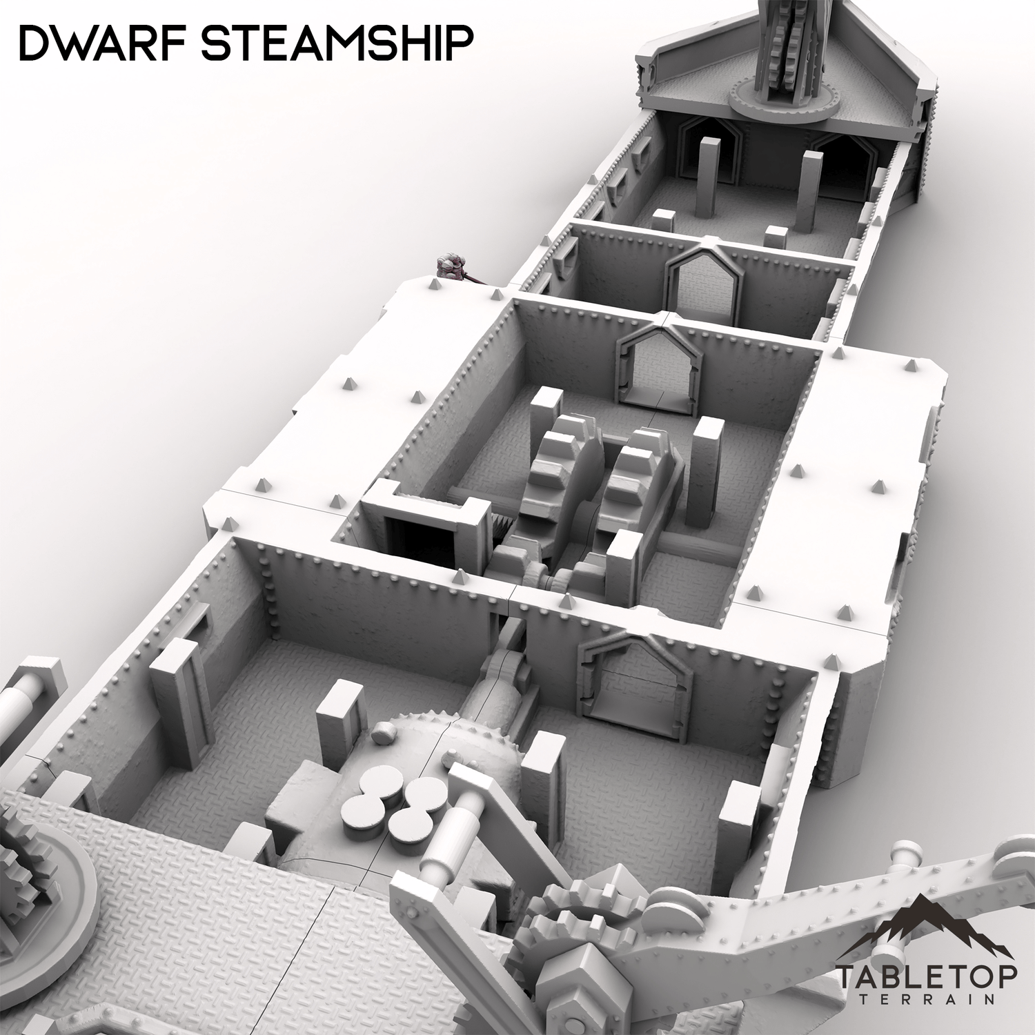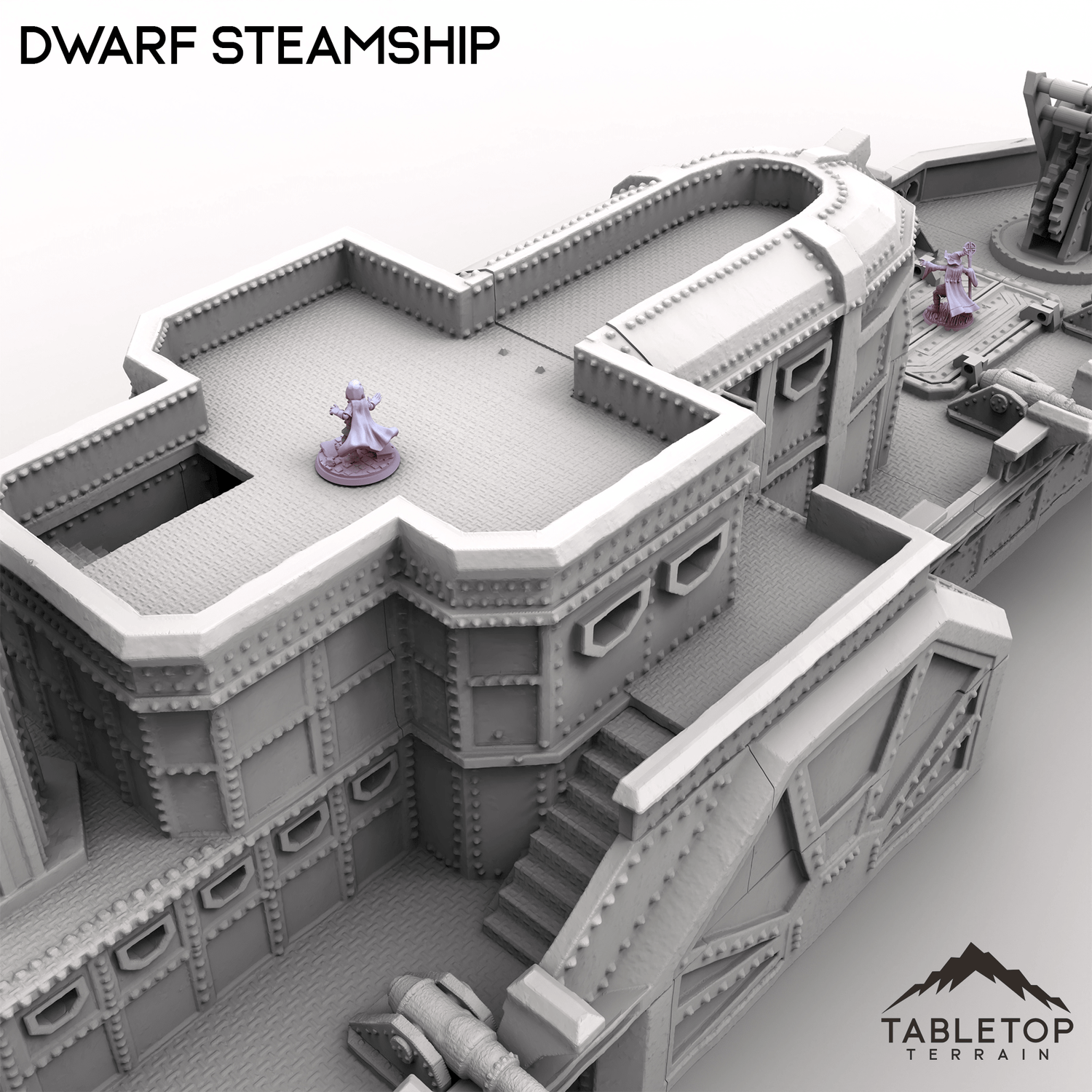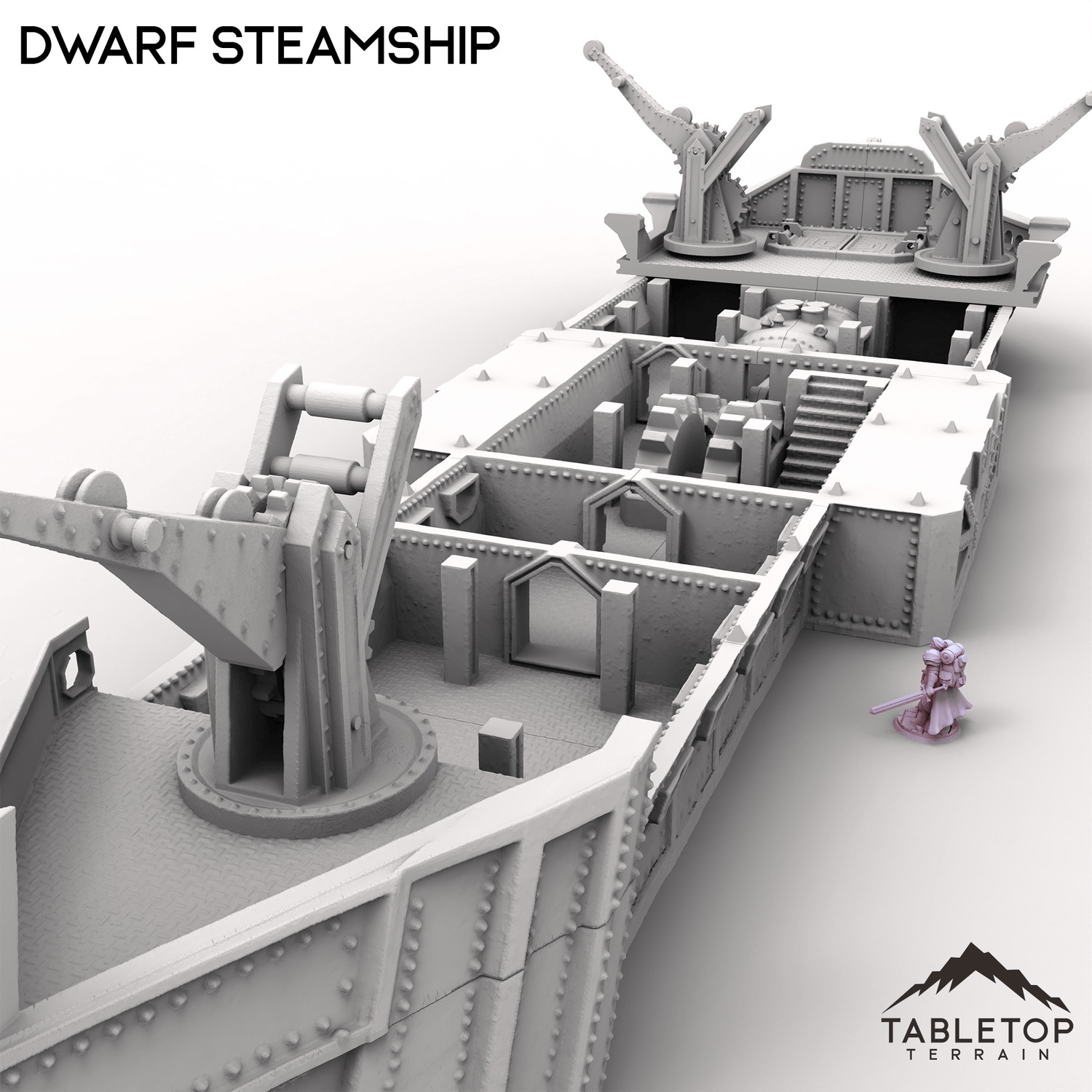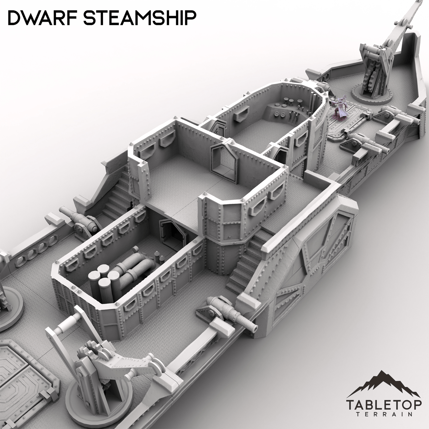 The Dwarf Steam Ship is a squat, heavily armored ship bristling with long-barreled deck guns and reinforced steel plating. Paddle wheels churn alongside its riveted hull, while smoke stacks belch black clouds into the sky. Built for both war and trade, its compact form and mechanical might make it a floating fortress of industry.