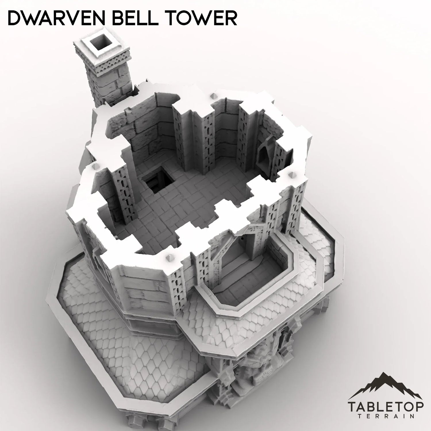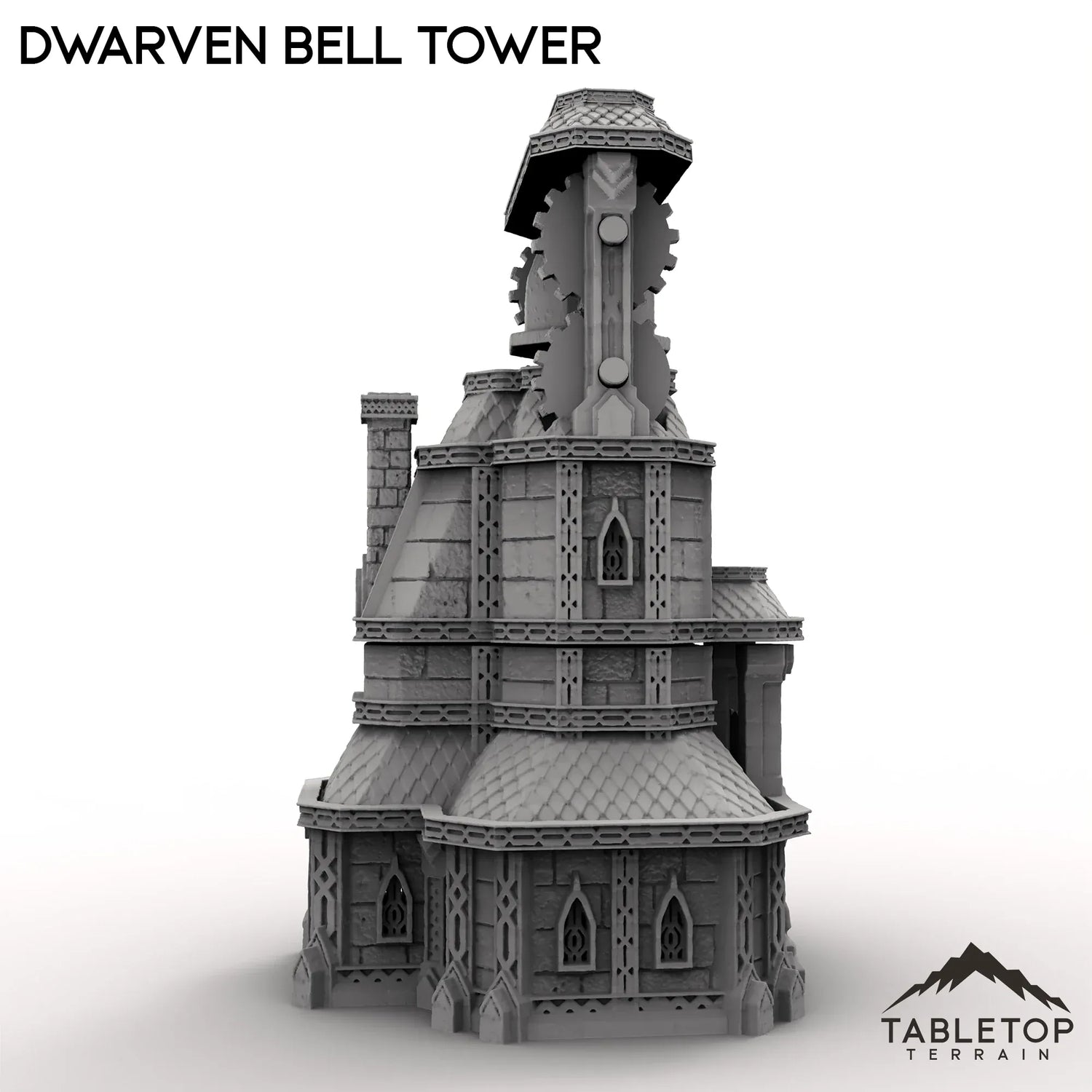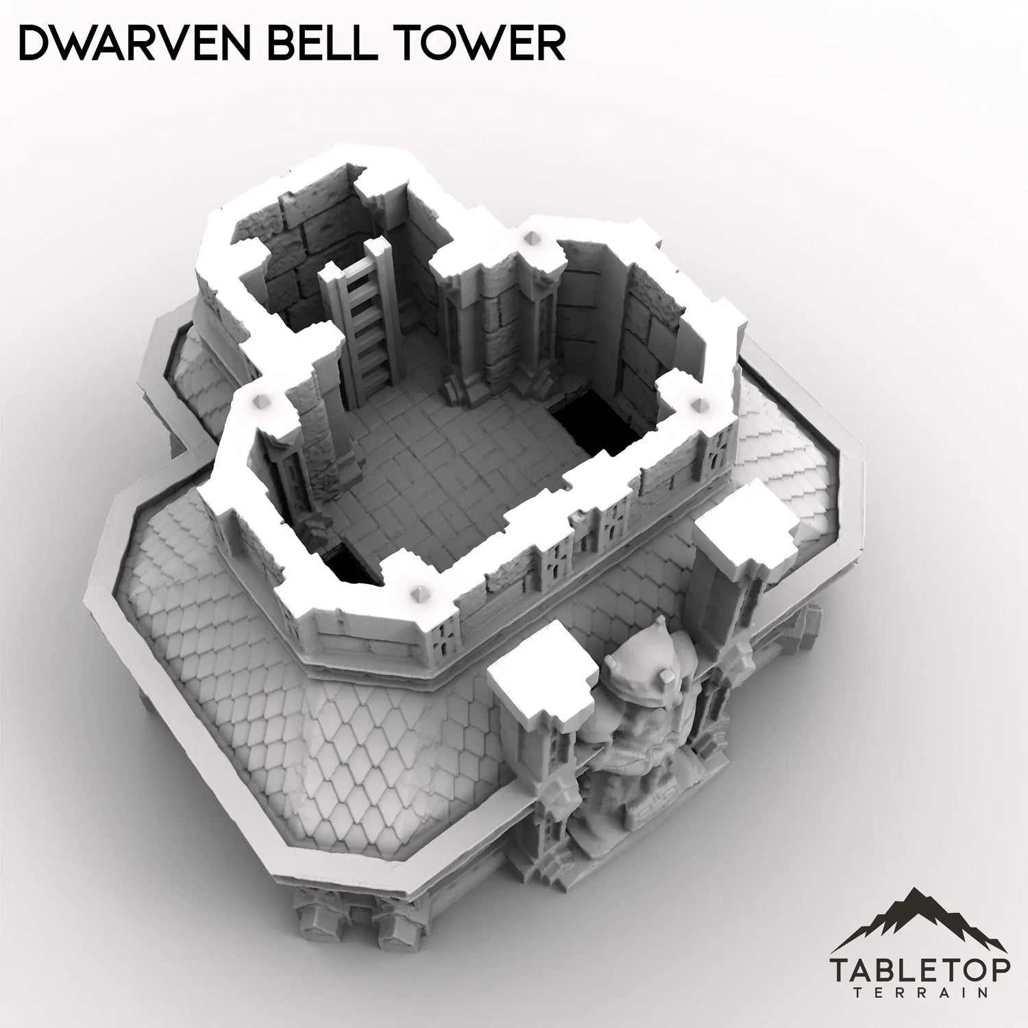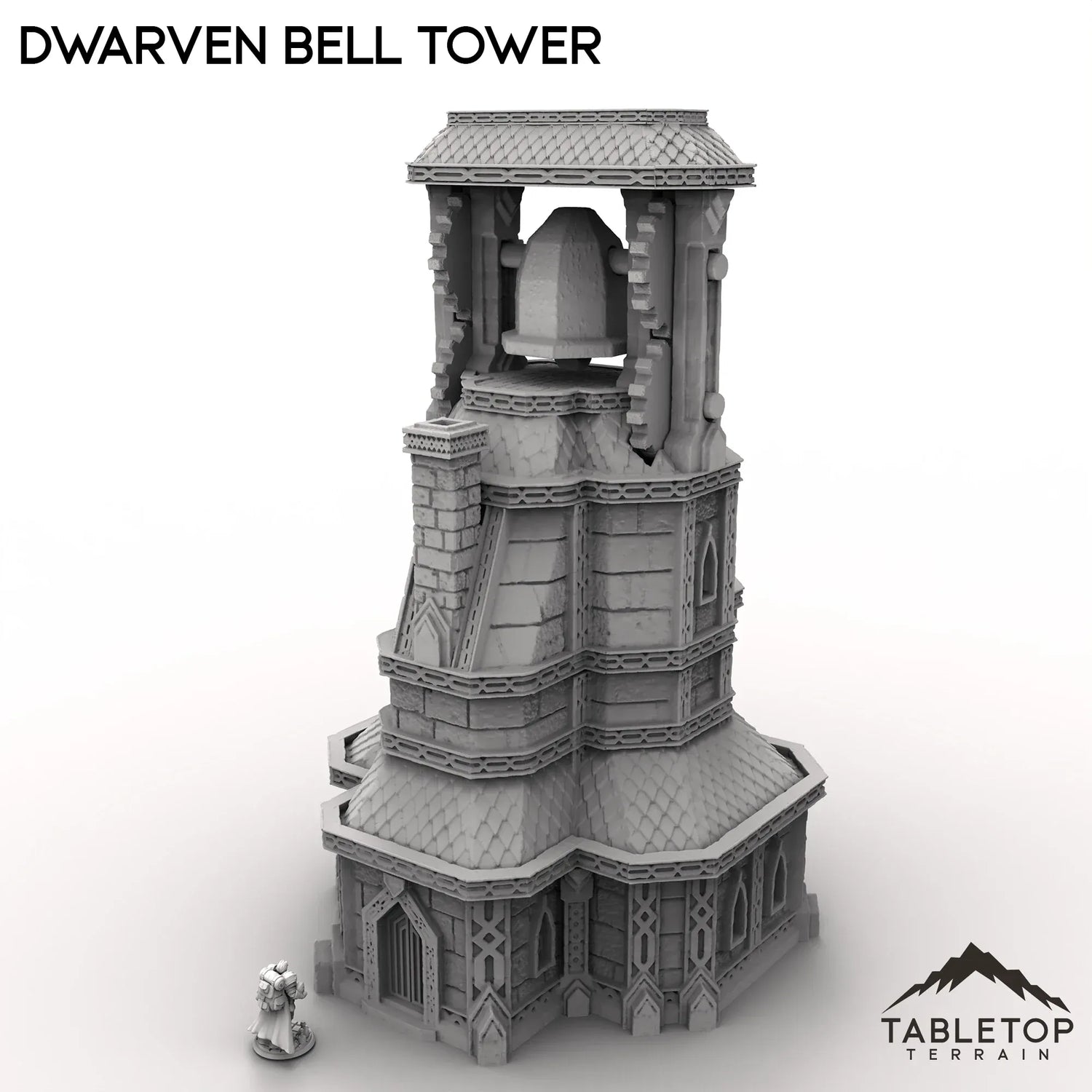 A towering sight in the center of the mining town, the Dwarven Bell Tower is a mechanical twist on the classic structure. Featuring an open multi story interior for minis, and a moving gears for the bell itself, this set matches nicely for any tabletop dwarven layout.
