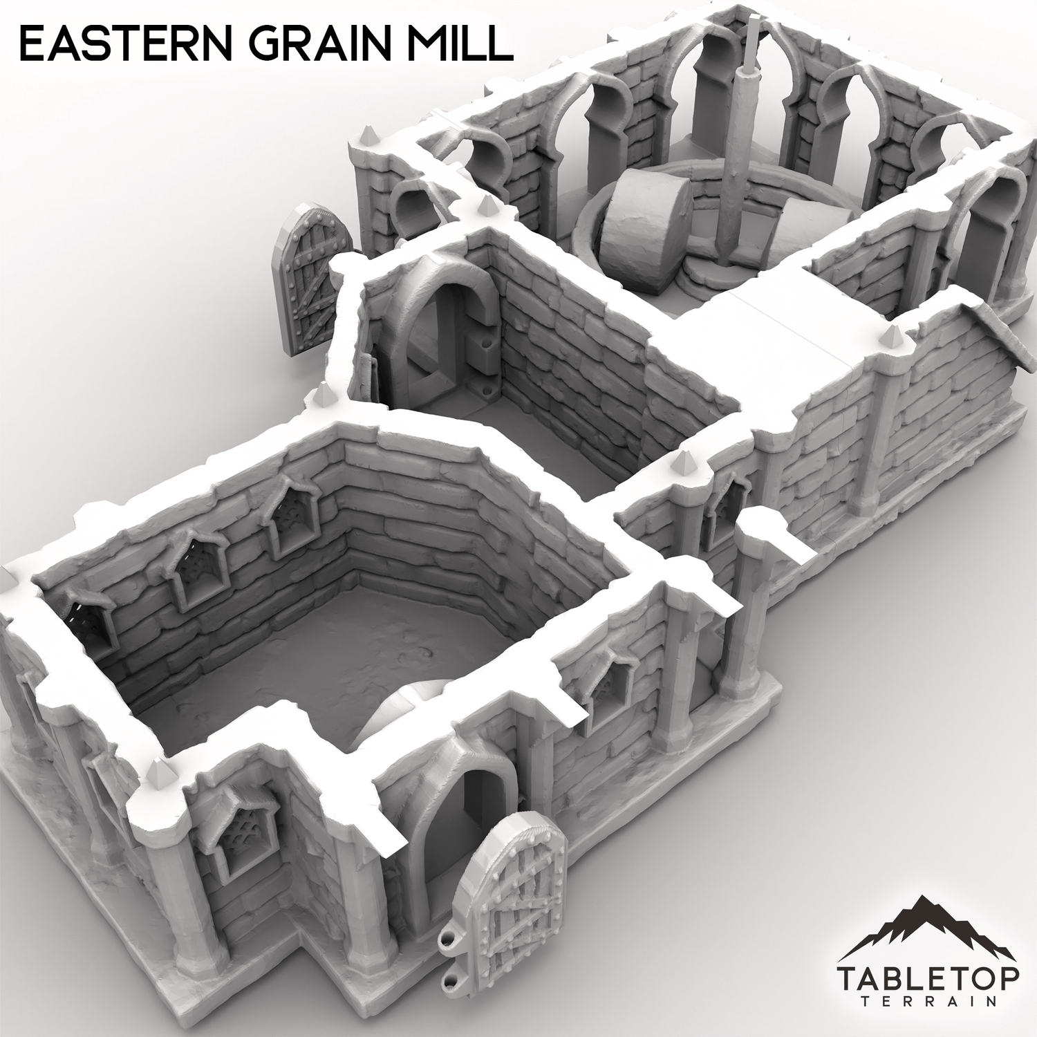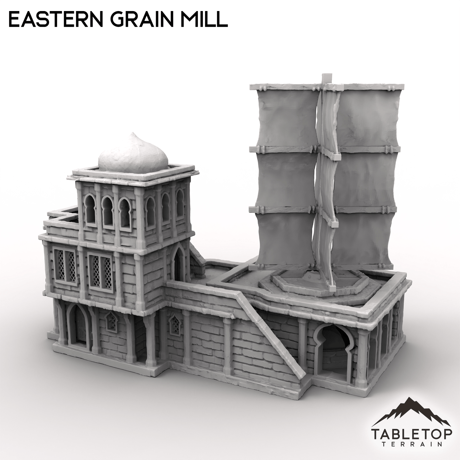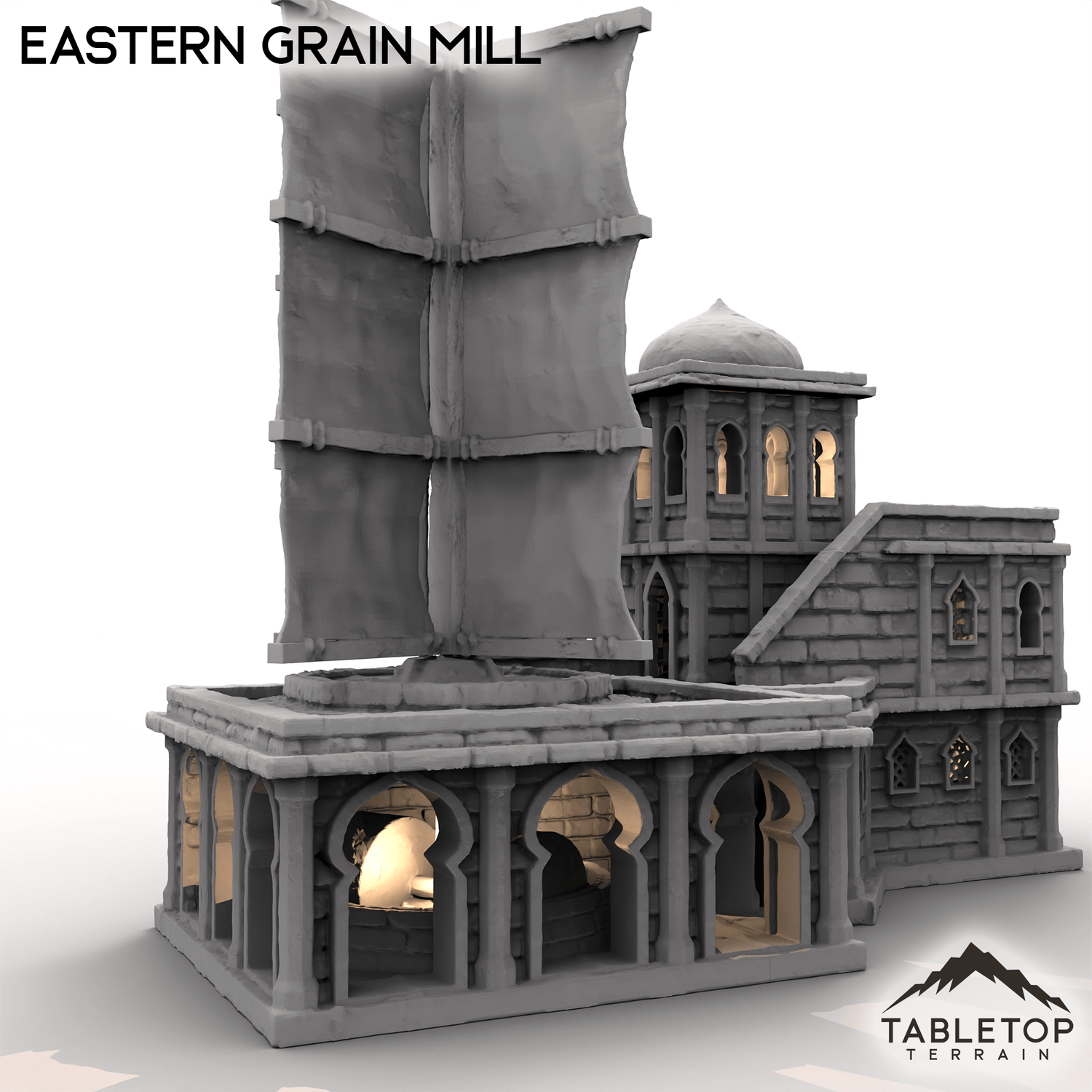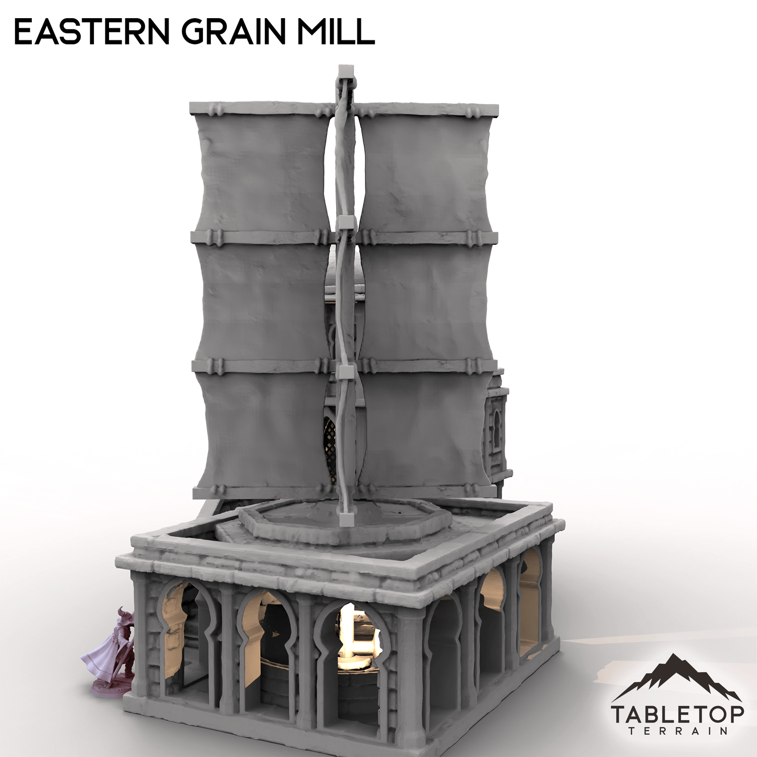 Eastern Grain Mill is a detailed wind-powered mill with an eastern-style dome and arched windows. The big sails turn to grind grain, making it perfect for adding character to your tabletop town. his set features a fully-functional millstone, spun by connecting it to the wind sails above. When attached correctly, spinning the sail by hand will also move the millstone in its track.